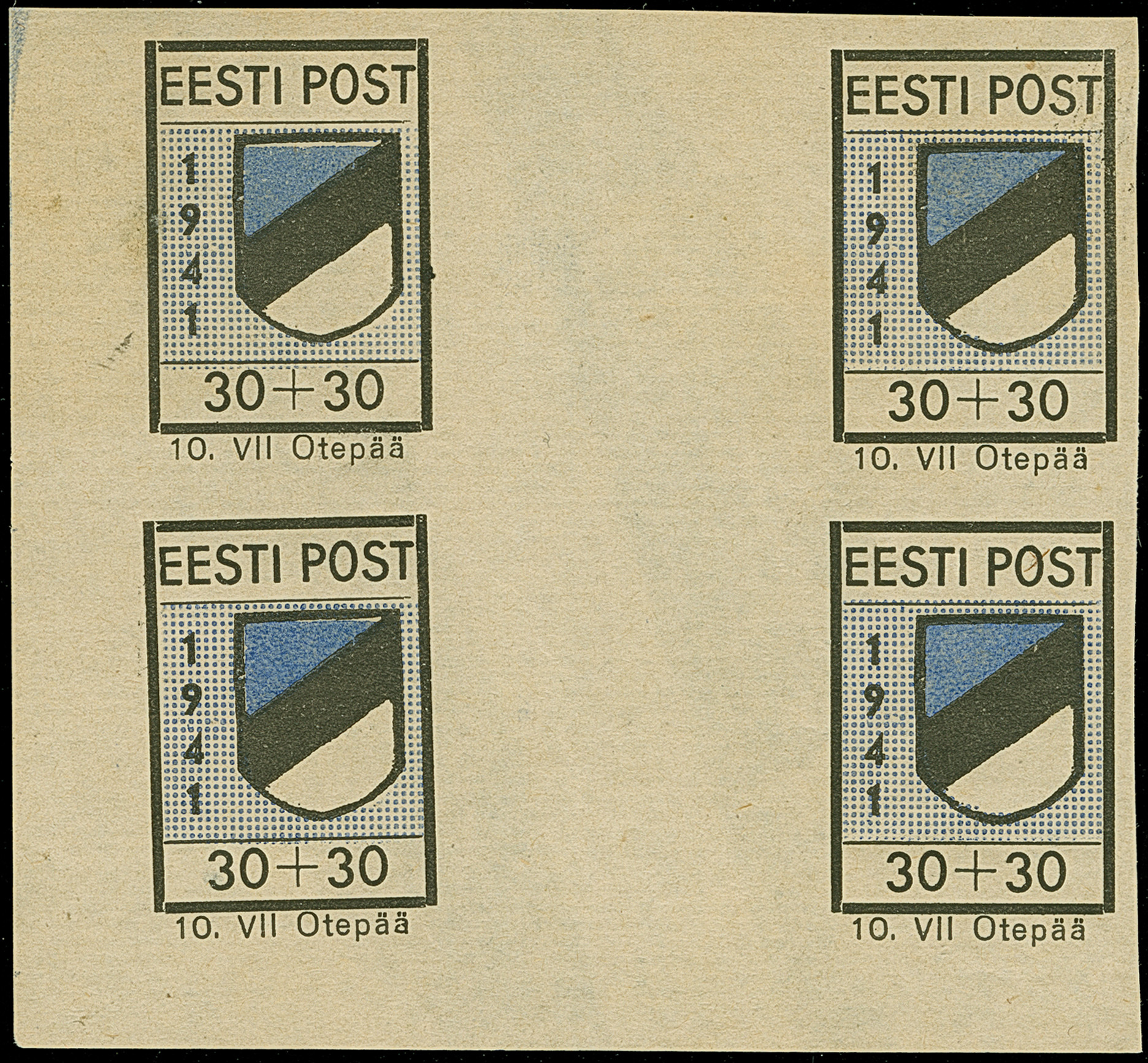 1941, Wappenschild 30 Kopeken, geschnitten, Type II, Viererblock aus der rechten oberen Bogenecke, die rechte obere Marke mit fehlendem Schwarzdruck, ohne Gummi, tadellos. Laut Fotoattest Krischke BPP handelt es sich um einen Probedruck. Eine Differenzierung ungezähnter Probedrucke zwischen der 3. und 4. Druckperiode ist aufgrund fehlender Typenunterschiede nicht möglich; ein hochinteressantes Stück, Fotoattest Krischke BPP (1986)