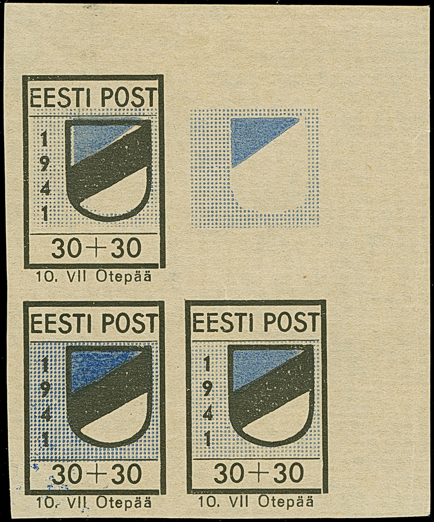 1941, Wappenschild 30 Kopeken, geschnitten, Type I, Probedruck-Viererblock aus der rechten oberen Bogenecke, die rechte obere Marke mit fehlendem Schwarzdruck, vorderseitig leichte Druckverschmierungen der blauen Farbe, ohne Gummi, tadellos, eine sehr seltene und dekorative Einheit, unsigniert mit Fotoattest Krischke BPP (1986)