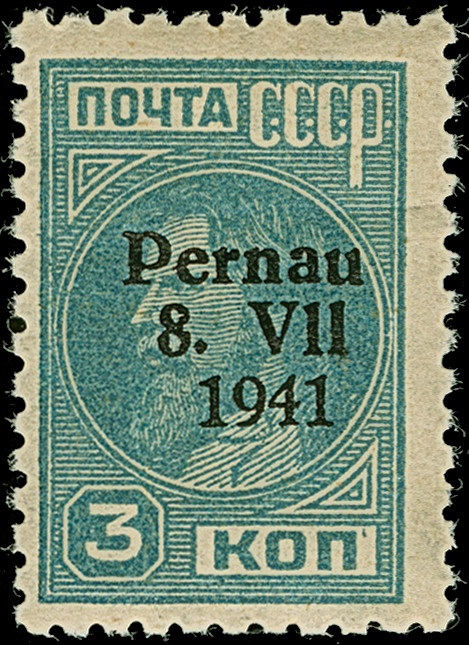 1941, 3 Kopeken dunkelgrünlichblau, gezähnt, mit Aufdruckfehler “9 in 1941 größer und 41 mager", sauber ungebraucht, eine seltene Marke, sign. und Kurzbefund Klein (2005) sowie Fotoattest Krischke BPP (1998)