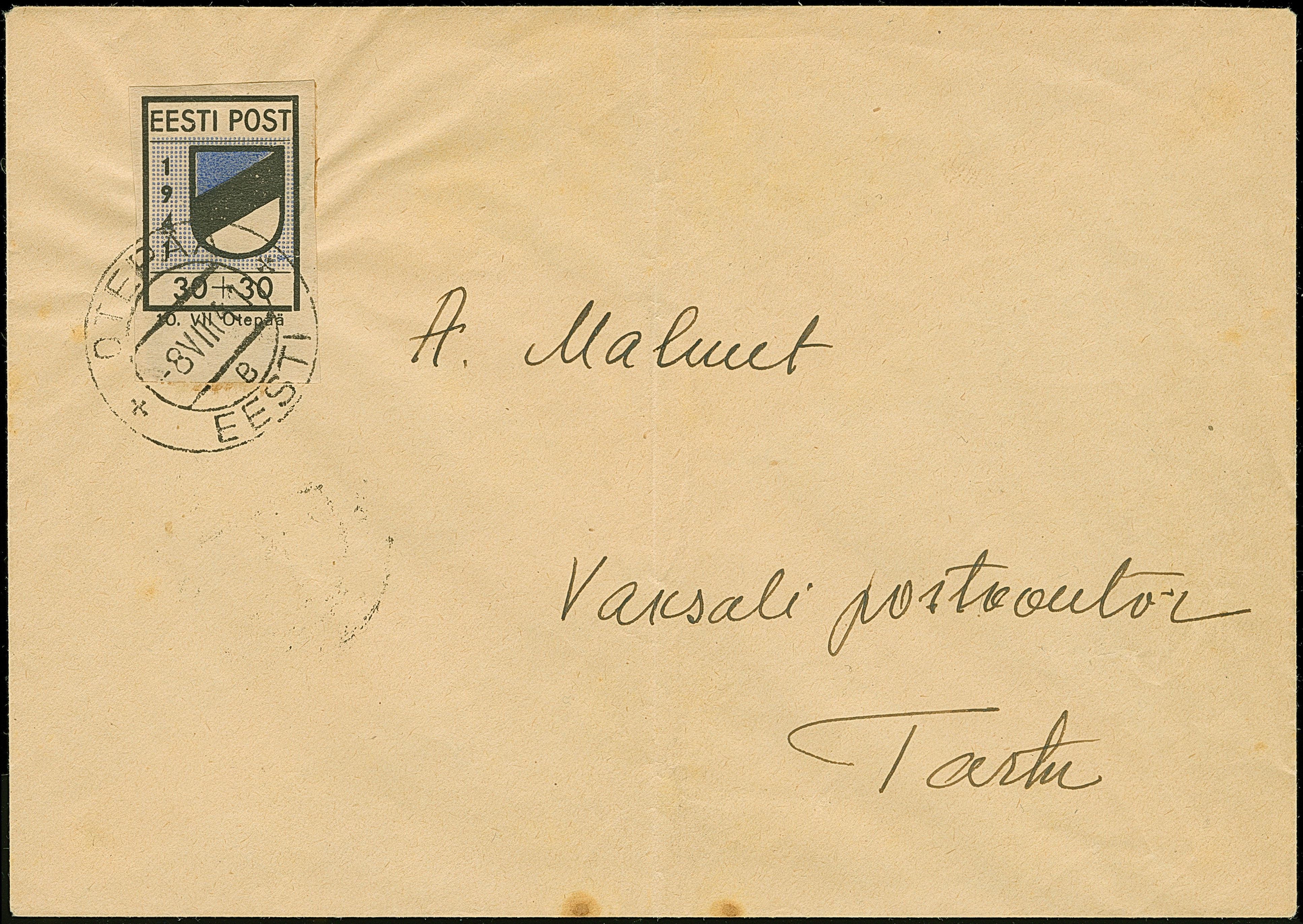 1941, Wappenschild 30 Kopeken, geschnitten, Type II, sauber mit Stempel “OTEPÄÄ -8 VIII 41” auf Brief nach Tartu mit Ankunftsstempel, etwas, meist rückseitig, fleckig, sonst tadellos
