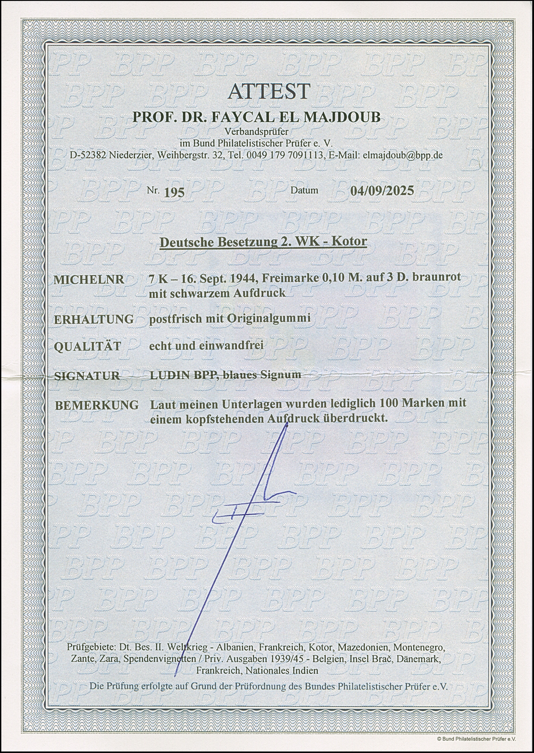 1944, Neue Währung, 0,10 M. mit kopfstehendem Aufdruck, postfrisch in einwandfreier Erhaltung. Signiert Ludin BPP und Fotoattest Prof. El Majdoub BPP (2025)