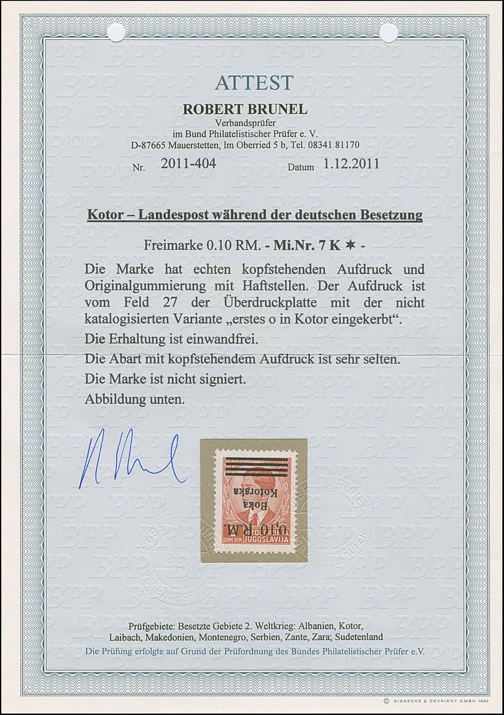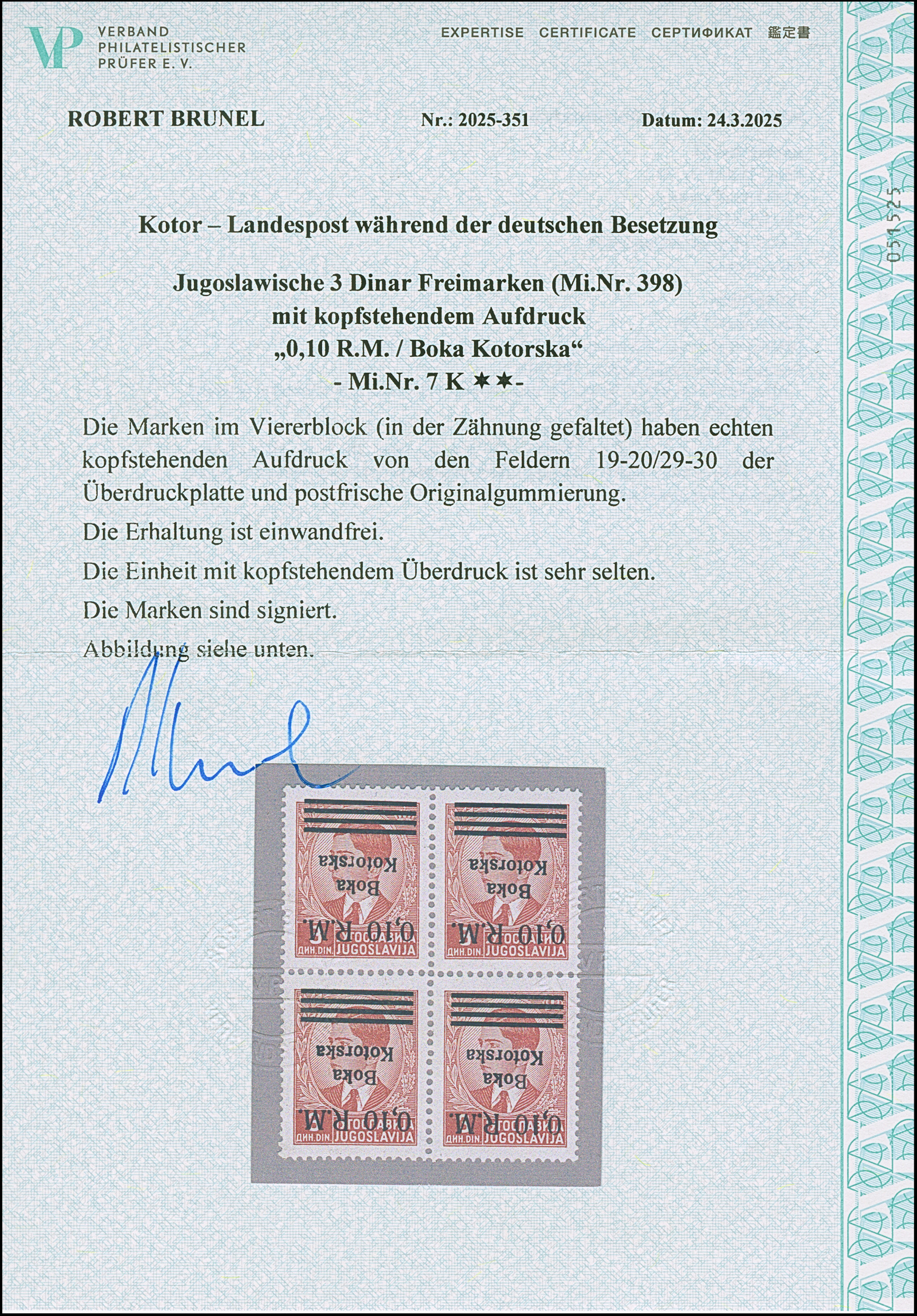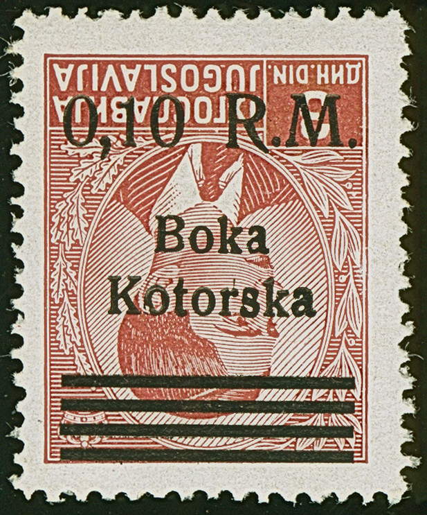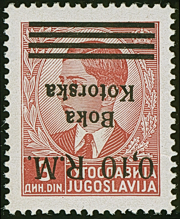 1944, Freimarke 0,10M. auf 3 Dinar lebhaftbraunrot, mit kopfstehendem Aufdruck von Aufdruckfeld 27 mit Aufdruckfehler “erstes o in Kotor eingekerbt”, sauber ungebraucht, tadellos, selten, Fotoattest Brunel BPP (2011)