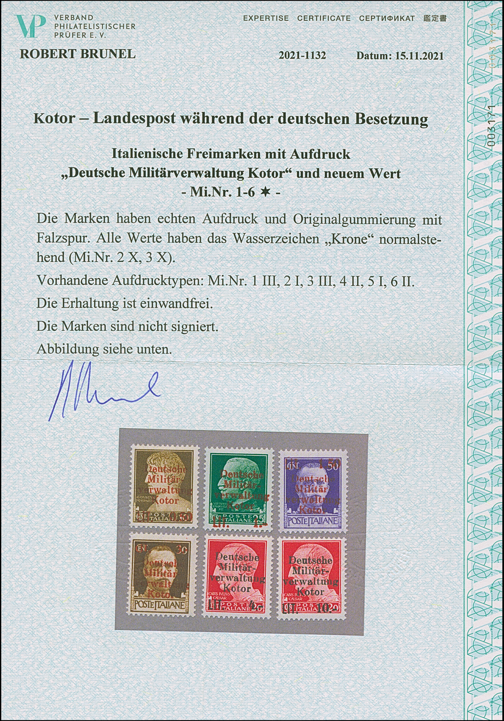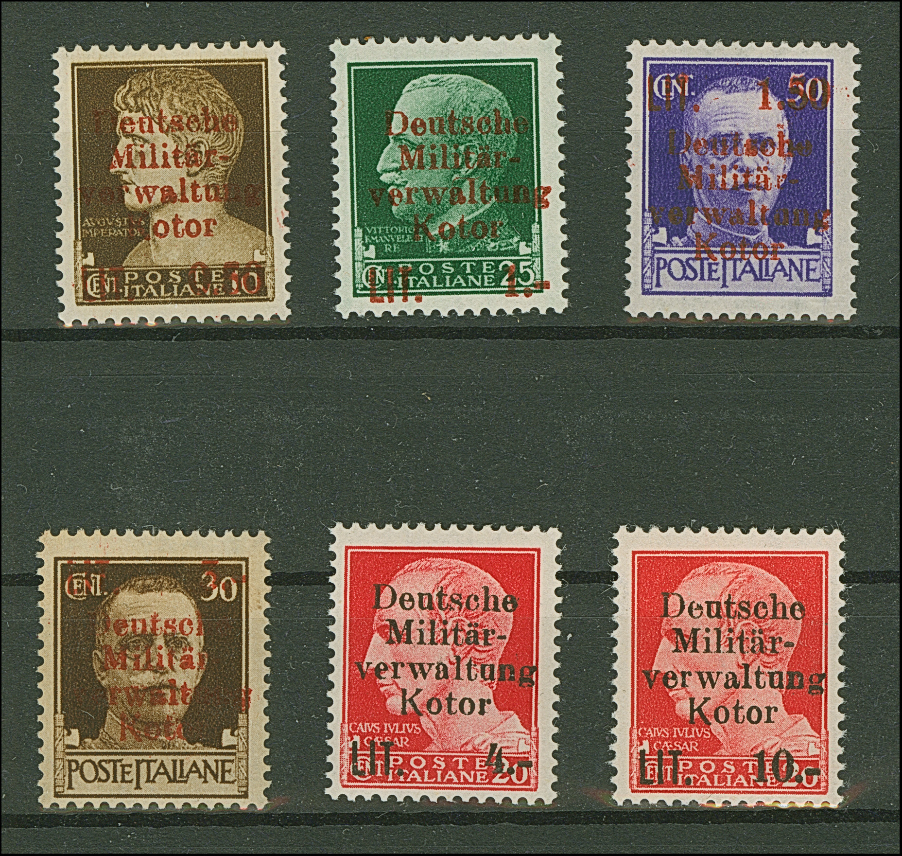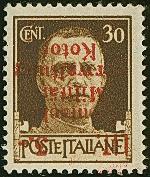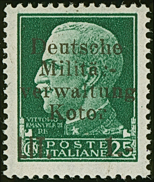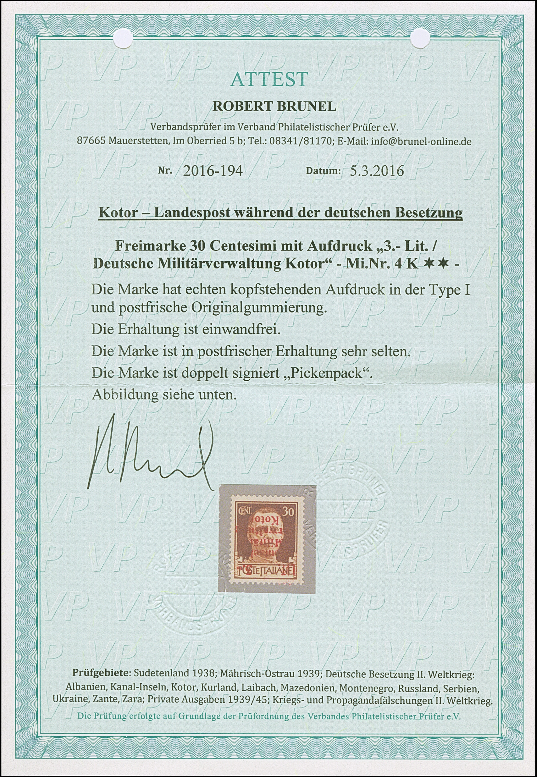 1944, Freimarke 0,10M. auf 3 Dinar lebhaftbraunrot, mit kopfstehendem Aufdruck von Aufdruckfeld 27 mit Aufdruckfehler “erstes o in Kotor eingekerbt”, sauber ungebraucht, tadellos, selten, Fotoattest Brunel BPP (2011)