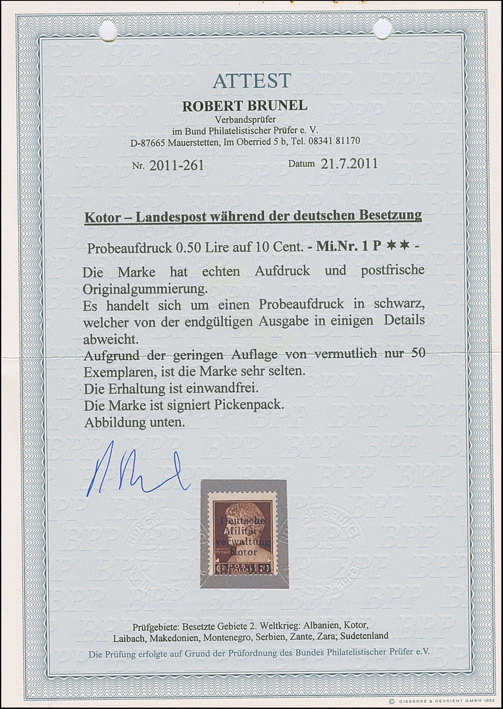 1944, Freimarke 0,50 Lire auf 10 Centisimi schwärzlichbraun, mit schwarzem Probeaufdruck, postfrisch, tadellos, sehr selten, sign. Pickenpack und Fotoattest Brunel BPP (2011)