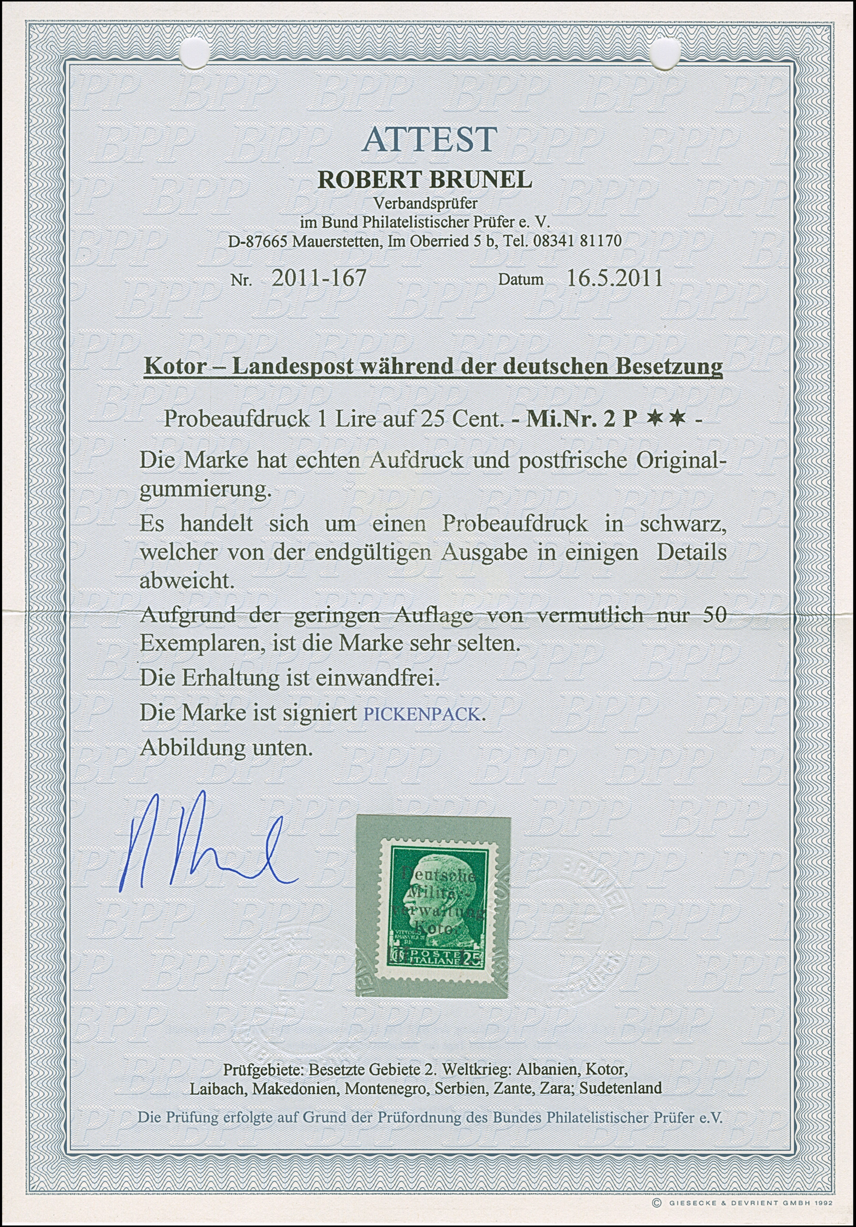 1944, Freimarke 1 Lire auf 25 Centisimi schwarzgrün, mit schwarzem Probeaufdruck, postfrisch, tadellos, sehr selten, sign. Pickenpack und Fotoattest Brunel BPP (2011)