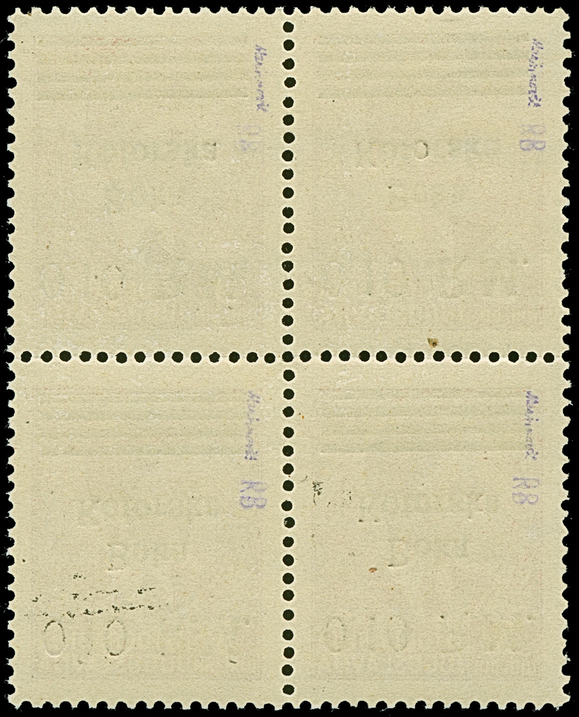 1944, 0,10 M. mit kopfstehendem Aufdruck, Viererblock von den Aufdruckfeldern 19-20 sowie 29-30, postfrisch, tadellos, teils etwas vorgefaltet, selten, sign. sowie Fotoattest Brunel (2025)