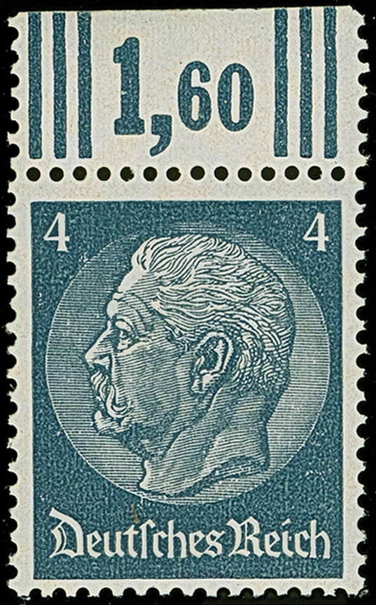1940, Hindenburg 4 Pfennig grauultramarin, Oberrandstück mit Aufdruck nur im Blinddruck, postfrisch, tadellos, heute aufgrund der Prüfproblematik im Michel nicht mehr gelistet, ein interessantes Stück, unsigniert mit Fotoattest Krischke (2003)