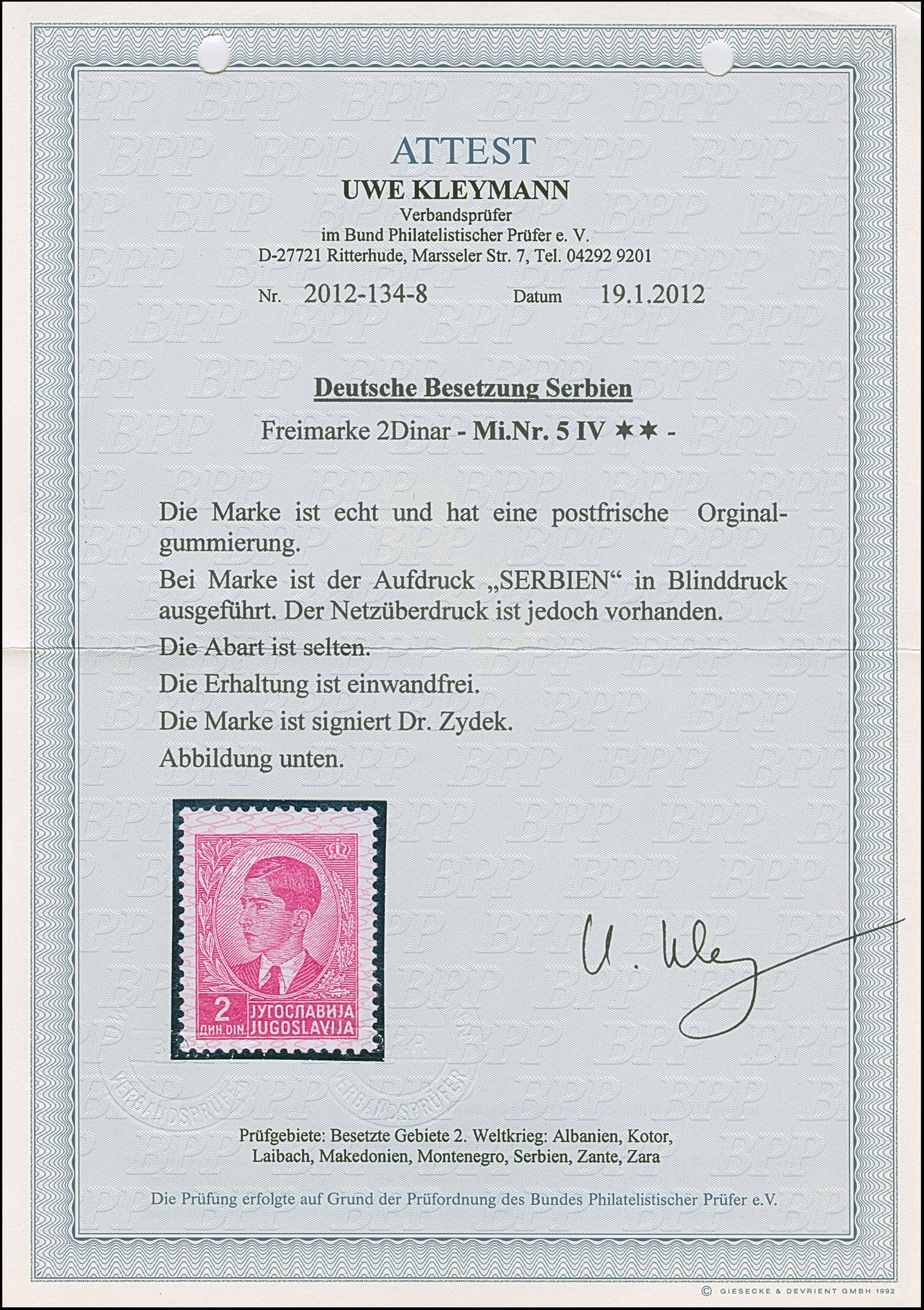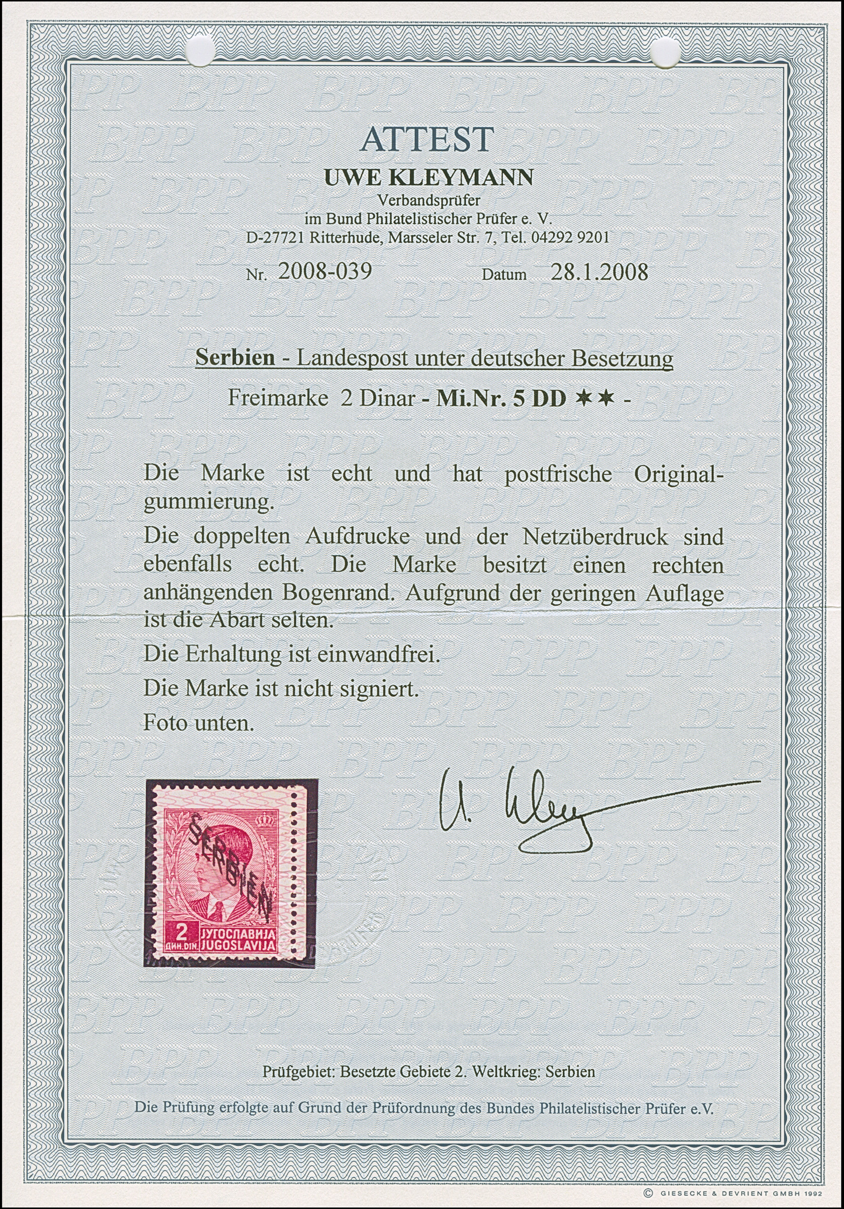 1941, 2 Dinar lilakarmin, mit helllilarosa Netzunterdruck und der Aufdruck “SERBIEN” nur im Blinddruck, postfrisch, tadellos, eine nicht häufige Marke, sign. Dr. Zydek sowie Fotoattest Kleymann BPP (2012)