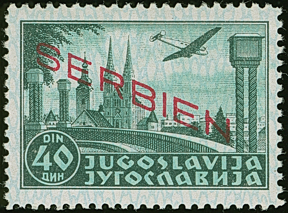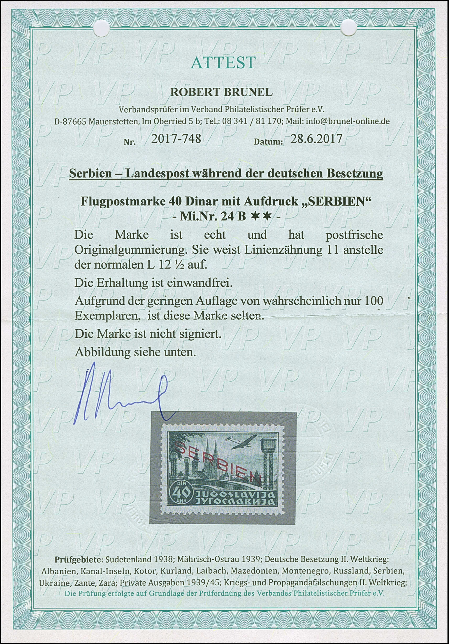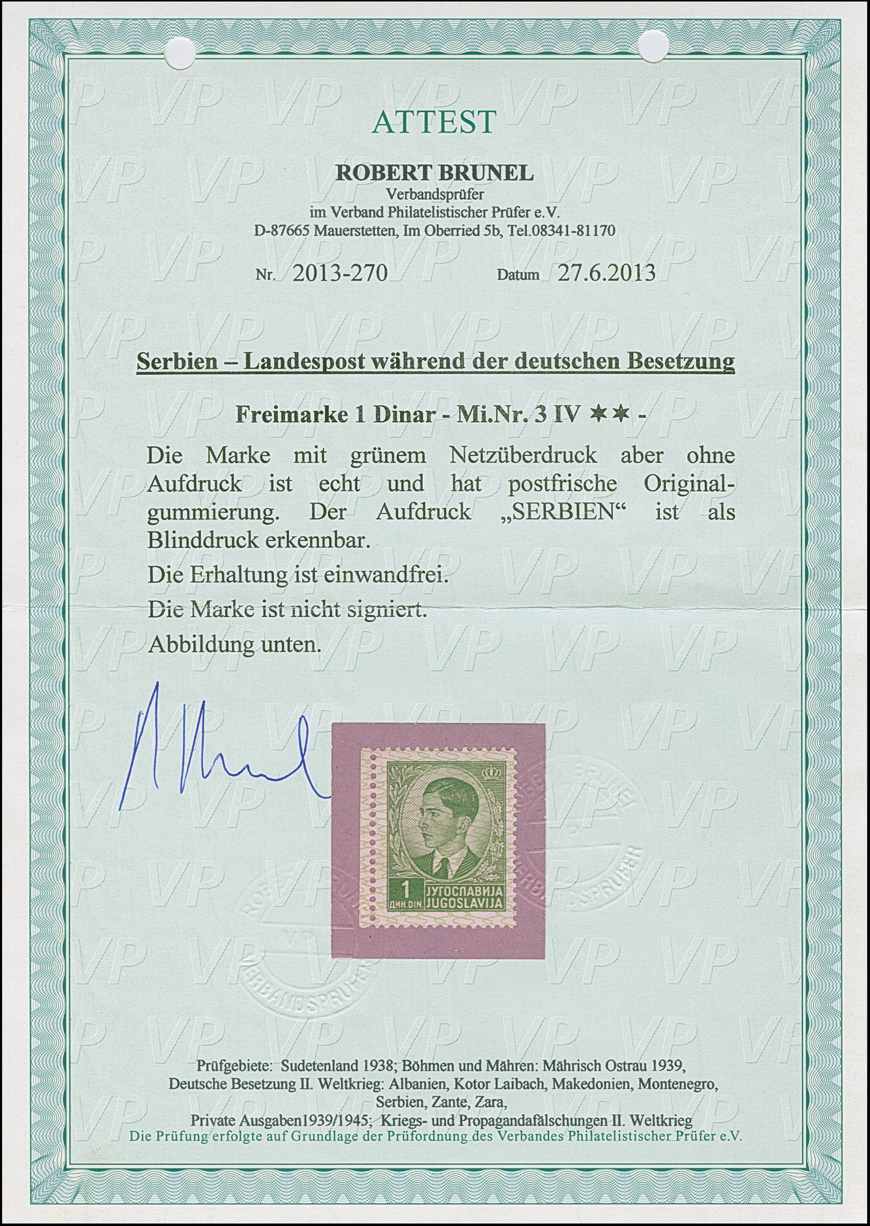 1941, 1 Dinar dunkelsmaragdgrün, mit grünem Netzunterdruck und der Aufdruck “SERBIEN” nur im Blinddruck, postfrisch, tadellos, eine nicht häufige Marke, unsigniert mit Fotoattest Brunel (2013)