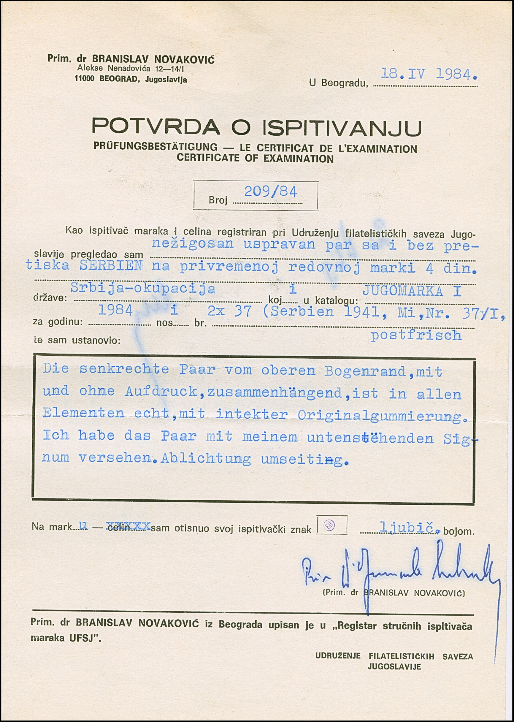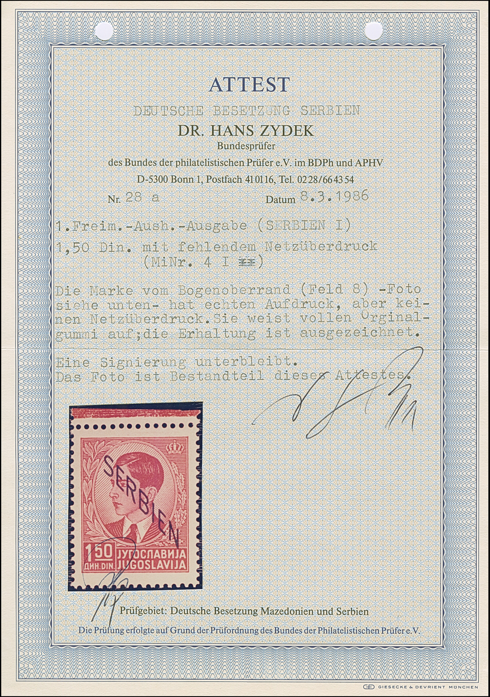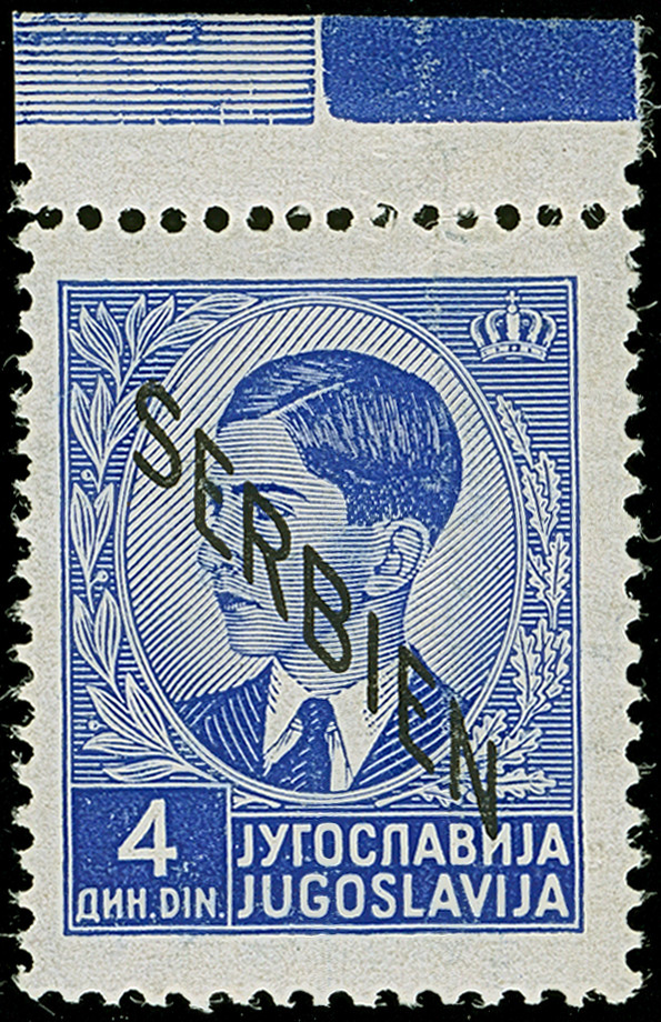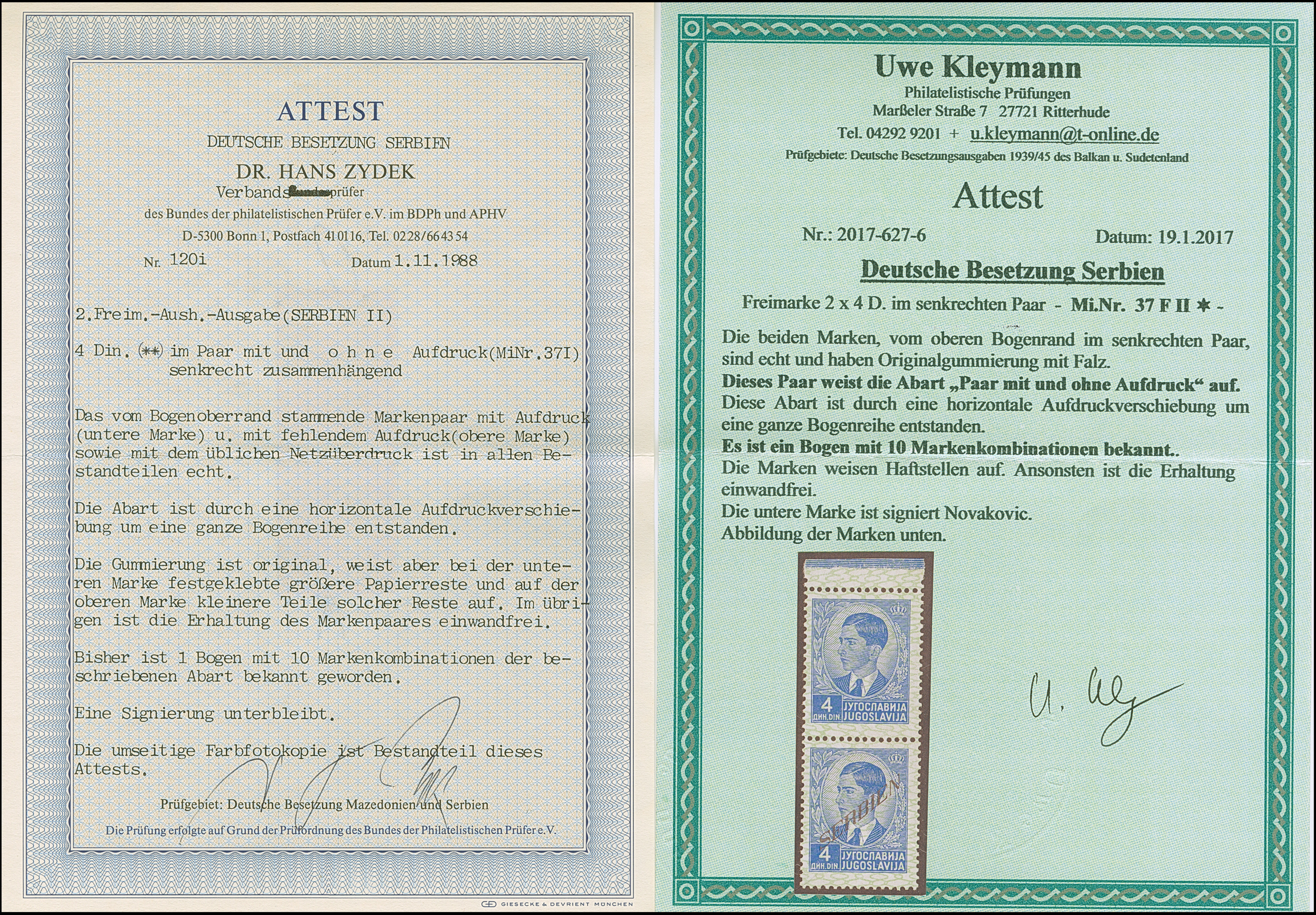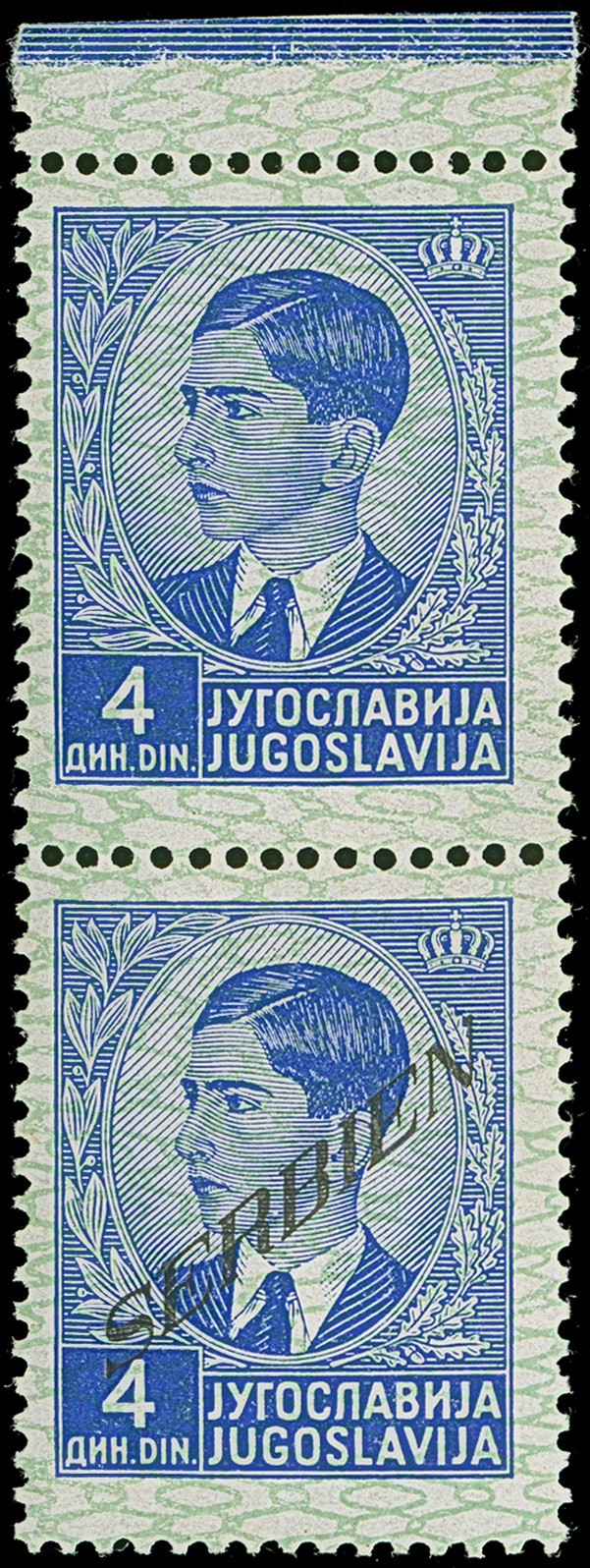 1941, König Peter II. 4 Dinar blau, senkrechtes Oberrand-Paar, die obere Marke ohne Aufdruck “SERBIEN”, sauber ungebraucht mit Haftstellen, tadellos. Nach aktuellem Kenntnisstand existierte nur ein Bogen bei dem die ersten Markenreihe unüberdruckt blieb, alle bei ProFi registrierten Stücke weisen Haftstellen auf, Auflage lediglich 10 Stück, eine sehr seltene und attraktive Einheit, sign. Novakovic mit Attest (1984) sowie Fotoatteste Dr. Zydek BPP (1988) und Kleymann (2017)