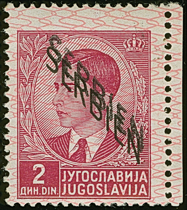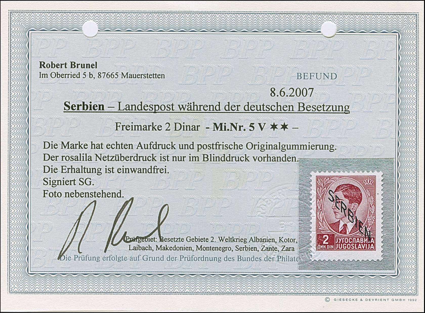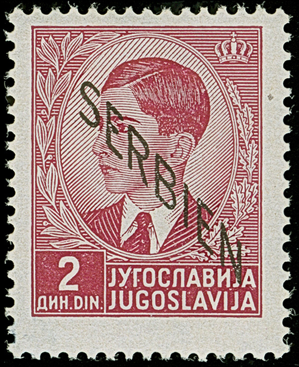 1941, 2 Dinar lilakarmin, mit Aufdruck “SERBIEN” und der Netzunterdruck nur im Blinddruck, postfrisch, tadellos. Eine erstaunlich seltene Marke, sign. SG (winzig durchschlagend) sowie Befund Brunel BPP (2007)