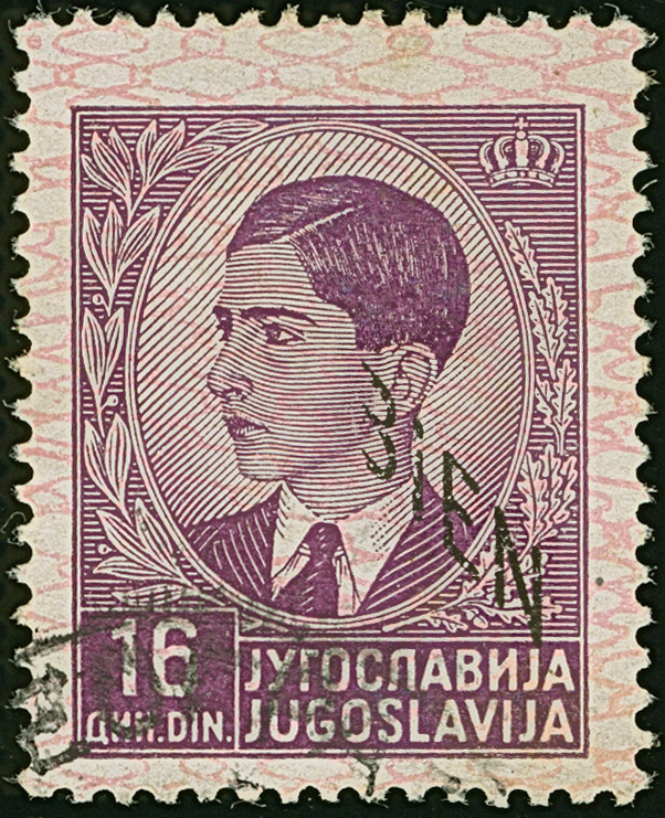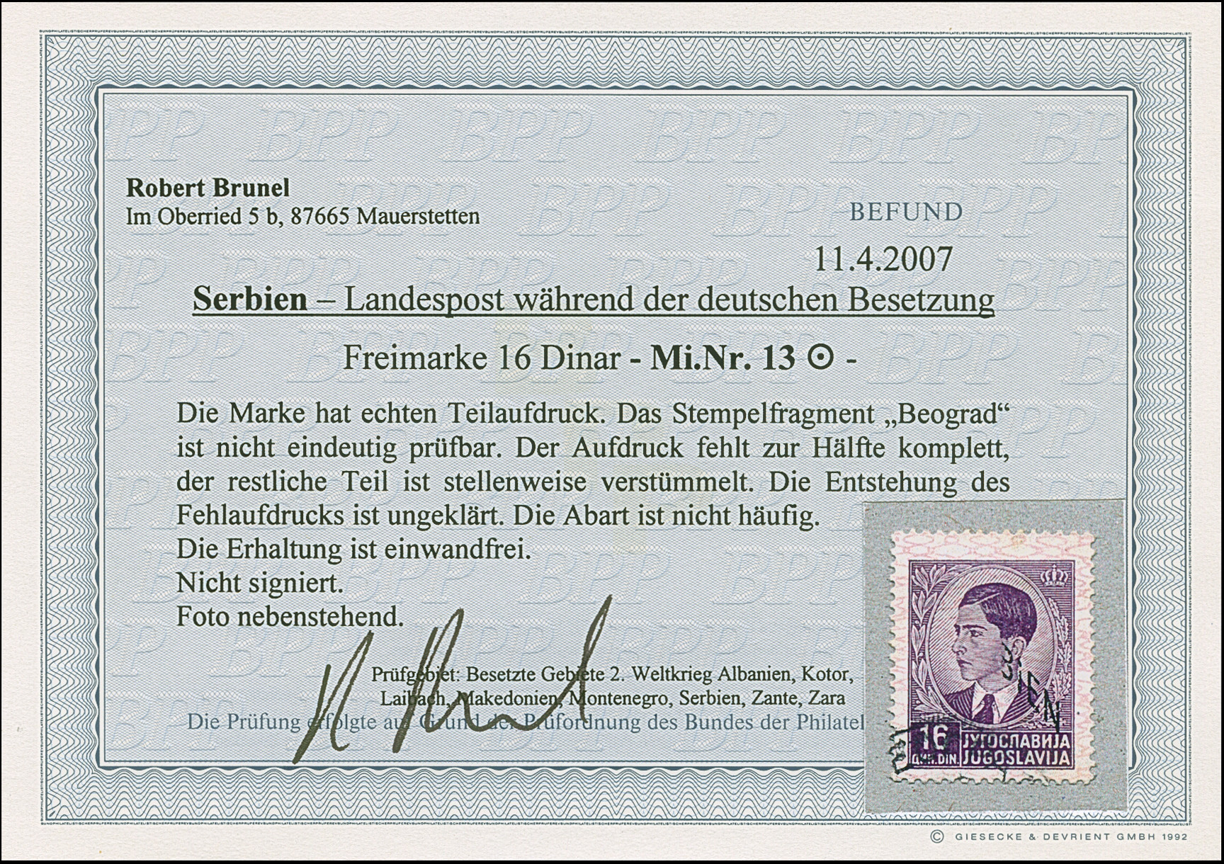 1941, 16 Dinar dunkelbraunviolett, mit verstümmeltem Aufdruck, dadurch nur “BIEN” statt “SERBIEN” lesbar, mit nicht näher bestimmbarem Stempel von Beograd entwertet, tadellos, ProFi hat kein weiteres Stück registriert, Befund Brunel BPP (2007)