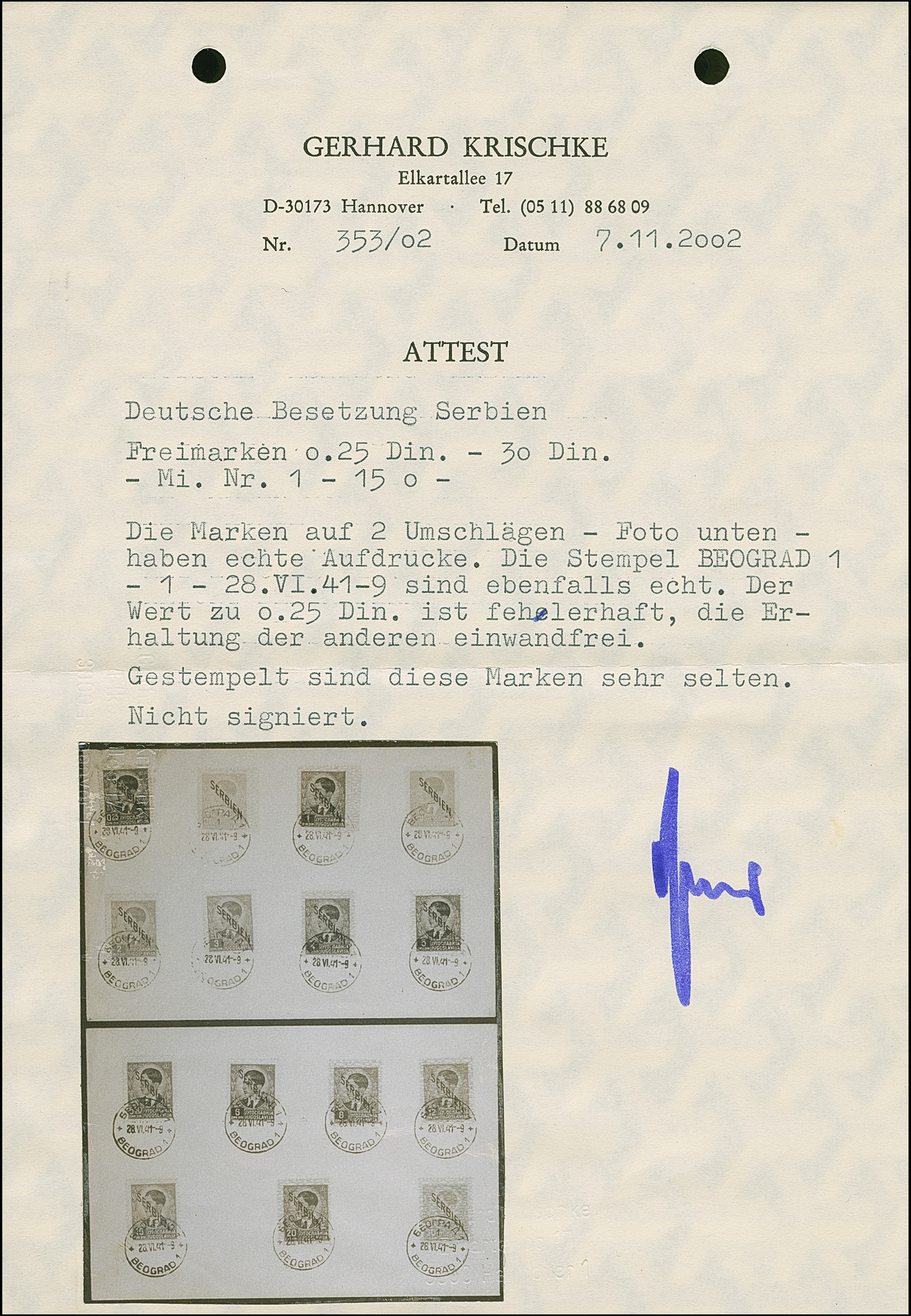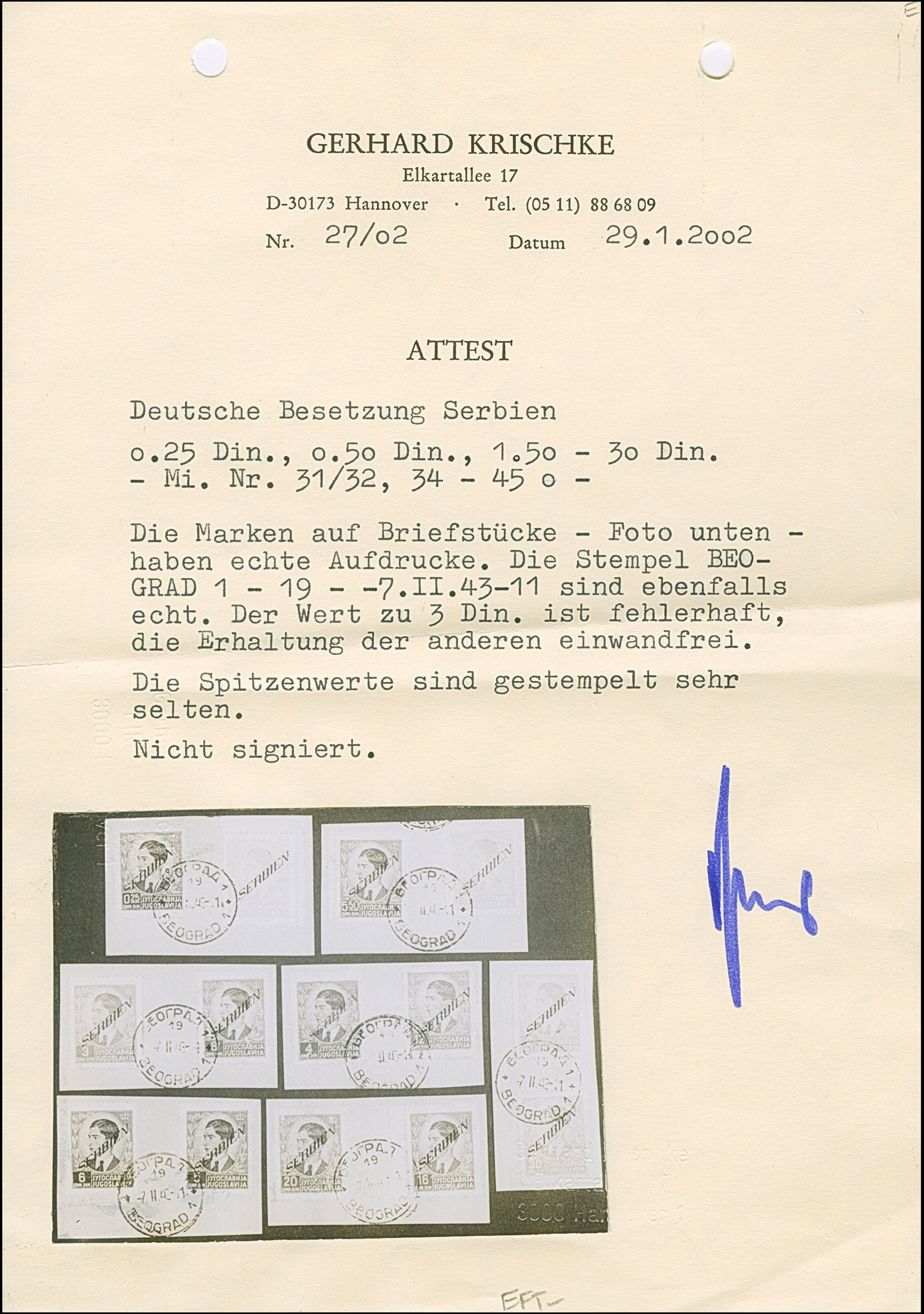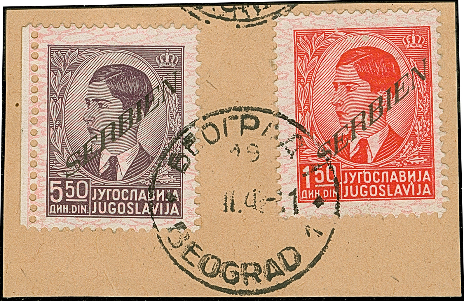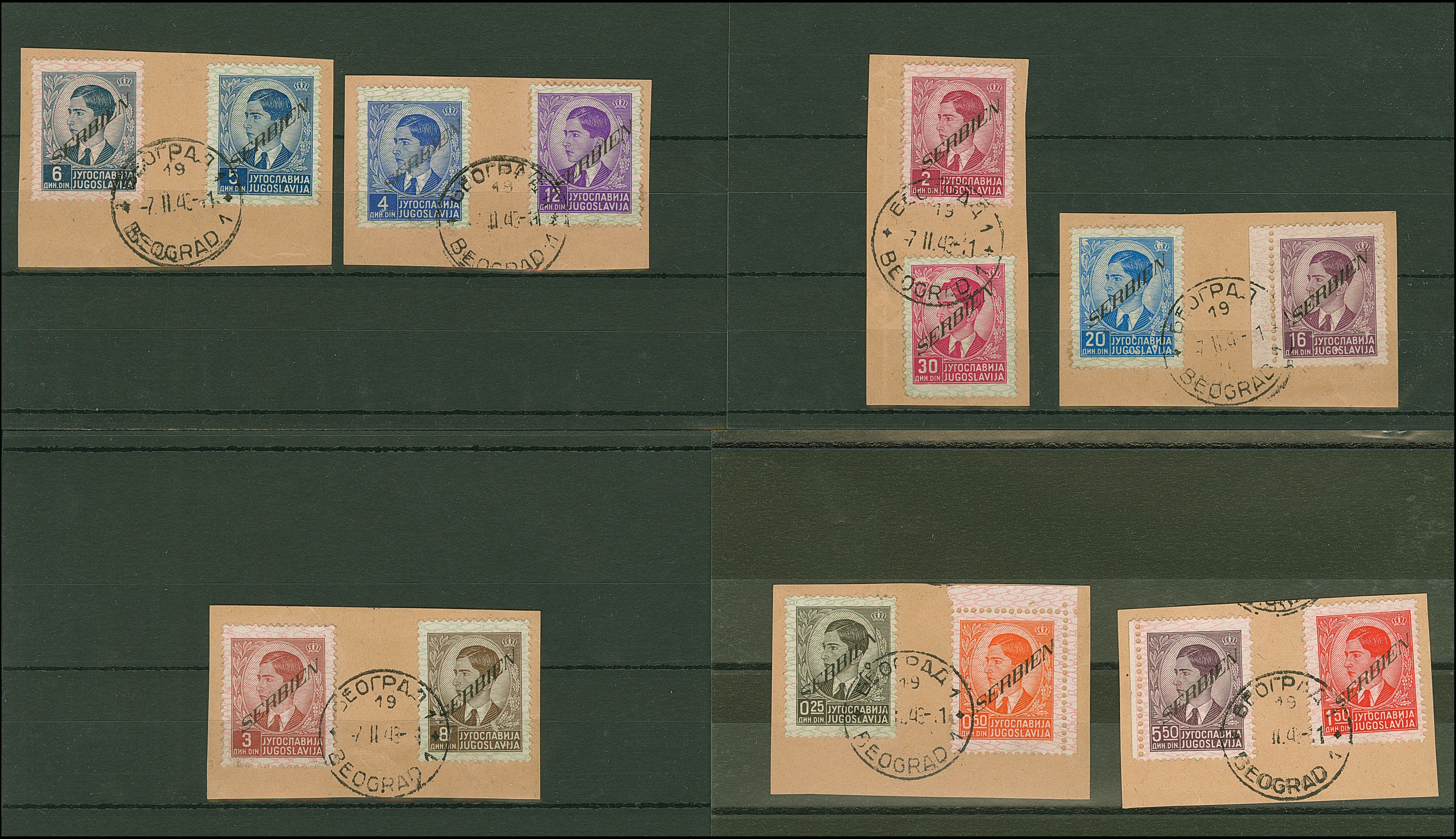 1941, König Peter mit Aufdruck von links unten nach rechts oben 0,25-0,50 Dinar sowie 1,50-30 Dinar, je farbfrisch und normal gezähnt, sauber mit Stempel “BEOGRAD 1 19 7.II.43-11” auf Briefstücken, lediglich die 4 Dinar (im Attest wird die 3 Dinar erwähnt) etwas fehlerhaft, sonst tadellos, gestempelt sind die Höchstwerte sehr selten, Fotoattest Krischke (2002)