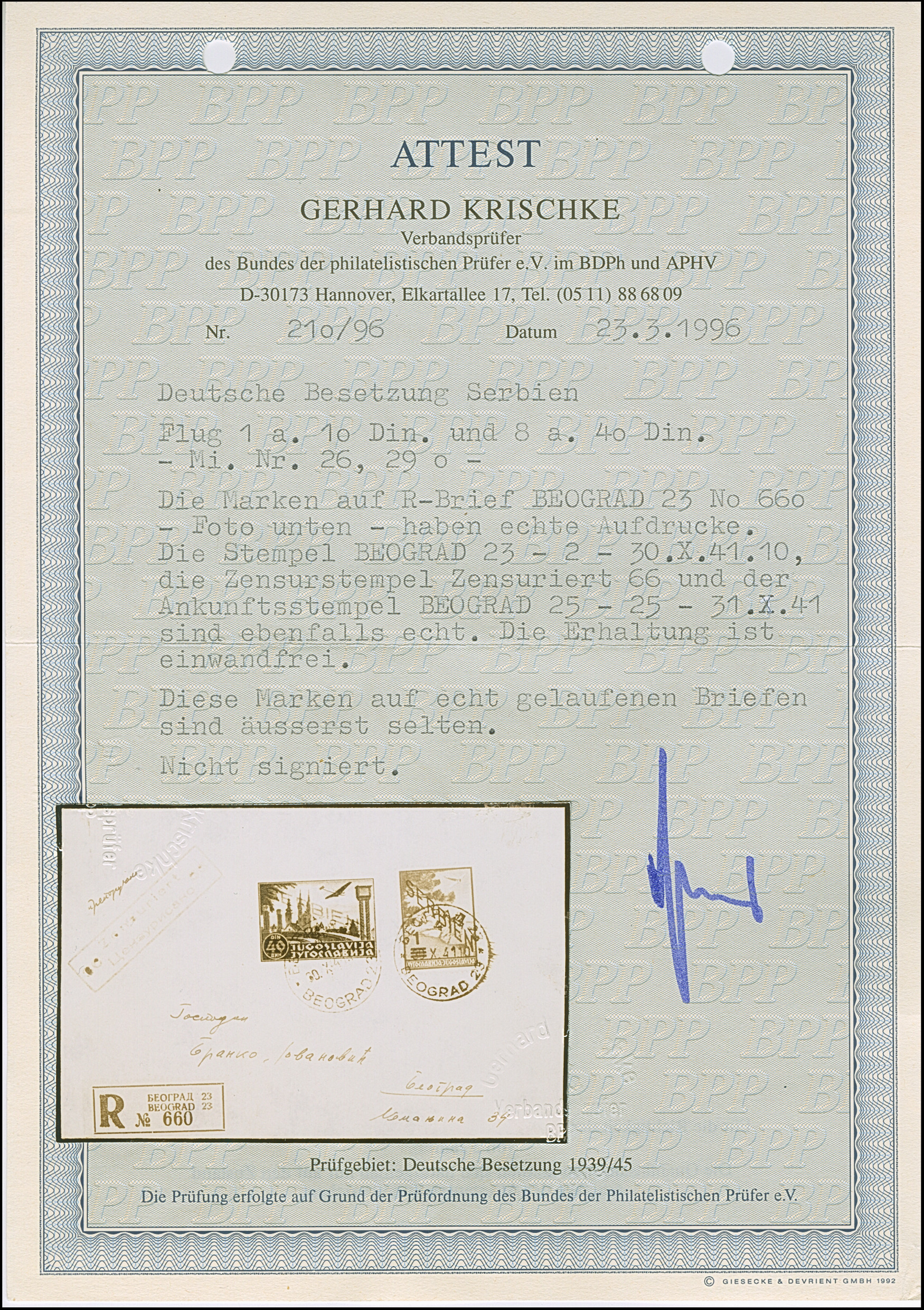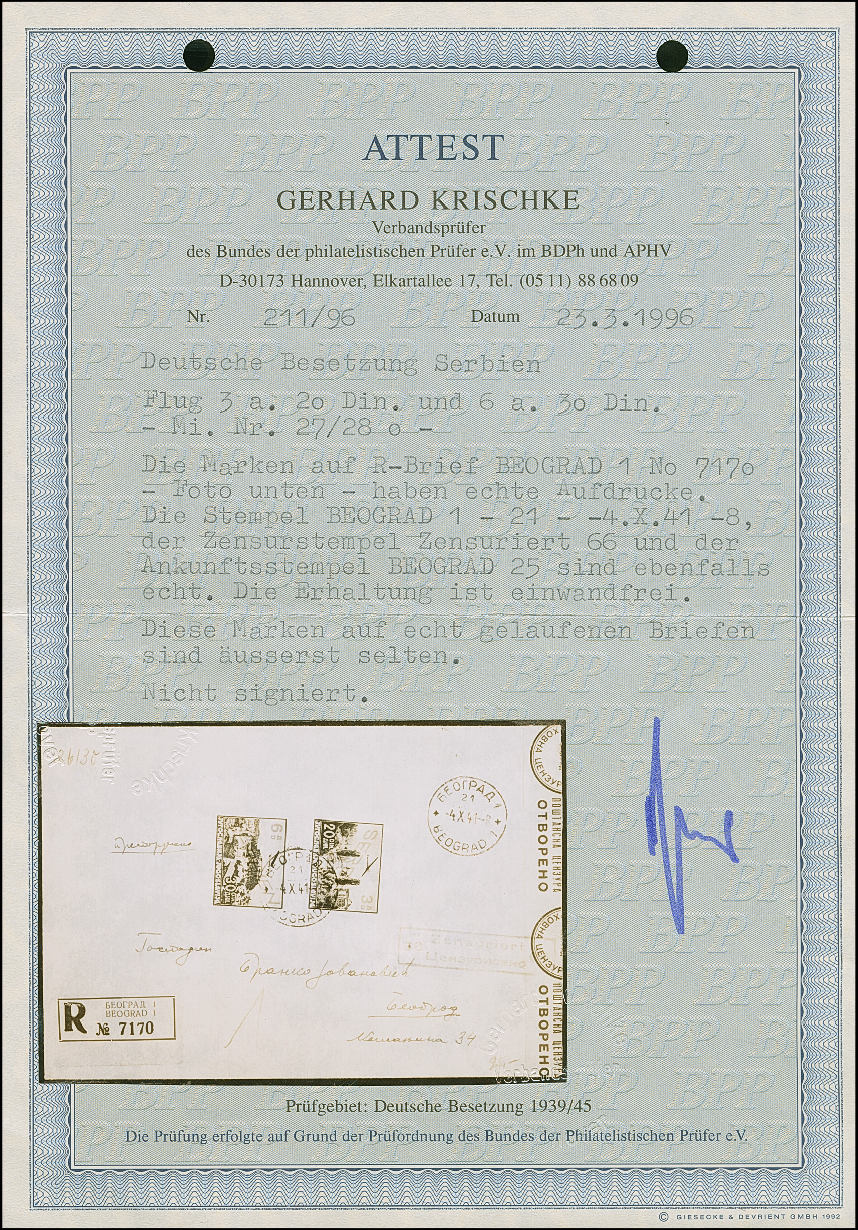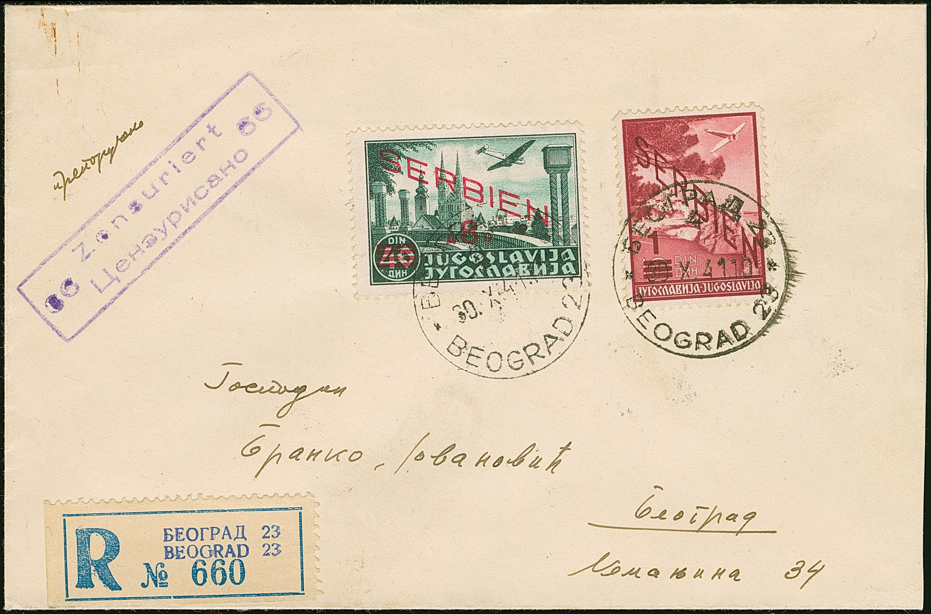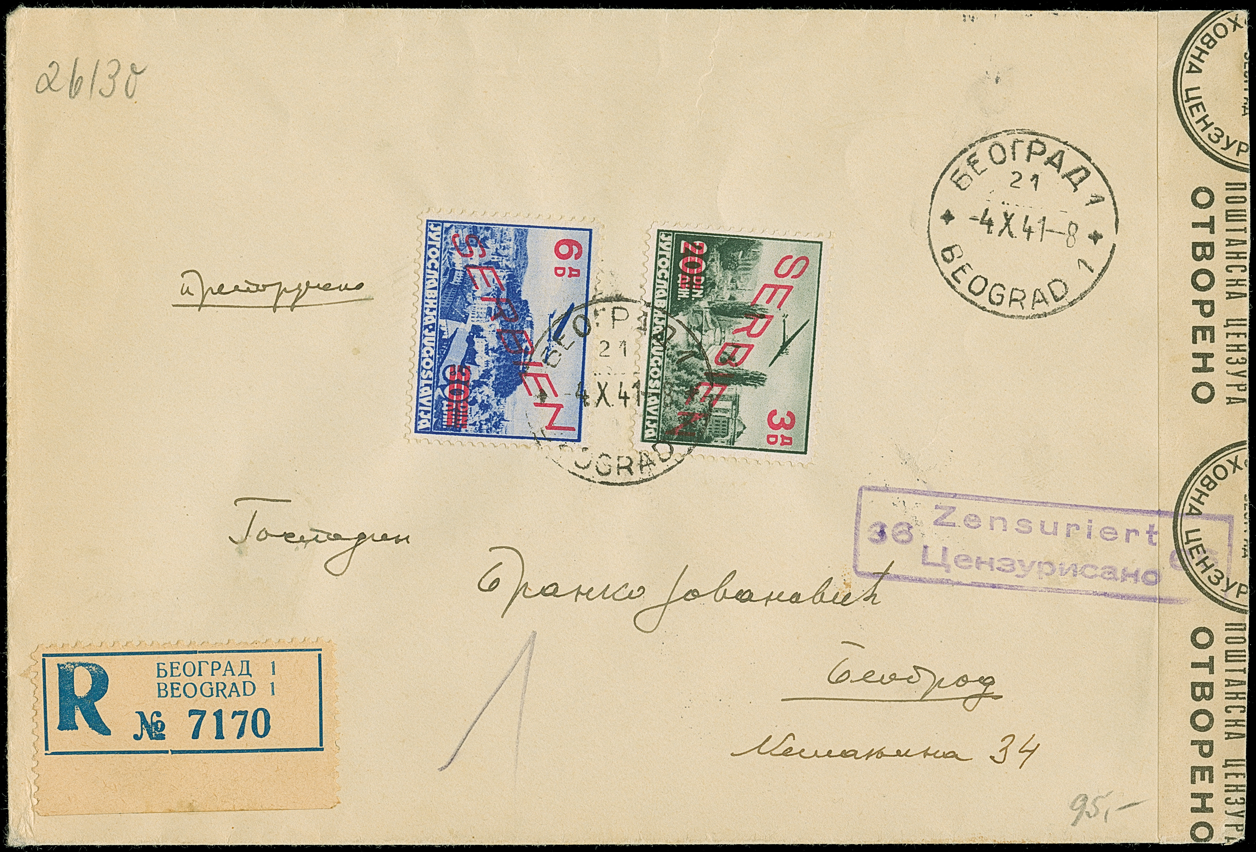 1941, Flugpost 1 auf 10 Dinar und 8 auf 40 Dinar, sauber mit auf- und nebengesetztem Stempel “BEOGRAD 30.X.41” auf Orts-R-Brief mit Zensur-Verschlußstreifen “GEÖFFNET POSTZENSUR OBERZENSUR BELGRAD” und Zensur-Ra2 “36 Zensiert..”, oben links kleine Rostspuren, sonst tadellos, ein sehr seltener und attraktiver Brief, Fotoattest Krischke BPP (1996)