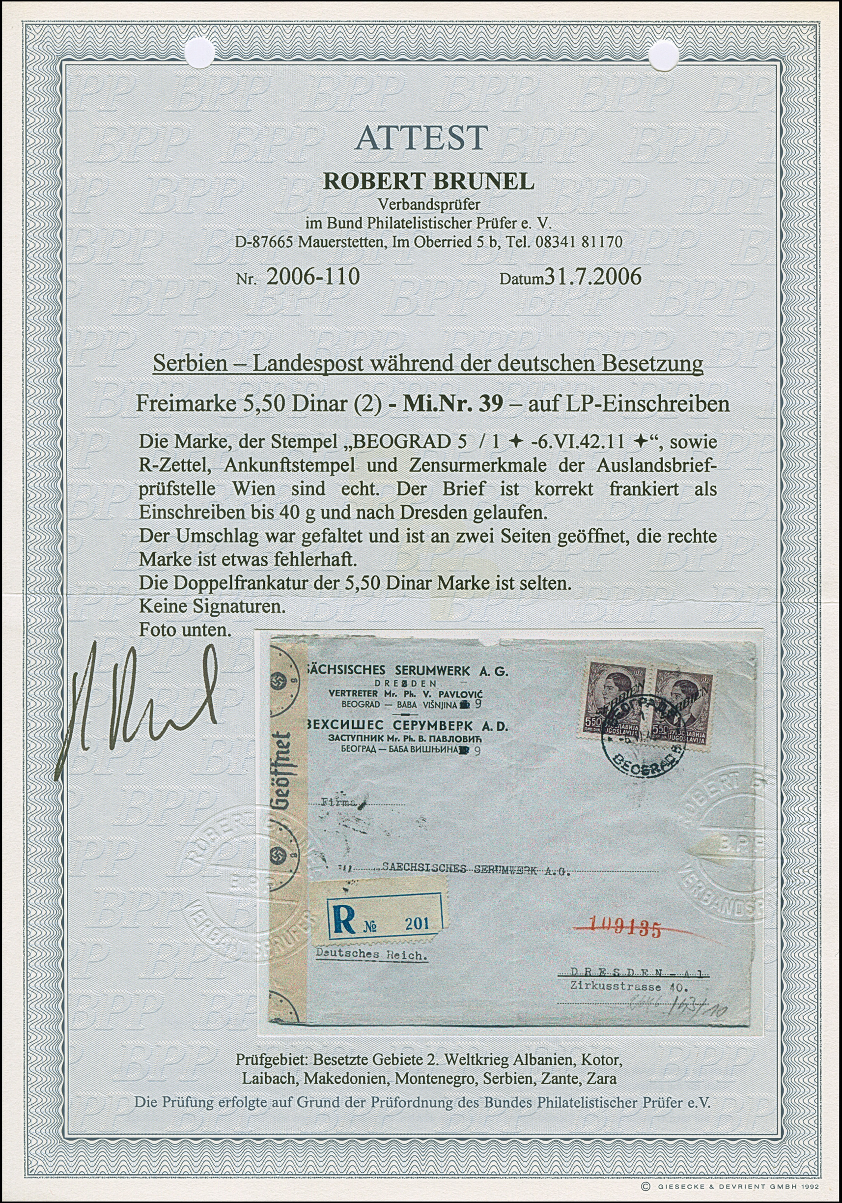 1941, König Peter II. 5,50 Dinar, waagerechtes Paar, sauber mit Stempel “BEOGRAD -6.VI,41” auf doppelt schwerem R-Brief mit Zensurbanderole nach Dresden, der Brief gefaltet und zweiseitig geöffnet, die Marken kleine Einschränkungen, eine seltene Frankatur, Fotoattest Brunel BPP (2006)
