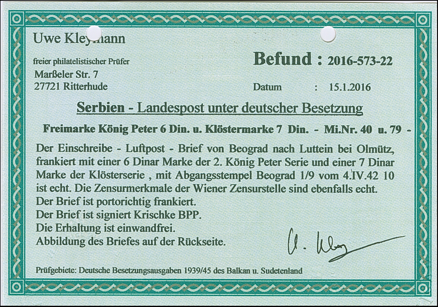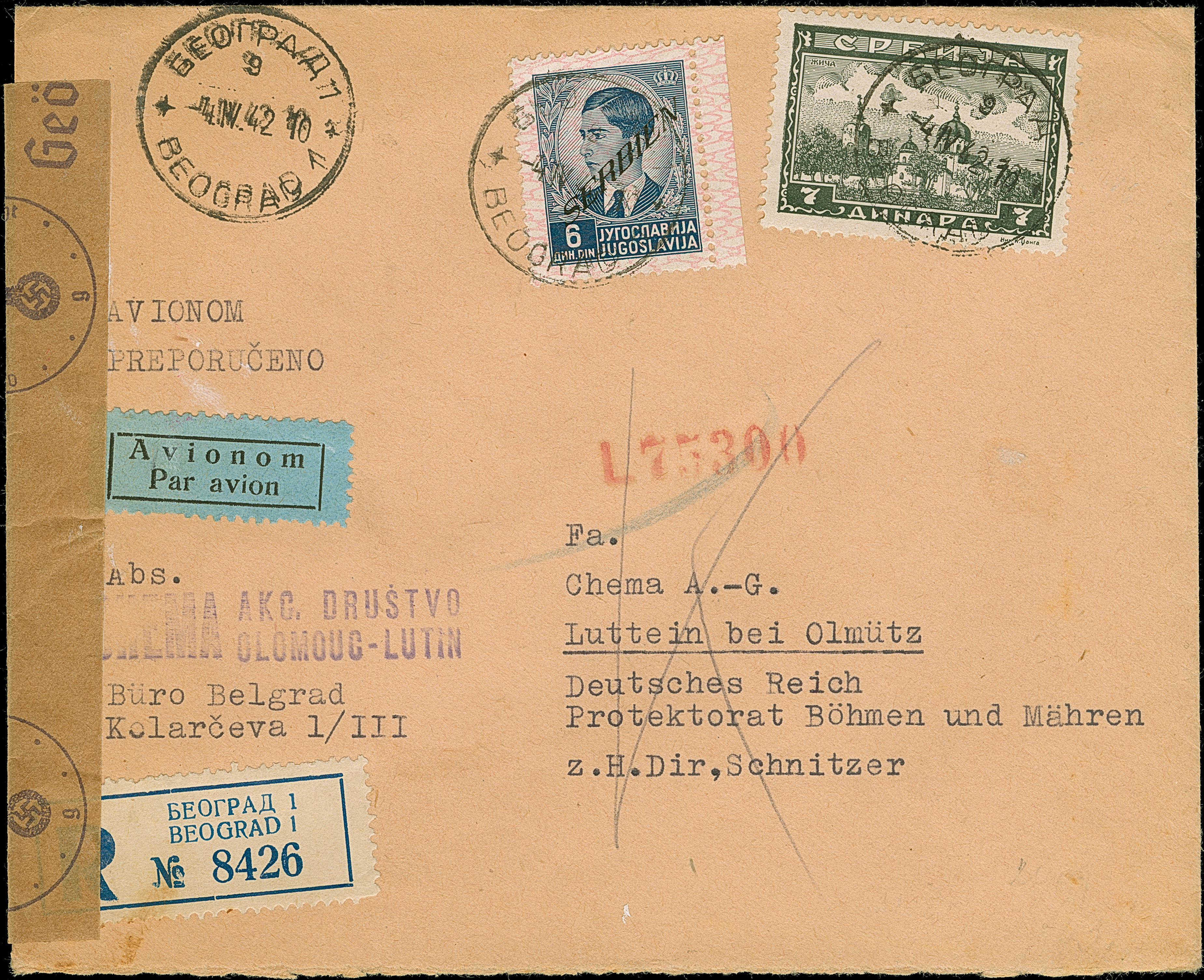 1941, König Peter II. 6 Dinar, zusammen mit Klöster 7 Dinar, sauber mit Stempel “BEOGRAD -4.IV.42” auf zensiertem Luftpost-R-Brief nach Lutte im Protektorat Böhmen und Mähren, tadellos, sign. Krischke BPP sowie Befund Kleymann BPP (2016)