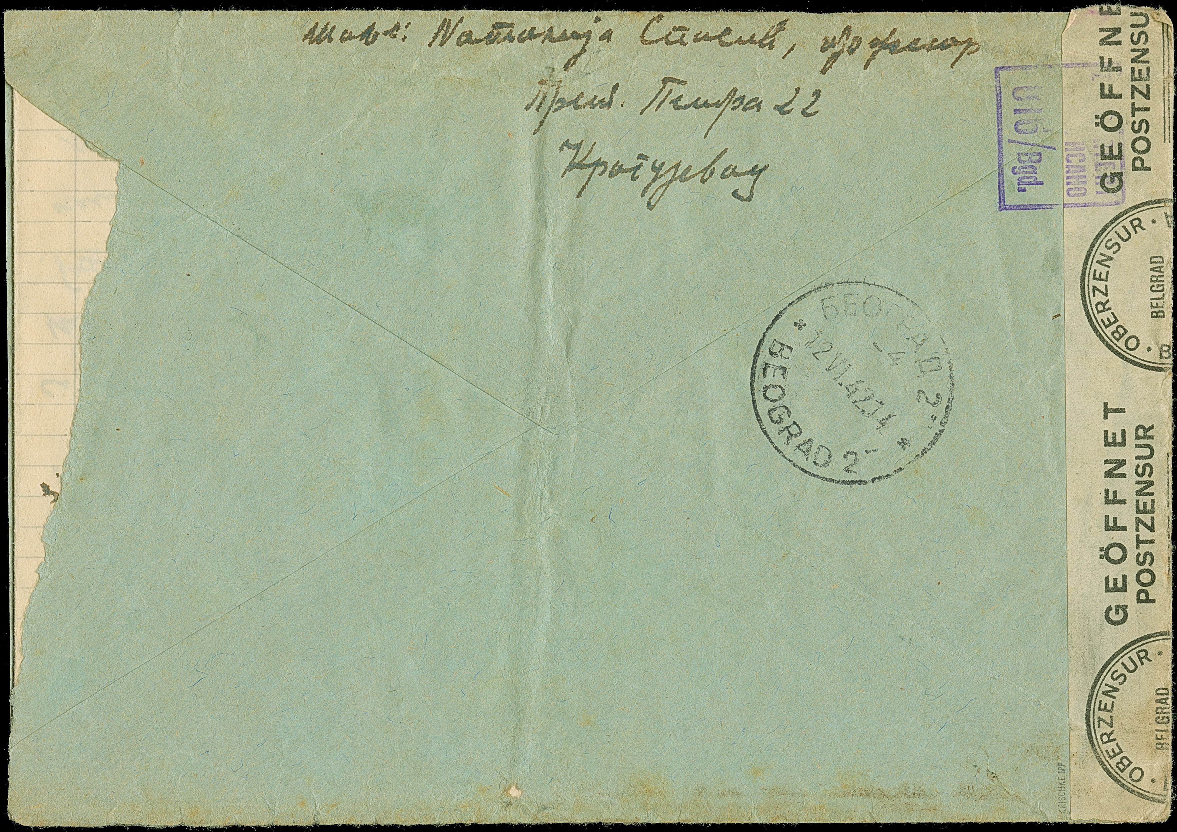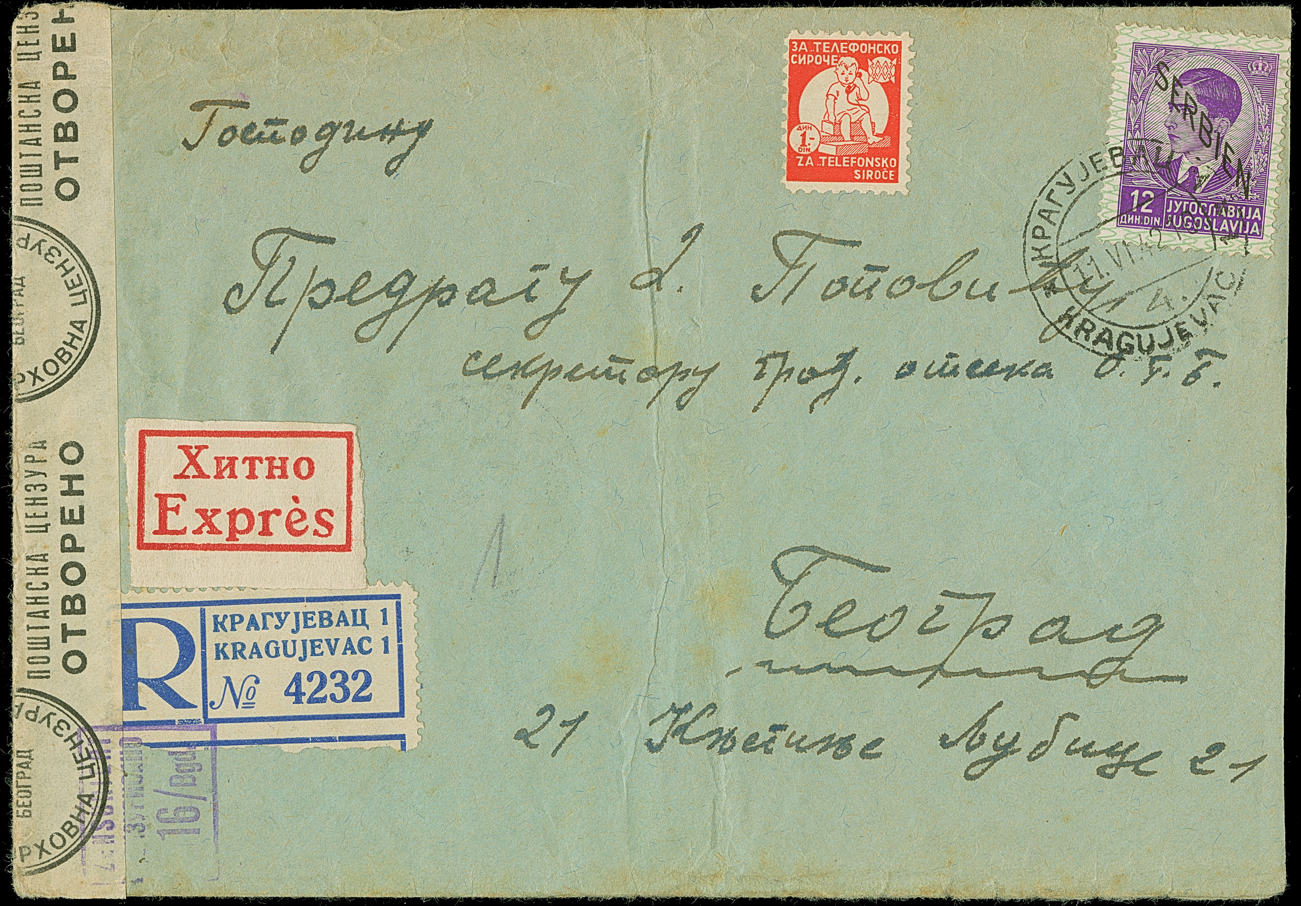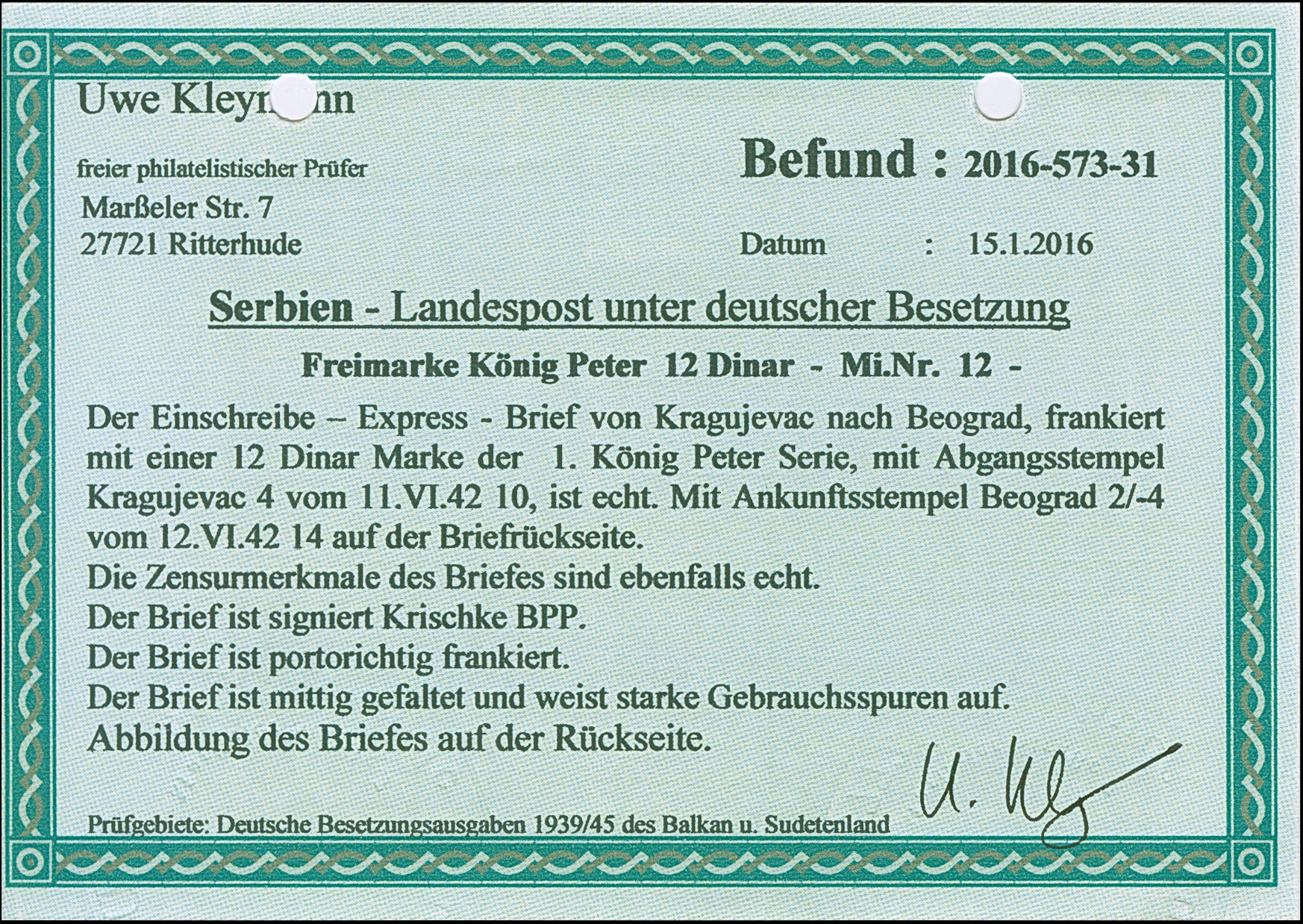 1941, 12 Dinar mit Stempel “KRAGUJEVAC 11.VI.42” auf Eil-R-Brief nach Beograd mit Zensurstreifen links, einmal senkrecht gefaltet, mit Transport- und Altersspuren, sonst in guter Erhaltung, Befund Kleymann (2016)