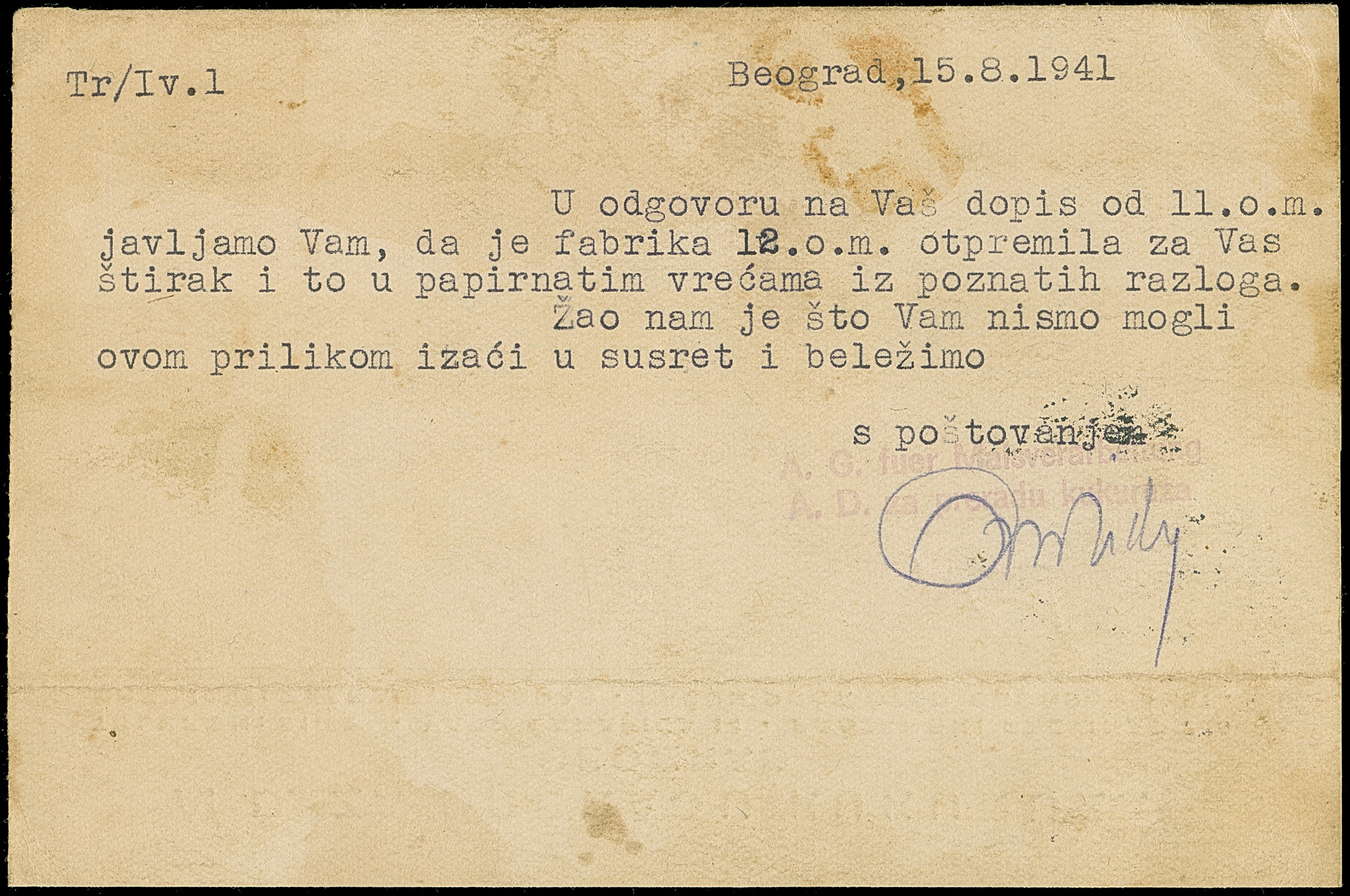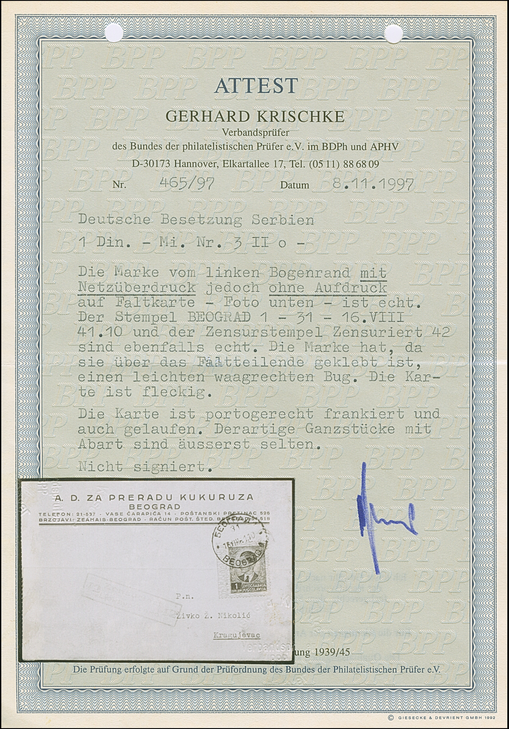 1941, König Peter II. 1 Dinar dunkelsmaragdgrün, ohne Aufdruck “SERBIEN”, sauber mit Stempel “BEOGRAD 16.VIII.41” auf Postkarte nach Kragujevac mit nebengesetztem Zensurstempel, die Marke mit verwendungsbedingtem, waagerechten Knitter, die Karte etwas fleckig, sonst tadellos, sehr selten, ProFi hat kein weiteres Ganzstück registriert, Fotoattest Krischke BPP (1997)