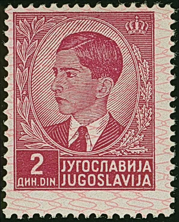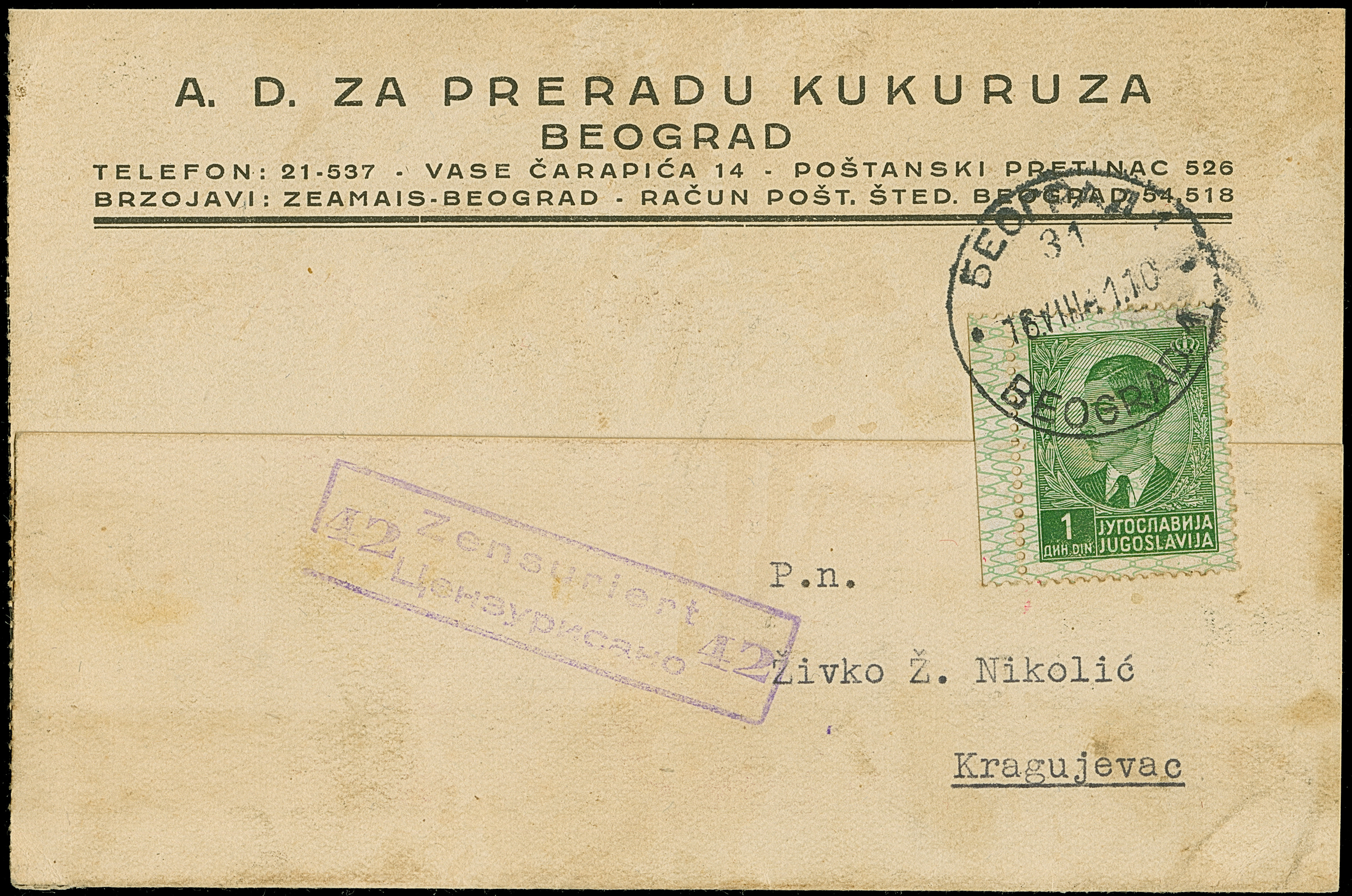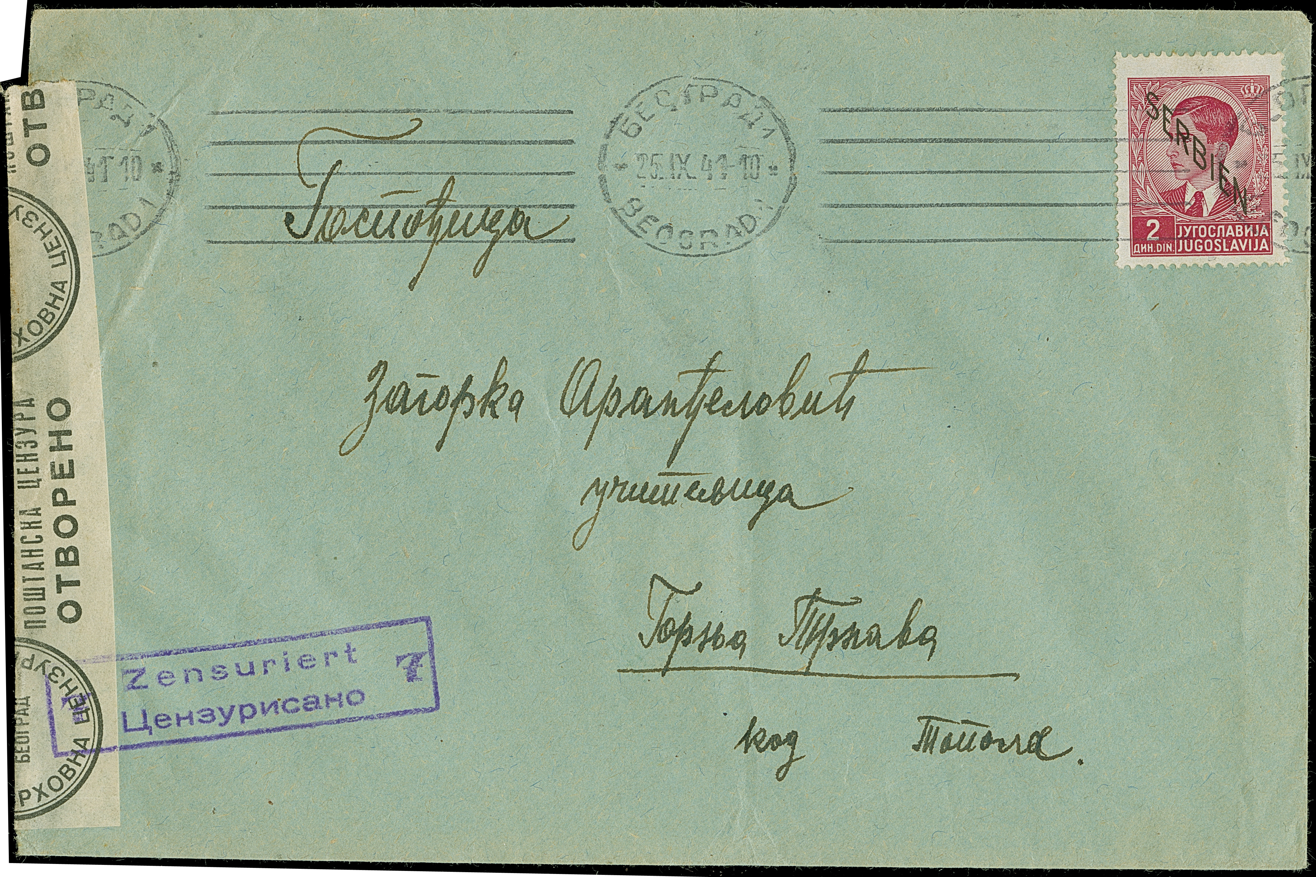 1941, König Peter II. 2 Dinar lilakarmin, ohne Netzüberdruck, sauber mit Maschinenstempel “BEOGRAD 25.IX.41” auf portogerechtem, zensierten Brief nach Topola, die Marke winzig verkürzte Zähne, sonst tadellos, ProFi hat kein weiteres Ganzstück in dieser Form registriert, Fotoattest Krischke (2002)
