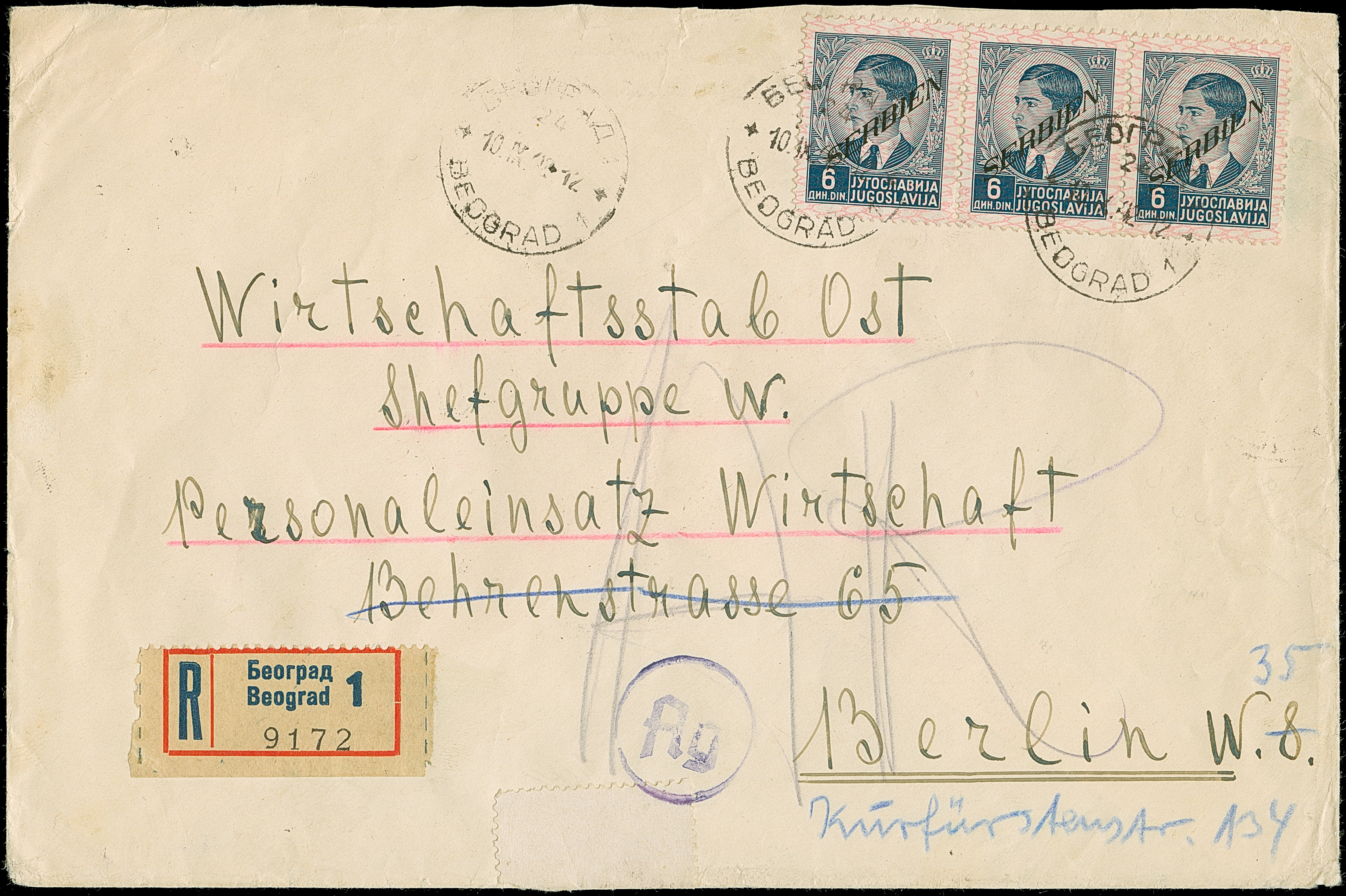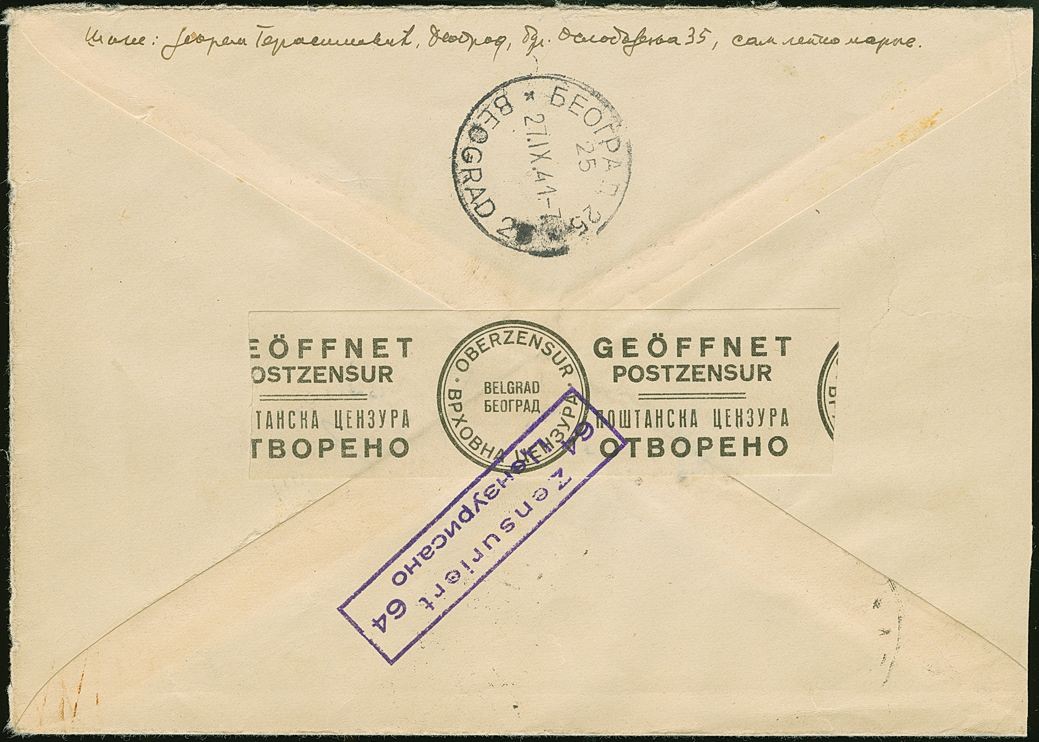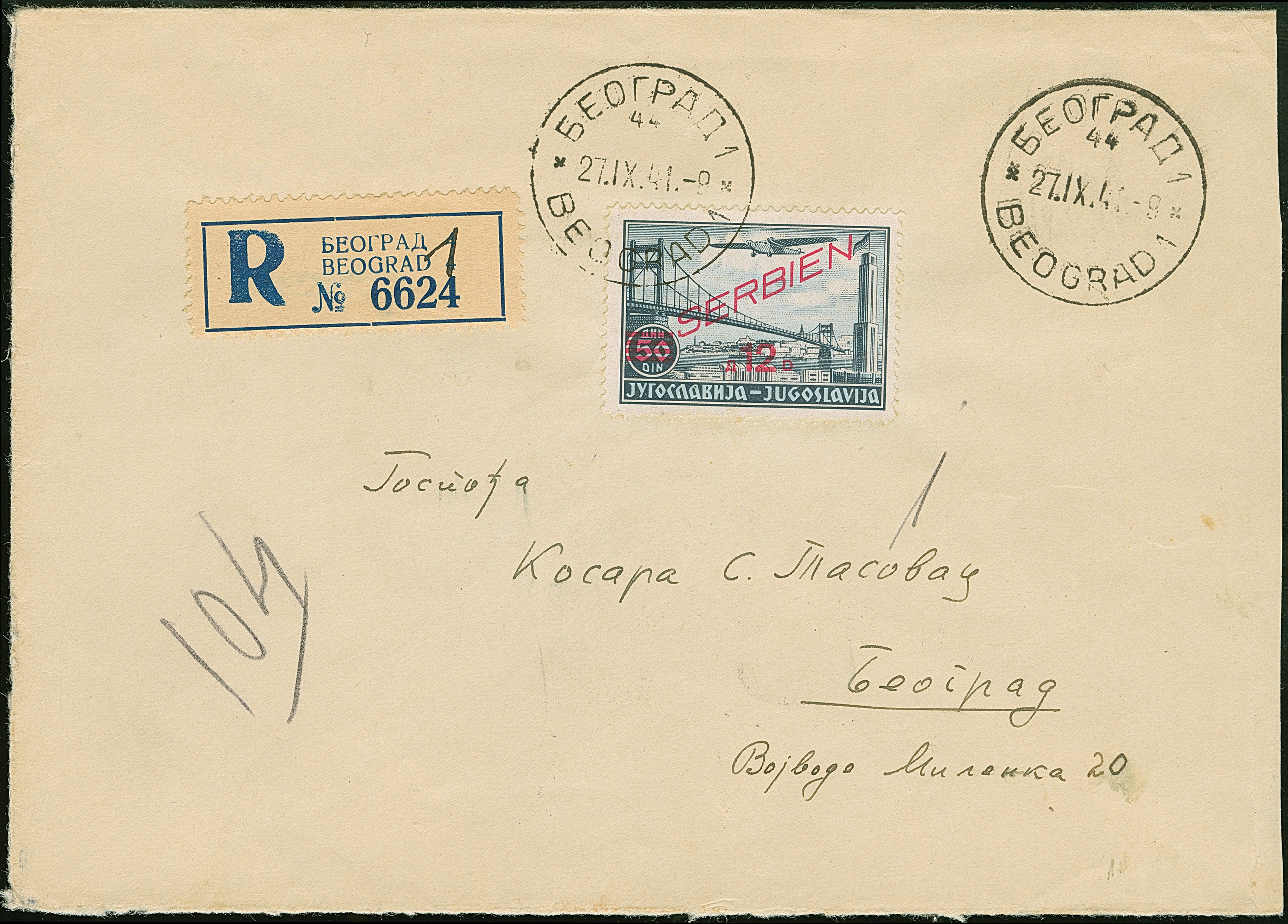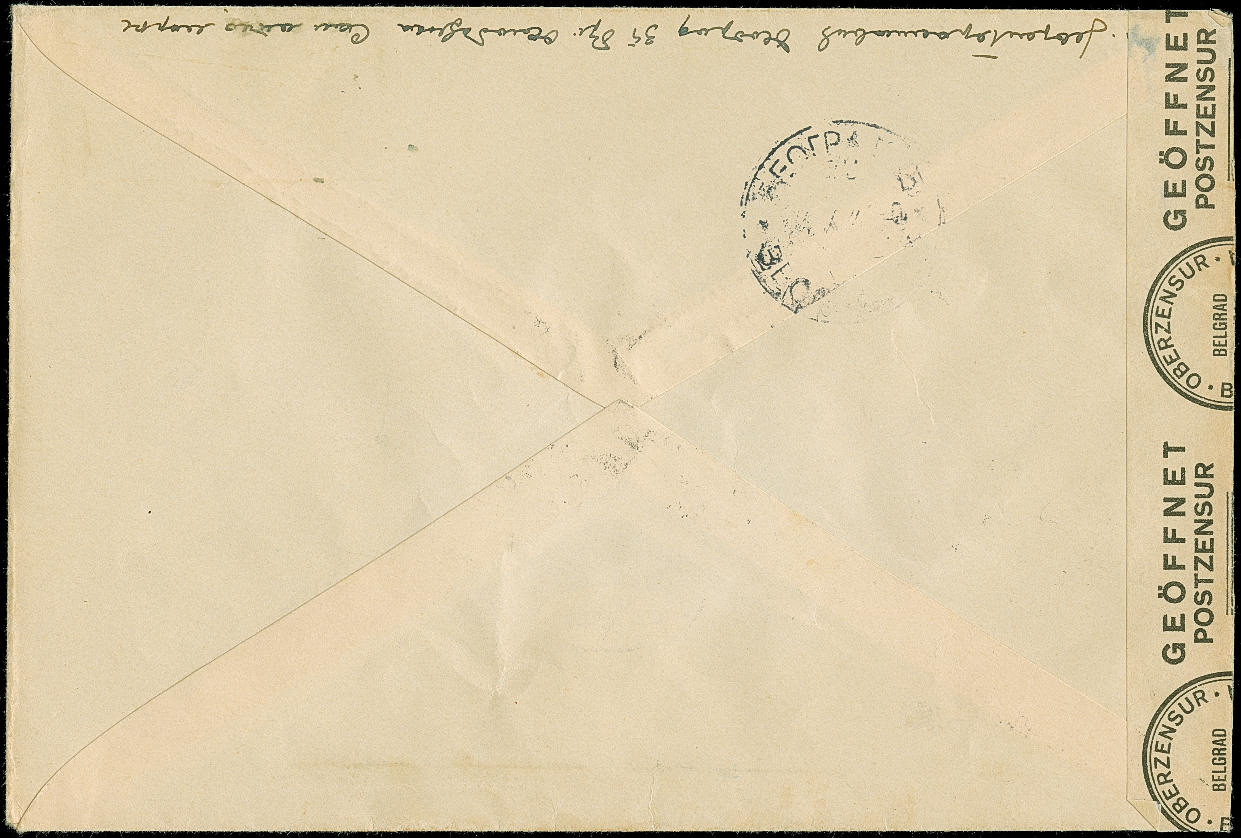 1941, Flugpost 12 auf 50 Dinar, sauber mit auf- und nebengesetztem Stempel “BEOGRAD 27.IX.41” auf überfrankiertem Orts-R-Brief, rückseitig violetter Zensur-Ra2 “Zensuriert 64” sowie Zensur-Banderole “GEÖFFNET POSTZENSUR OBERZENSUR BELGRAD” sowie Ankunftsstempel, in dieser Form sehr selten, in guter Erhaltung
