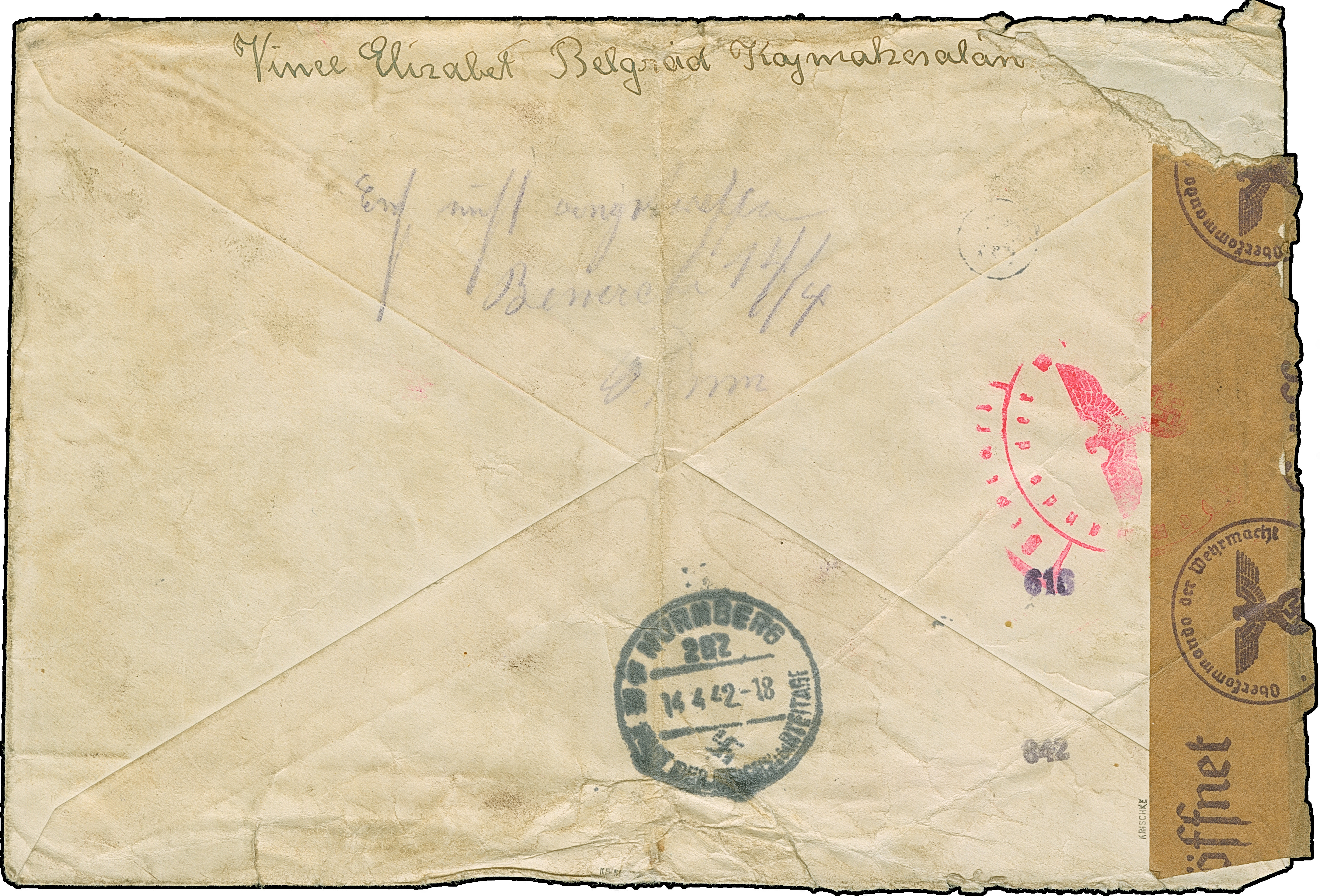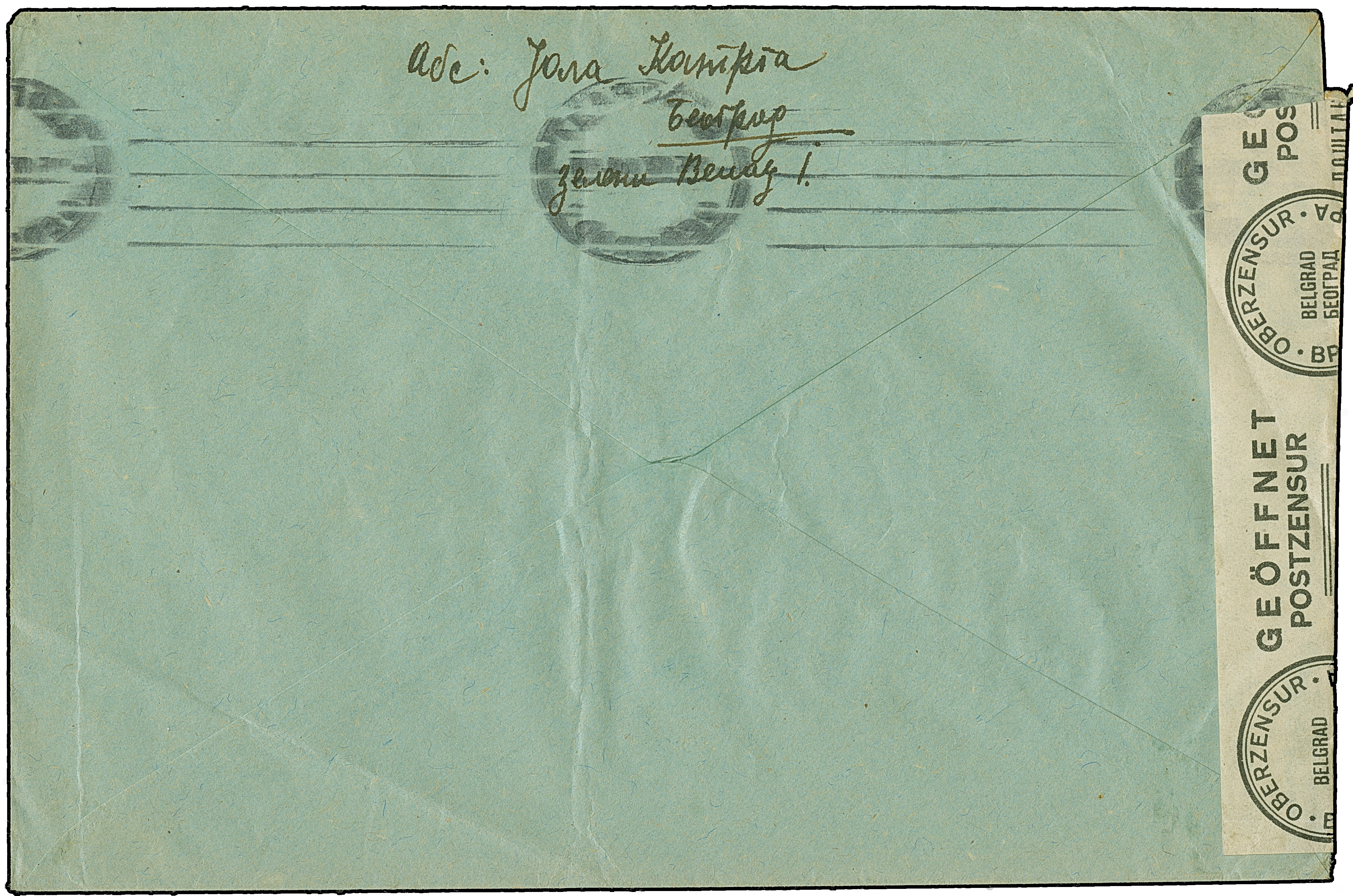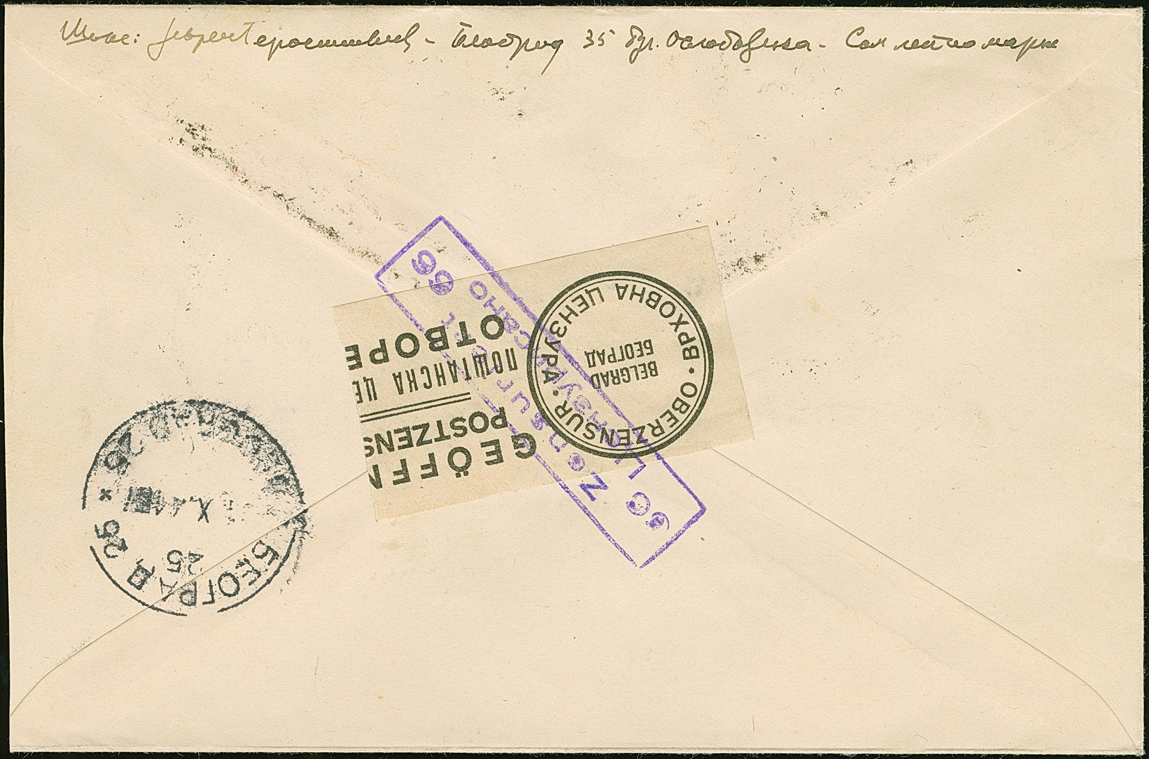 1941, Flugpost 12 auf 50 Dinar, sauber mit auf- und nebengesetztem Stempel “BEOGRAD 27.IX.41” auf überfrankiertem Orts-R-Brief, rückseitig violetter Zensur-Ra2 “Zensuriert 64” sowie Zensur-Banderole “GEÖFFNET POSTZENSUR OBERZENSUR BELGRAD” sowie Ankunftsstempel, in dieser Form sehr selten, in guter Erhaltung