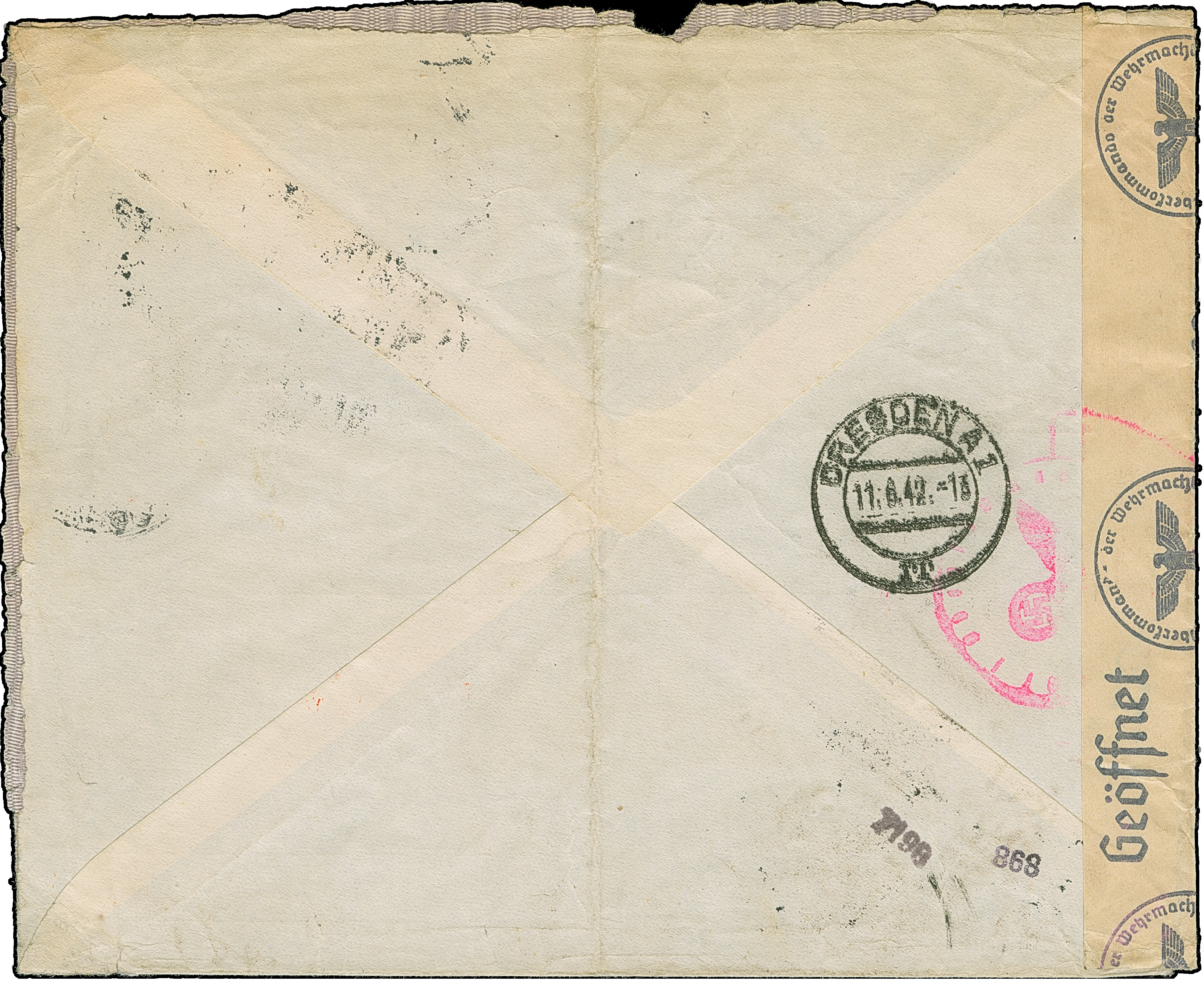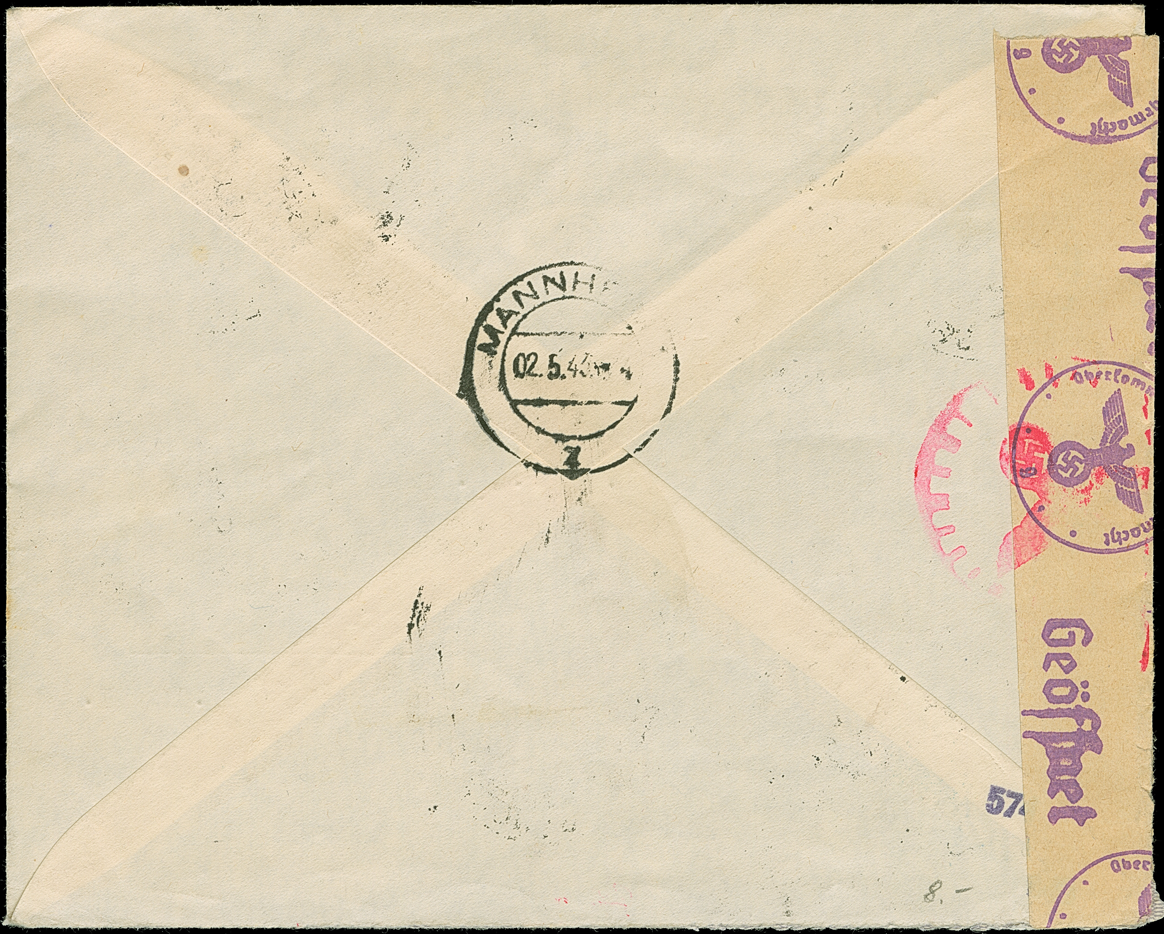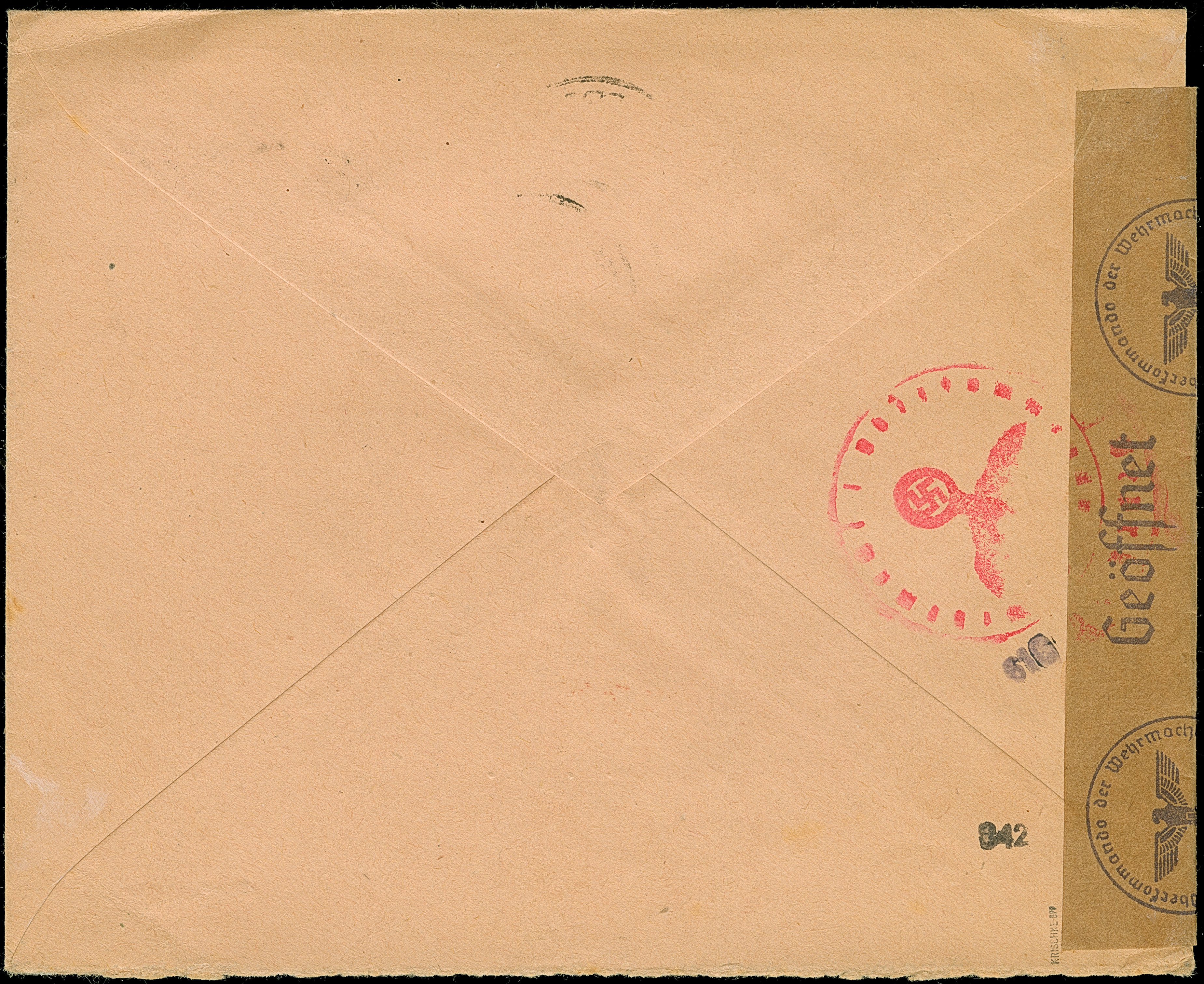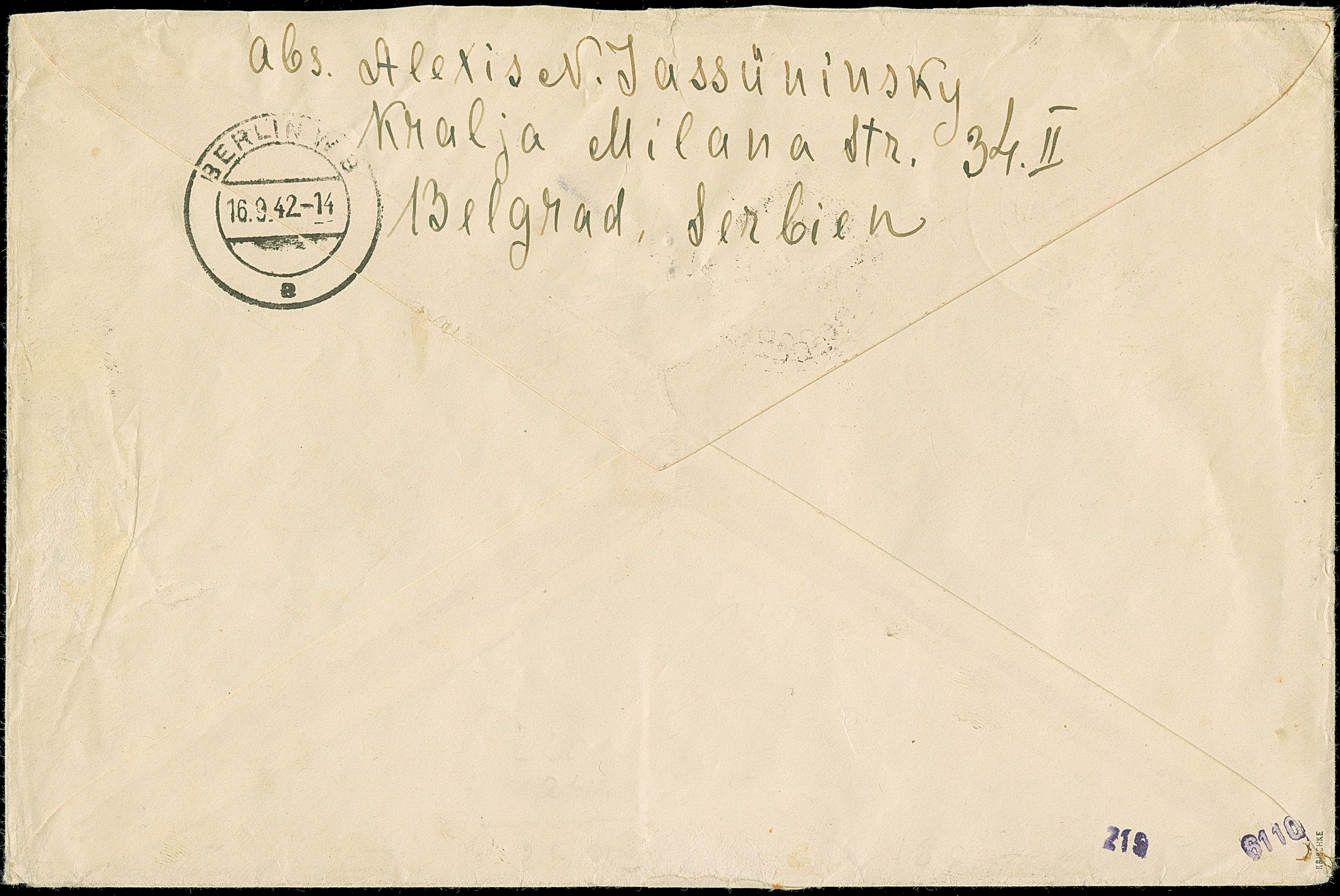 1941, Flugpost 12 auf 50 Dinar, sauber mit auf- und nebengesetztem Stempel “BEOGRAD 27.IX.41” auf überfrankiertem Orts-R-Brief, rückseitig violetter Zensur-Ra2 “Zensuriert 64” sowie Zensur-Banderole “GEÖFFNET POSTZENSUR OBERZENSUR BELGRAD” sowie Ankunftsstempel, in dieser Form sehr selten, in guter Erhaltung