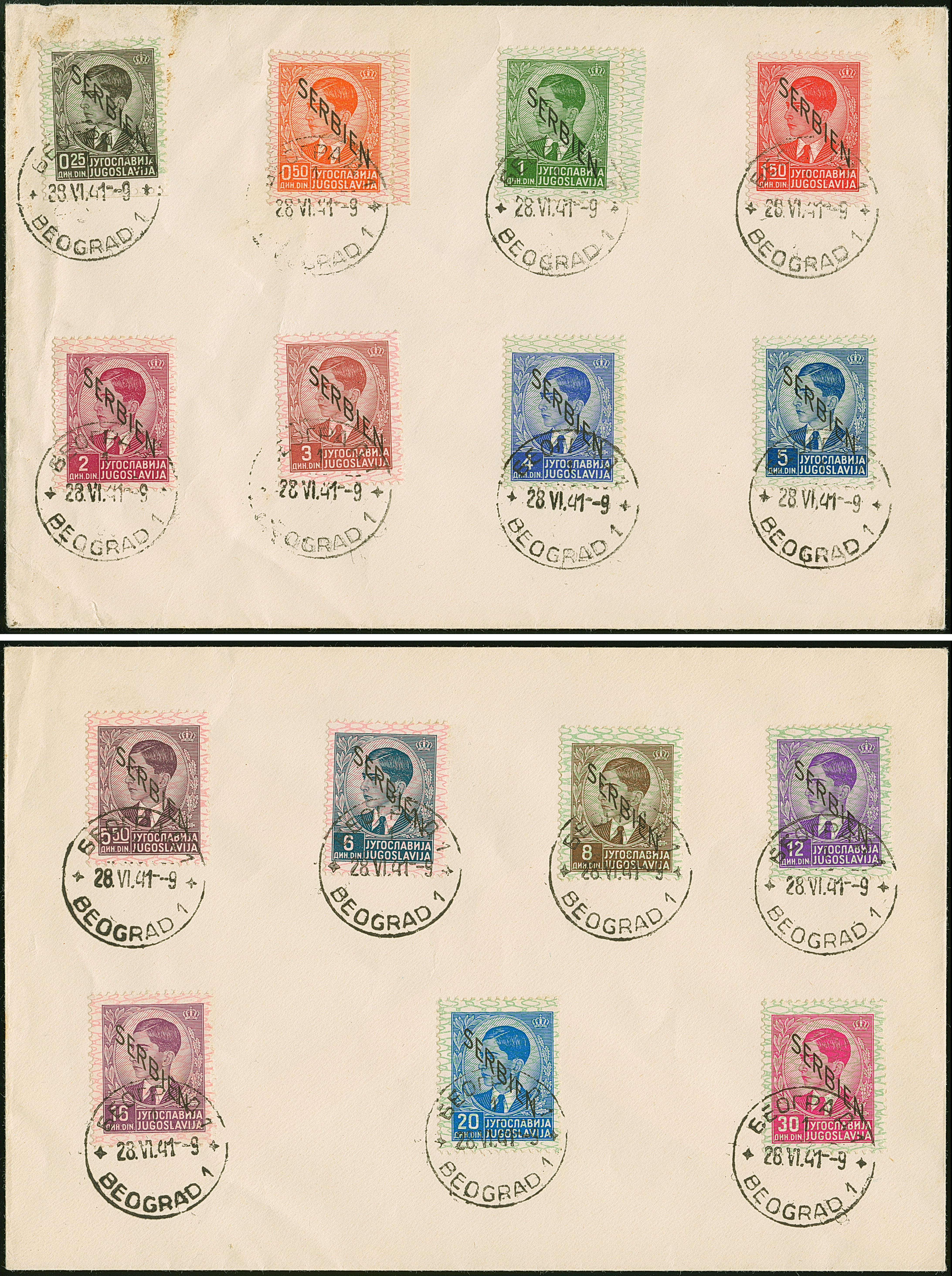 1941, König Peter II. 0,25 -30 Dinar, sauber mit Stempel “BEOGRAD 28.VI.41” auf zwei unbeschrifteten Umschlägen, 0,25 Dinar fehlerhaft, sonst tadellos, eine gestempelt sehr seltene Serie, Fotoattest Krischke (2002)