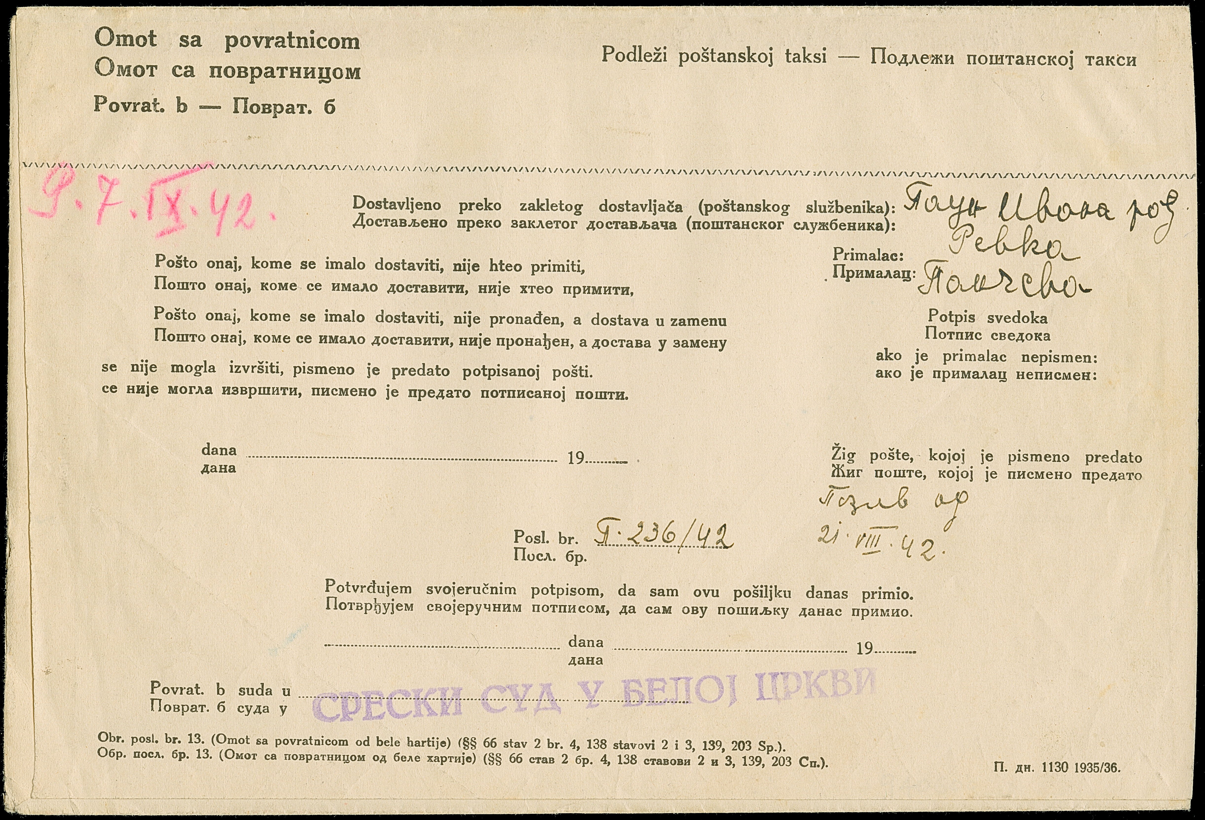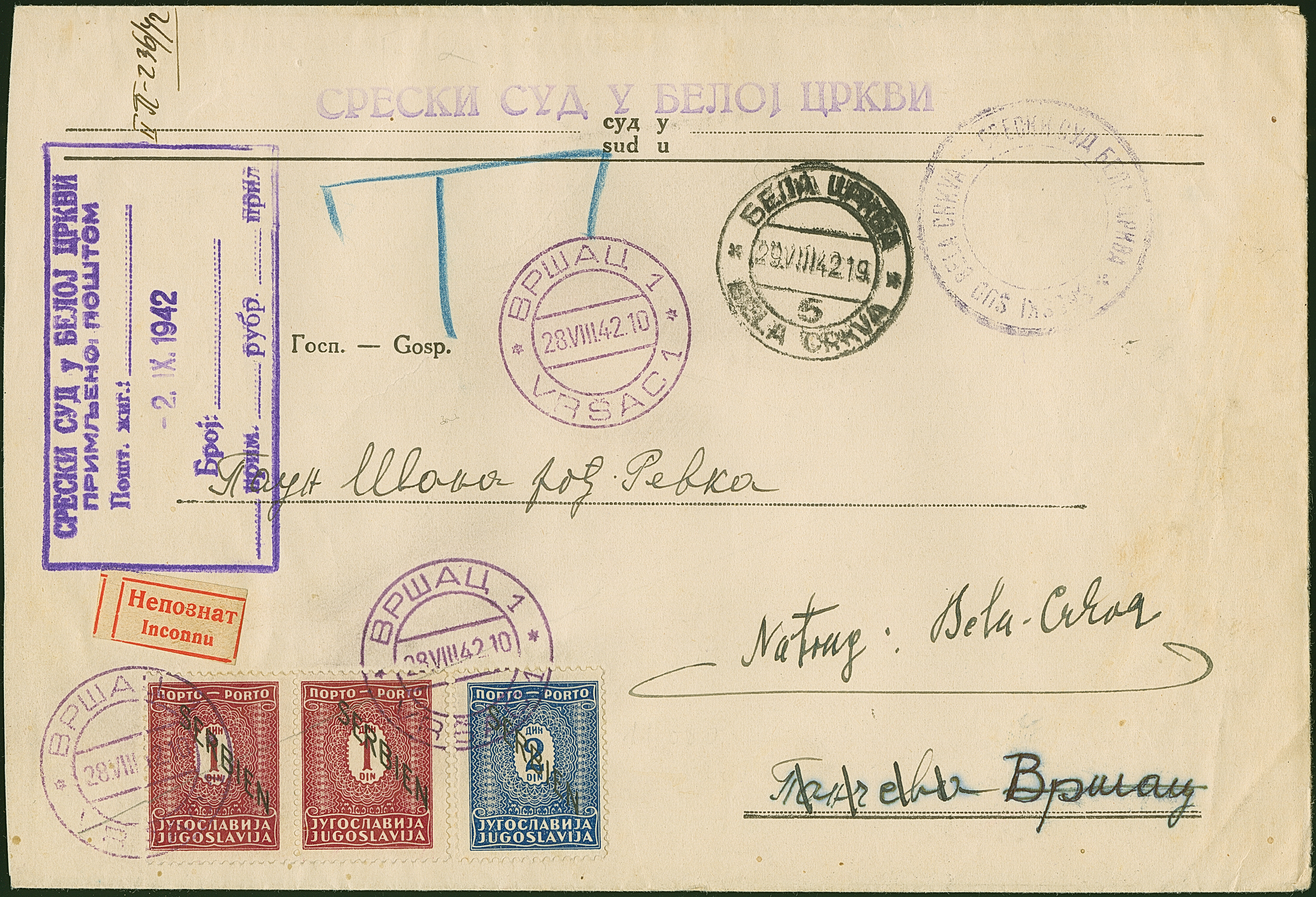 1941, 1 Din. im waagerechten Paar und Einzelmarke 2 Din. je mit violettem Stempel “VRSAC 1 28.VIII.42” auf unfrankierter Vordruck-Briefhülle mit Nachsendung nach Bela Crkva mit vorderseitigem Ankunftsstempel, in guter Erhaltung