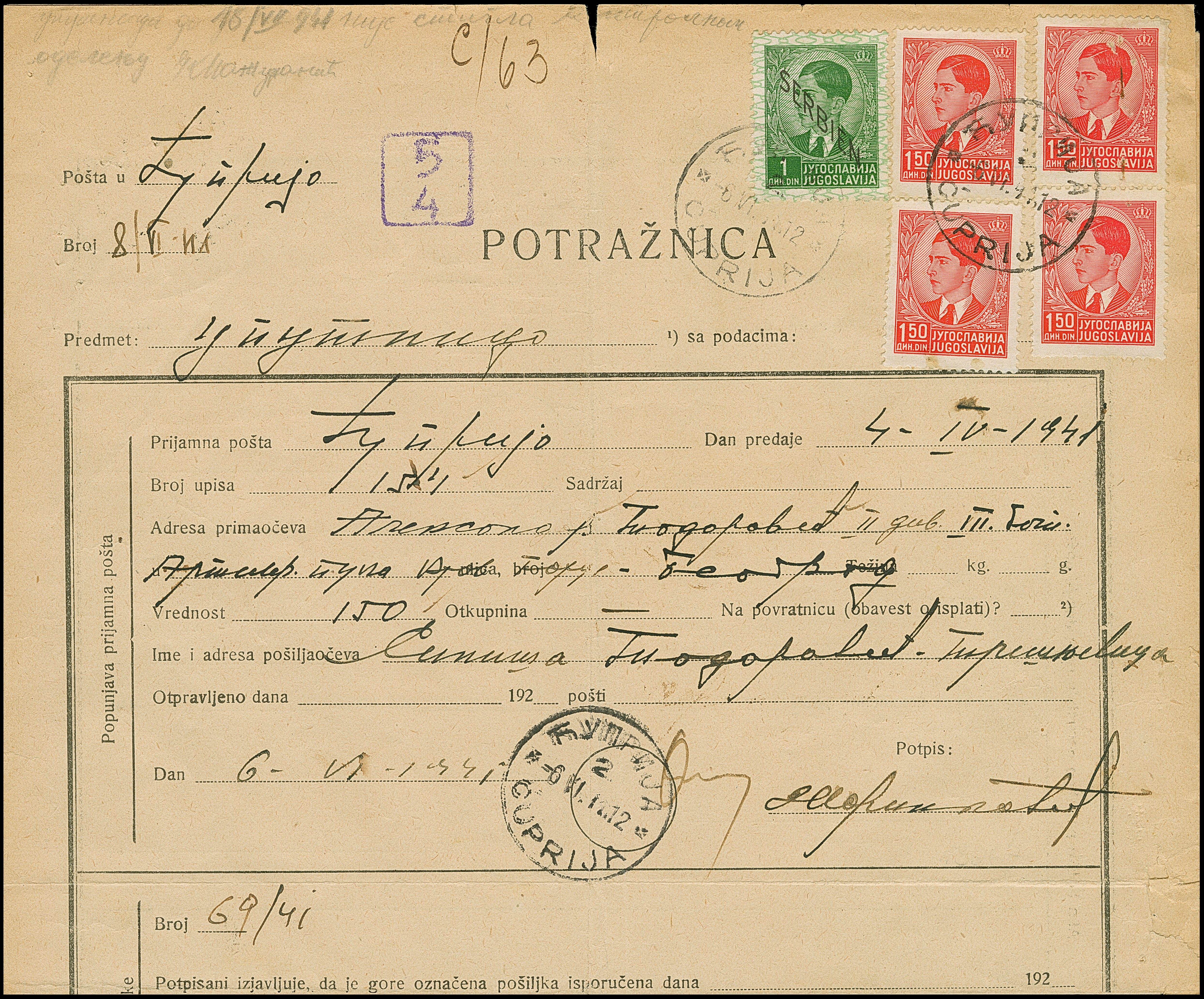 1940, König Peter II. 1,50 Dinar rot, zwei senkrechte Paare, in Mischfrankatur mit 1. Aufdruckausgabe 1 Dinar grün, sauber mit Stempel “CUPRIJA 6,VI.41” auf Nachforschungsantrag nach Belgrad mit Ankunftstempel, das Formular übliche Bedarfsspunren, die Marken teils kleine Einschränkungen