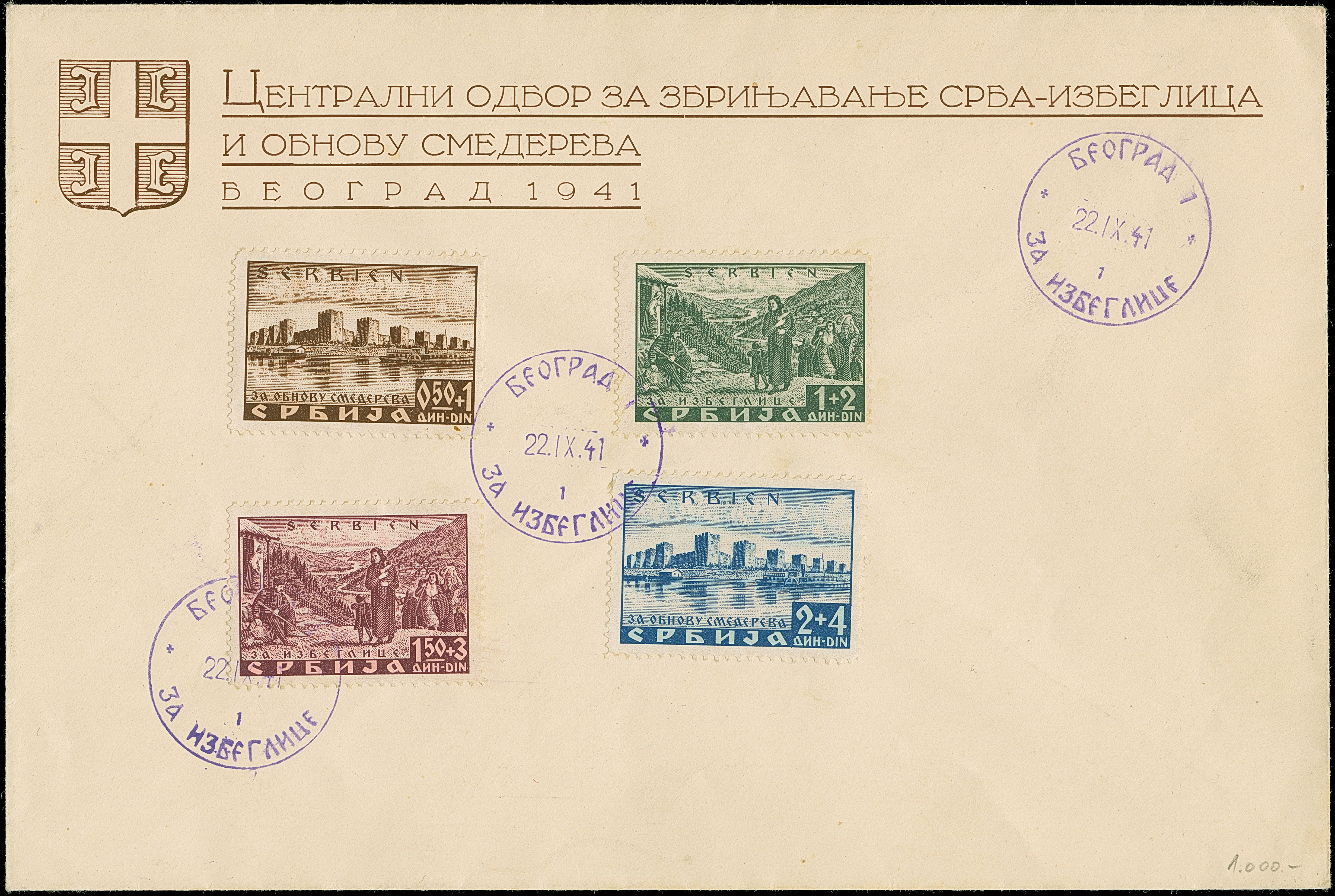 1941, Semendria 0,50+1 - 2+4 Dinar, 1+2 Dinar mit Plattenfehler “fehlendes S im kyrillischen Entwerferzeichen”, sauber mit violettem Ersttagsstempel “BEOGRAD 22.IX.41” auf Schmuckumschlag, tadellos, sign. Dr. Zydek BPP