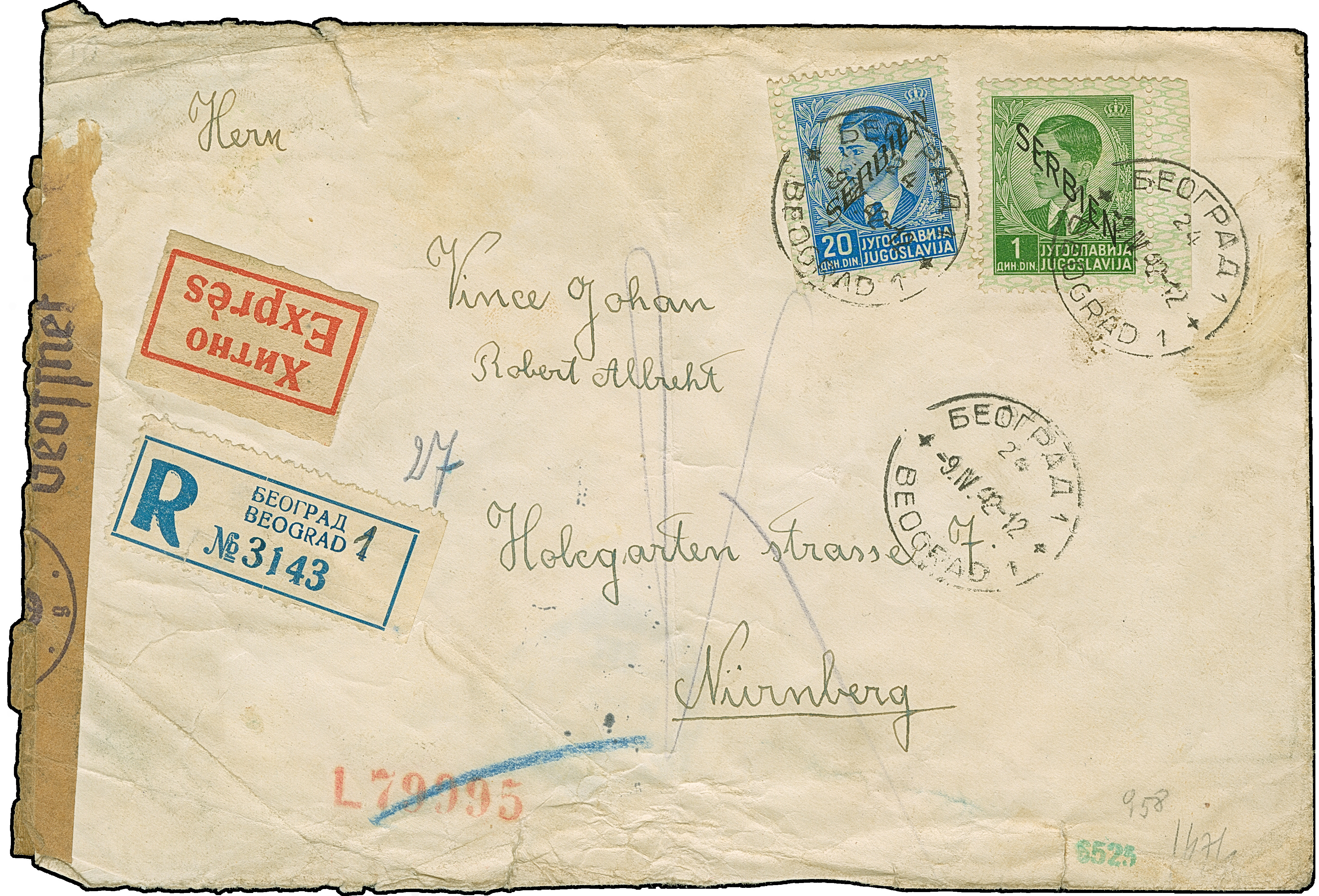 1941, König Peter II. 20 Dinar zusammen mit 1. Ausgabe König Peter II. 1 Dinar, mit Stempel “BEOGRAD -9.IV.42” auf portogerechtem Auslands-Eil-R-Brief der 3. Gewichtsstufe nach Nürnberg mit Ankunftsstempel, links mit Zensurbanderole, starke Beförderungsspuren, eine sehr seltene Frankatur, sign. Krischke