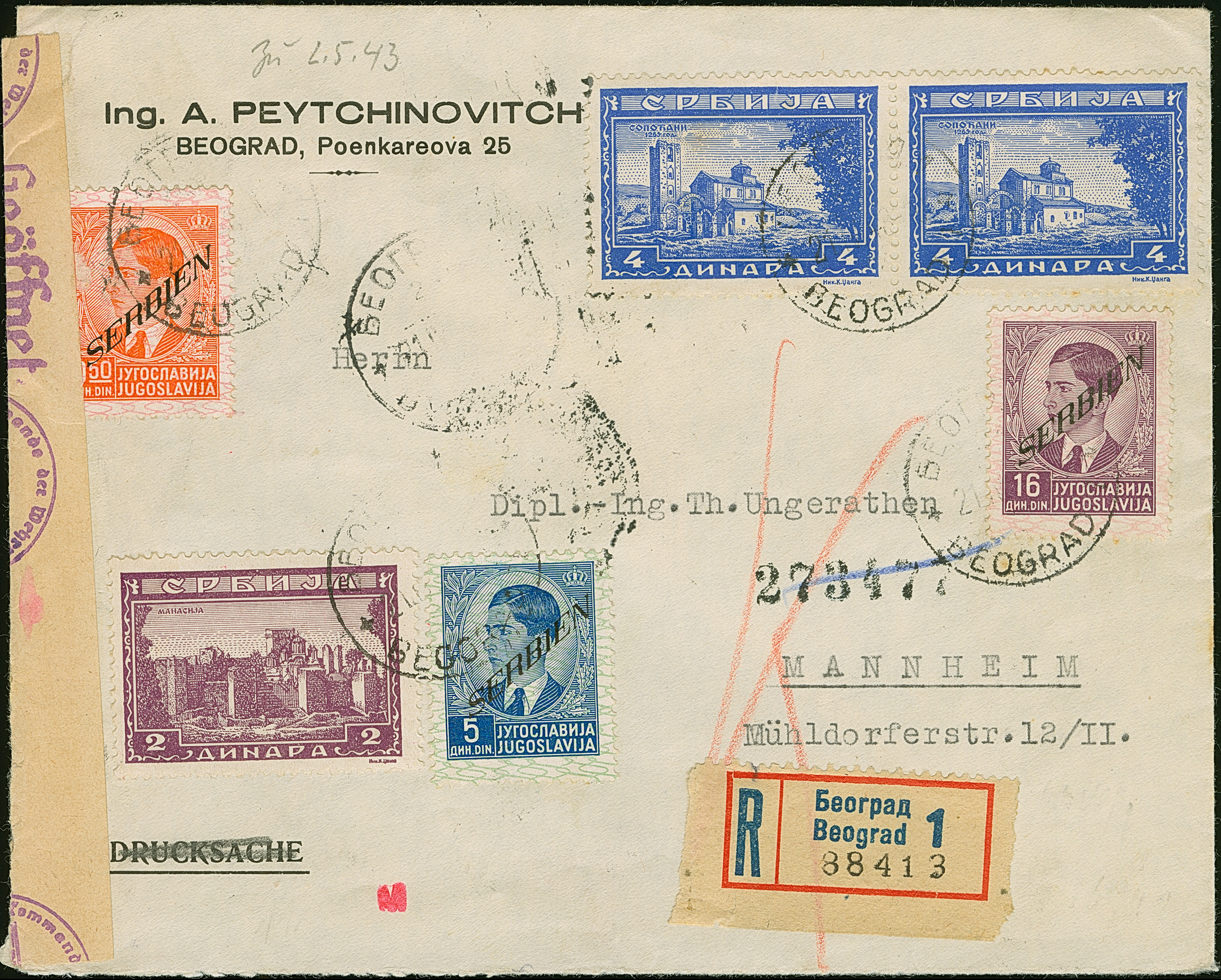 1941, König Peter II. 16 und 5 sowie 0,50 Dinar mit Zufrankatur mit Stempel “BEOGRAD 21.IV.43” auf R-Brief mit Zensurstreifen nach Mannheim mit Ankunftsstempel, winzig fleckig, sonst tadellos, Befund Kleymann BPP (2012)