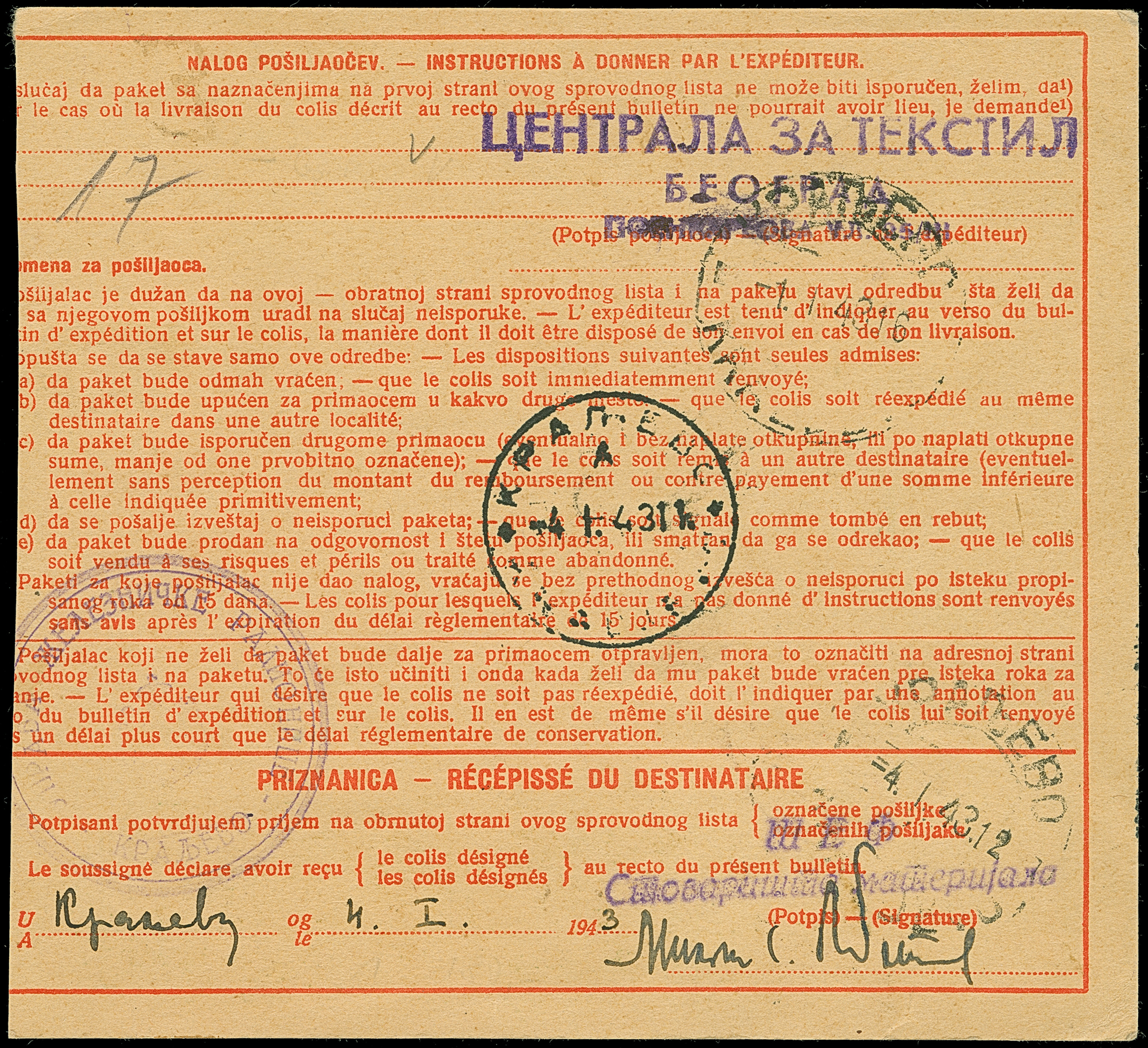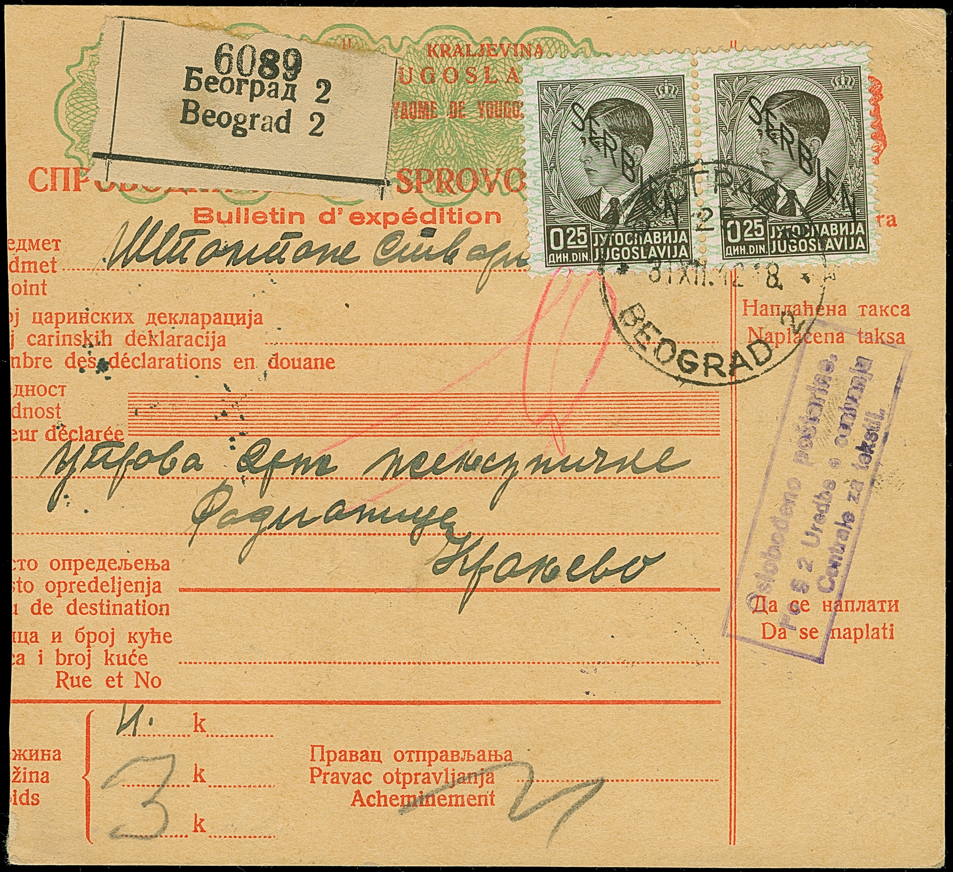 1941, König Peter II. 0,25 Dinar, waagerechtes Paar, sauber mit EKr. "BEOGRAD 2 31.12" auf Postformular mit Ra3 "Oslobeno postarine....Centrale za telstil." nach Kraljevo mit Ankunftsstempel, gute Erhaltung