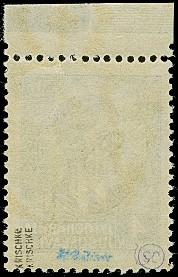 1941, 4 Dinar violettultramarin, ohne Netzüberdruck, Oberrandstück, postfrisch, kleine herstellungsbedingte Schramme, tadellos. Eine sehr seltene Marke, u.a. sign. Krischke sowie Befund Brunel (2013)