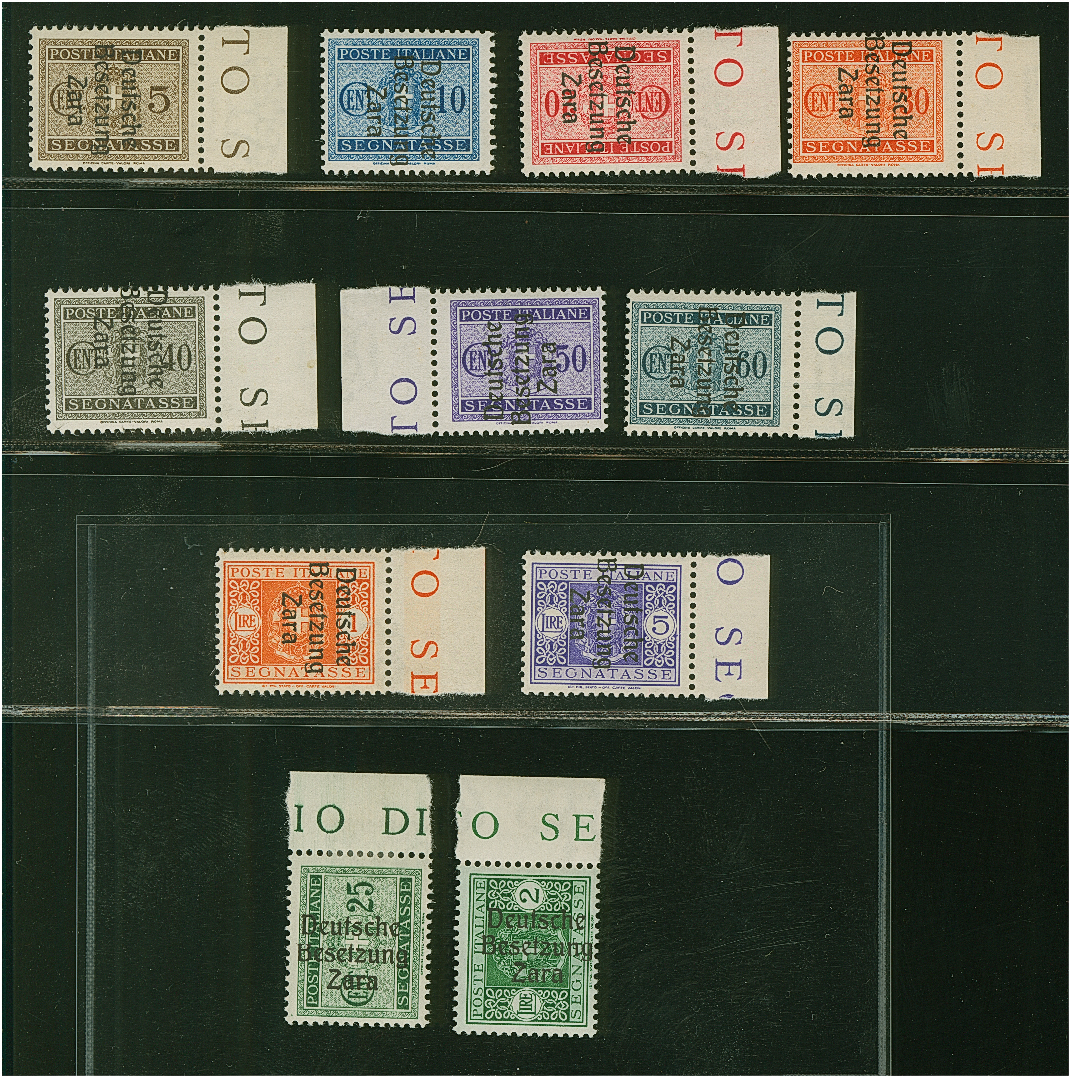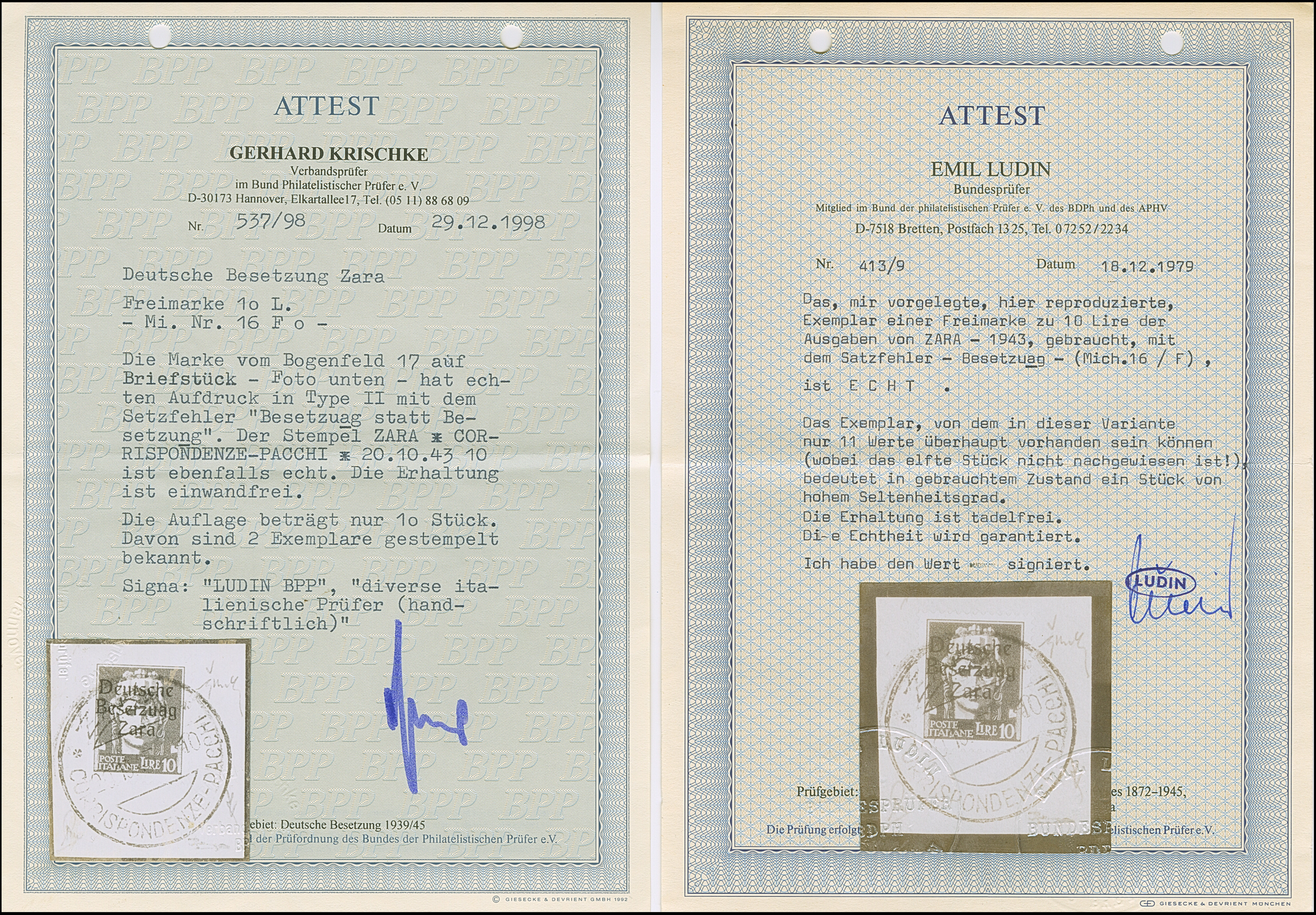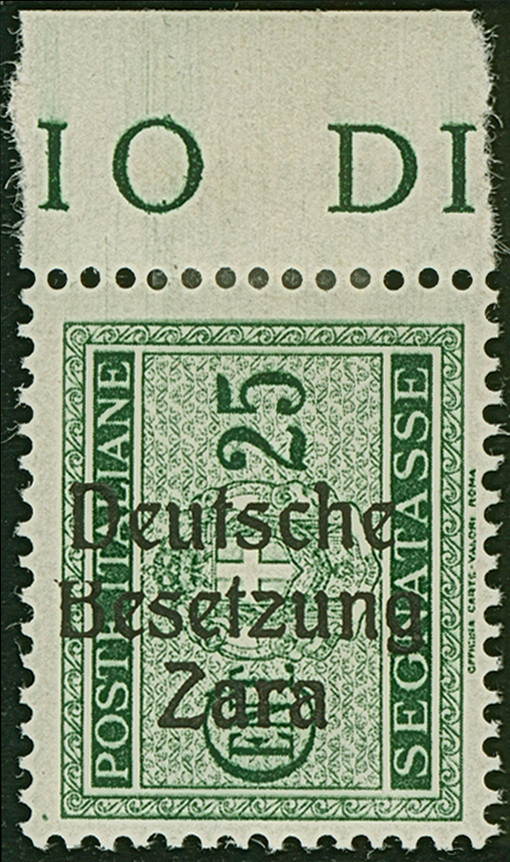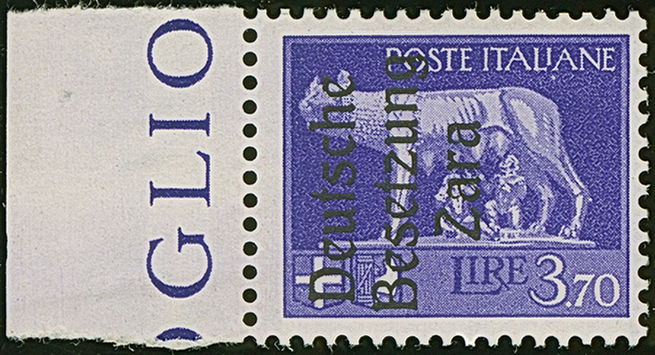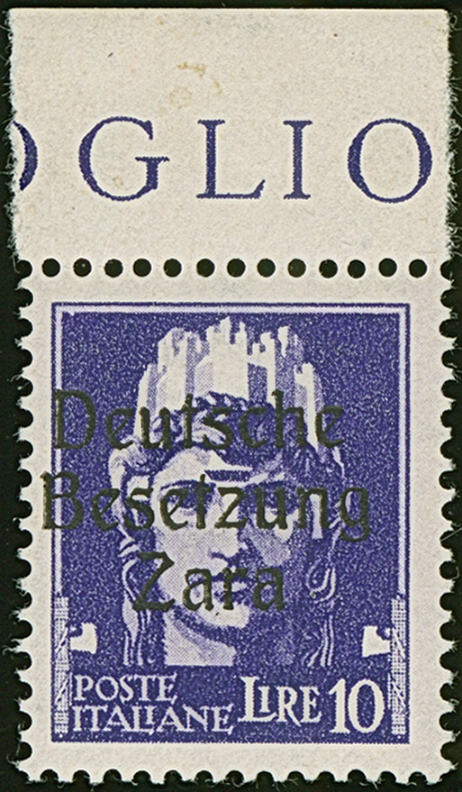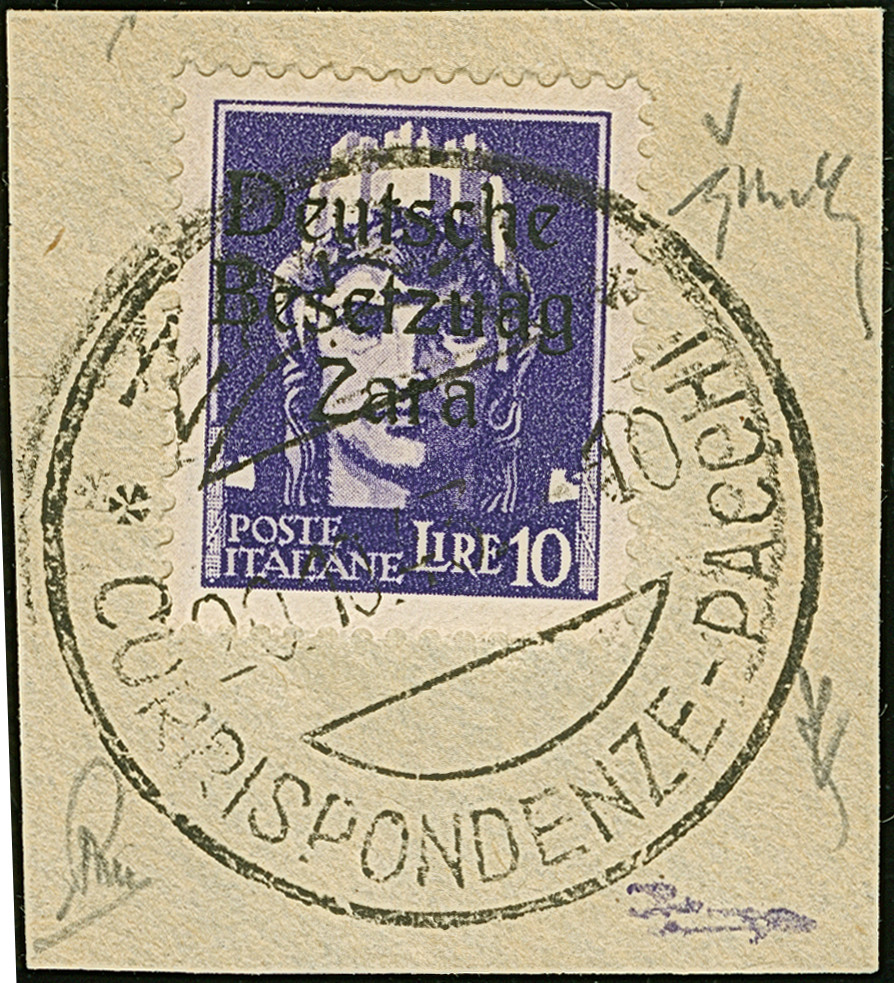 10 Lire dunkelbläulichviolett, mit Aufdruckfehler “Besetzuag” von Aufdruckfeld 17, farbfrisch und gut gezähnt, sauber mit Stempel “ZARA CORRISPONDENZE-PACCHI 20.10.43” auf Briefstück, tadellos. Eine der ganz großen Seltenheiten, bei einer möglichen Auflage von 10 Stück sind nur zwei gestempelte bekannt, u.a. sign. Ludin BPP mit Fotoattest (1979) sowie Fotoattest Krischke BPP (1998)