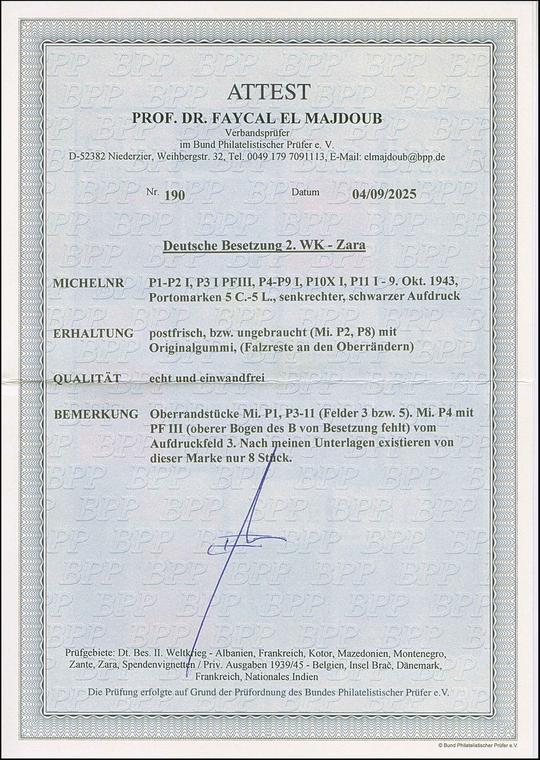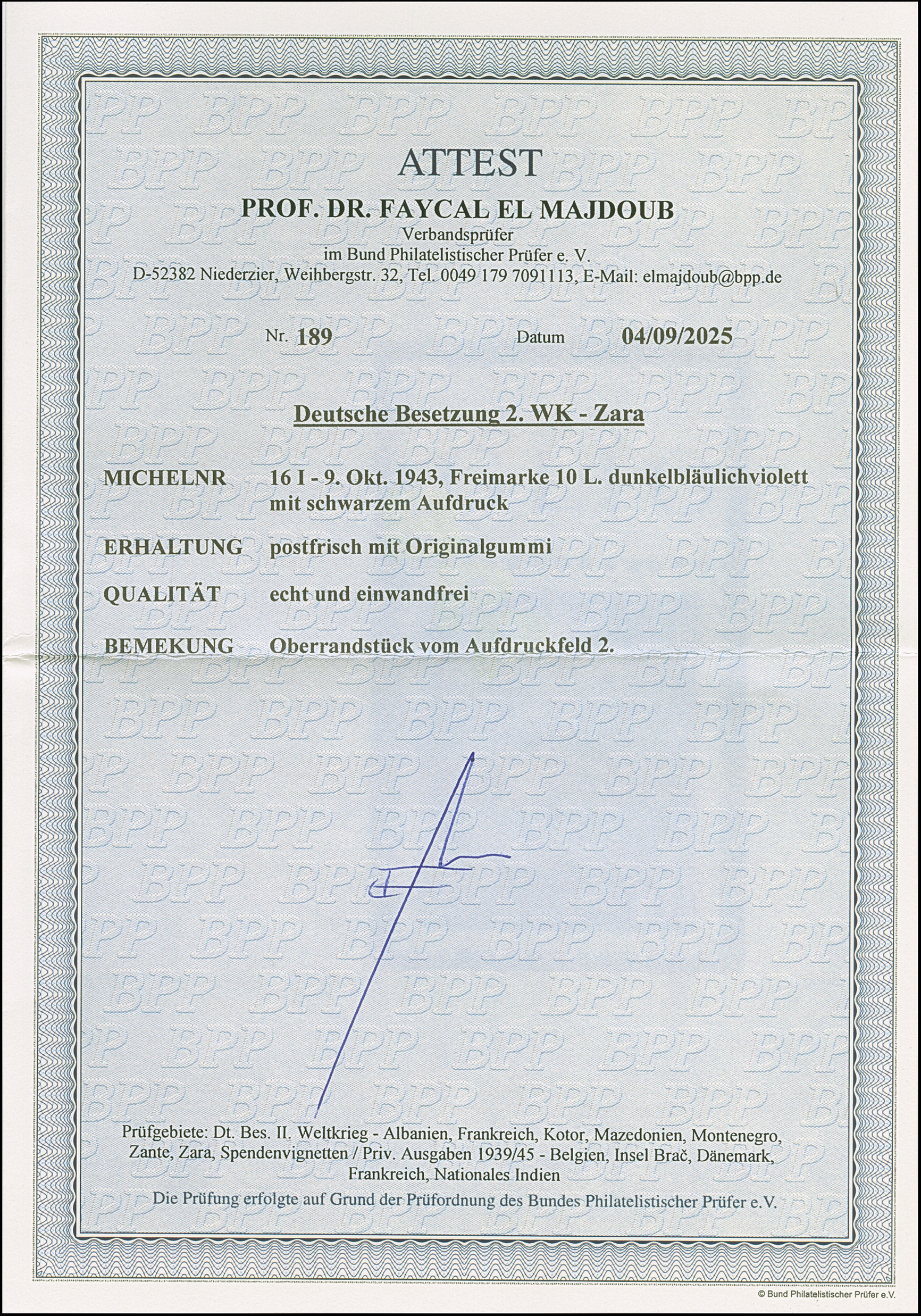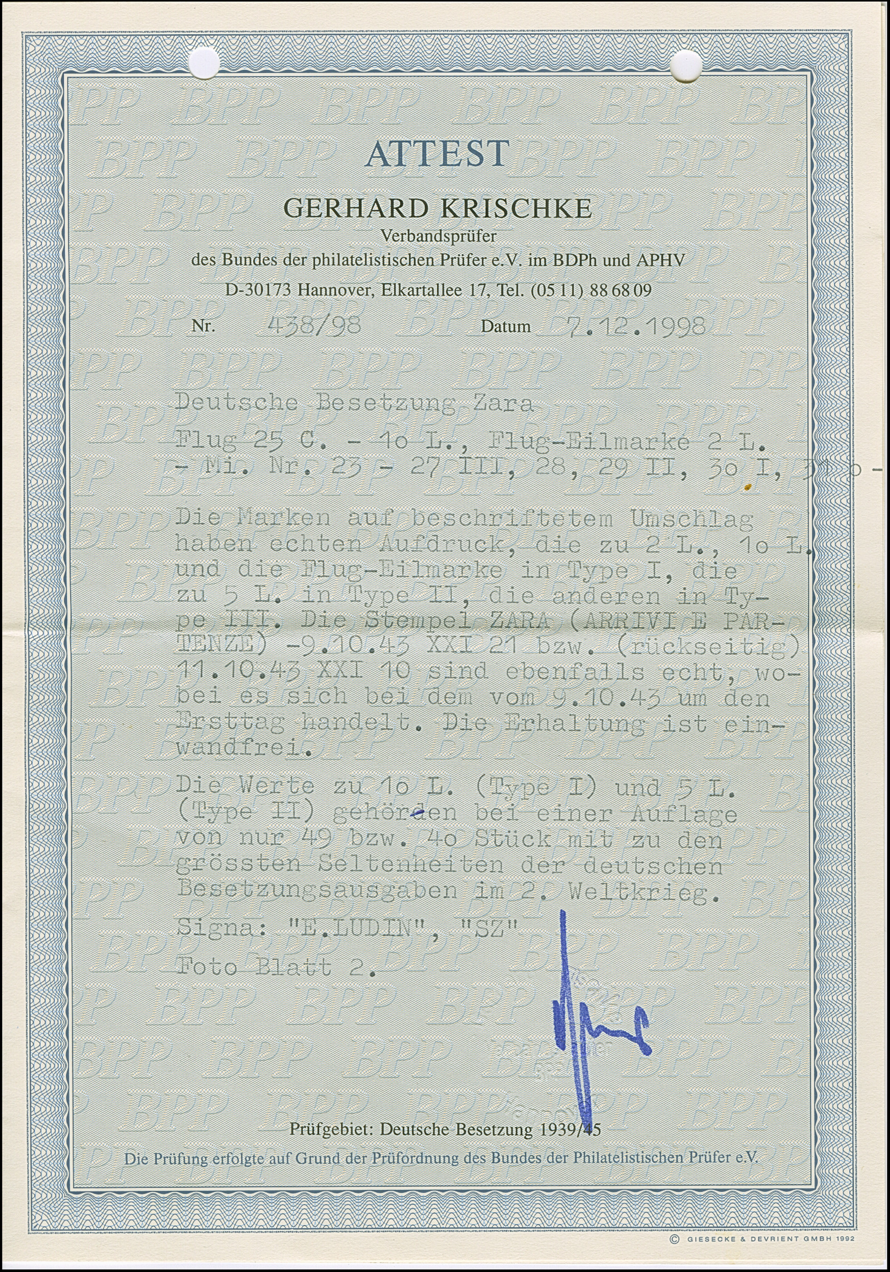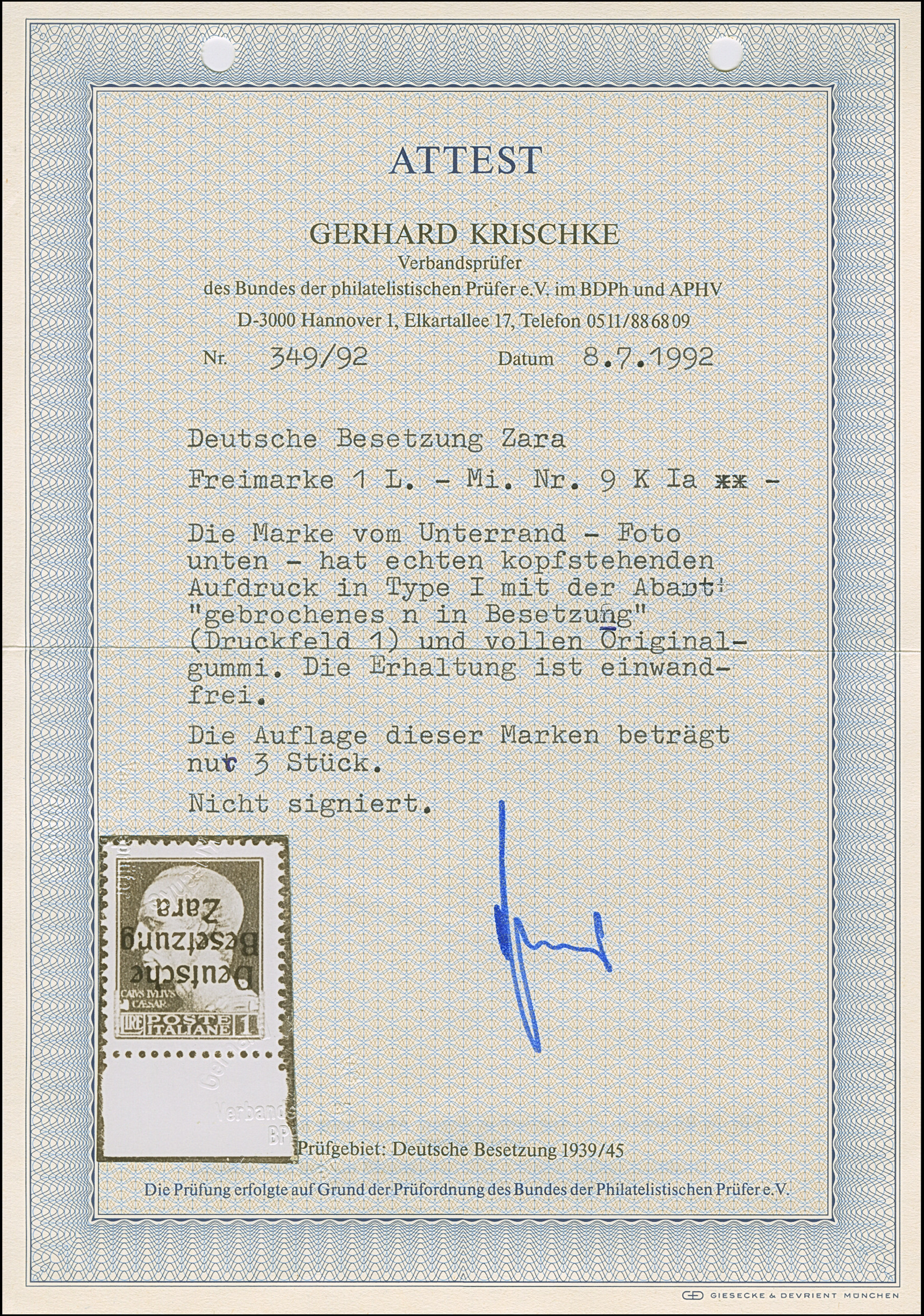 10 Lire dunkelbläulichviolett, mit Aufdruckfehler “Besetzuag” von Aufdruckfeld 17, farbfrisch und gut gezähnt, sauber mit Stempel “ZARA CORRISPONDENZE-PACCHI 20.10.43” auf Briefstück, tadellos. Eine der ganz großen Seltenheiten, bei einer möglichen Auflage von 10 Stück sind nur zwei gestempelte bekannt, u.a. sign. Ludin BPP mit Fotoattest (1979) sowie Fotoattest Krischke BPP (1998)