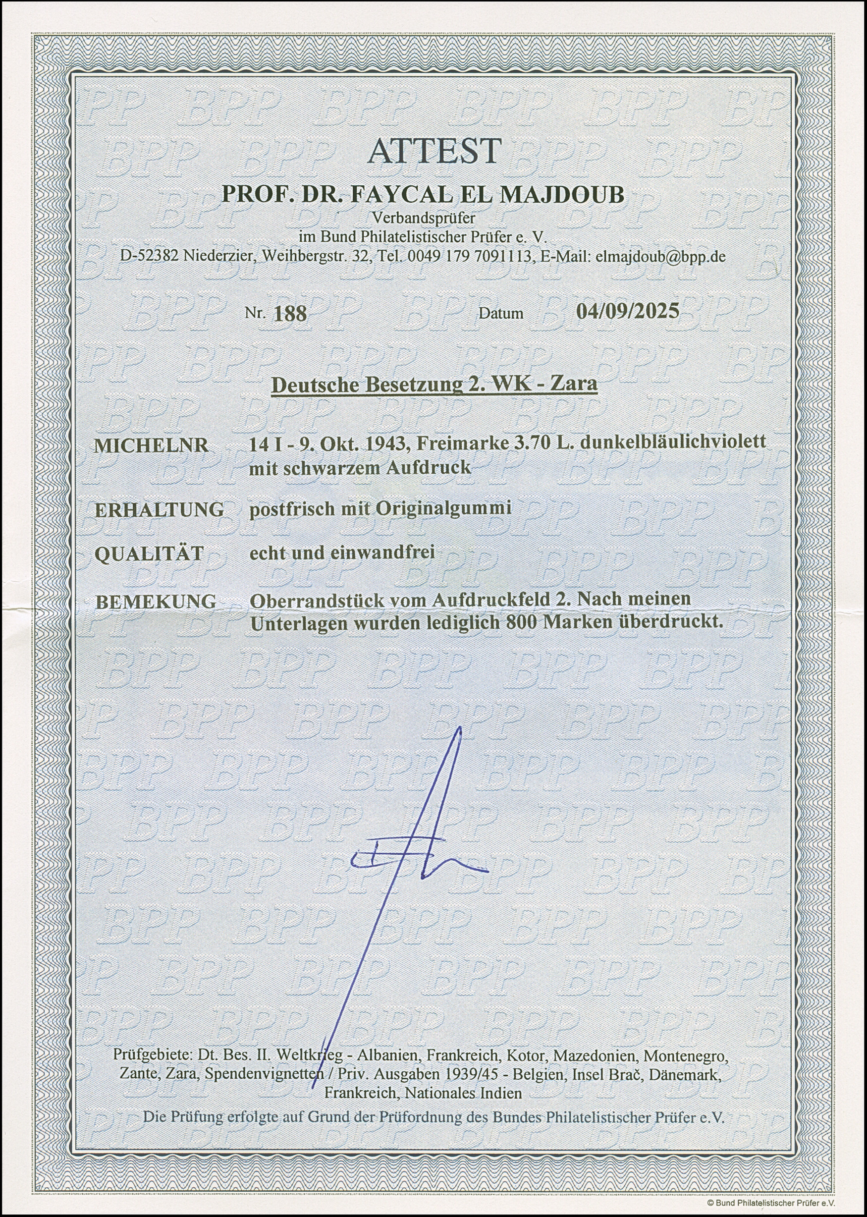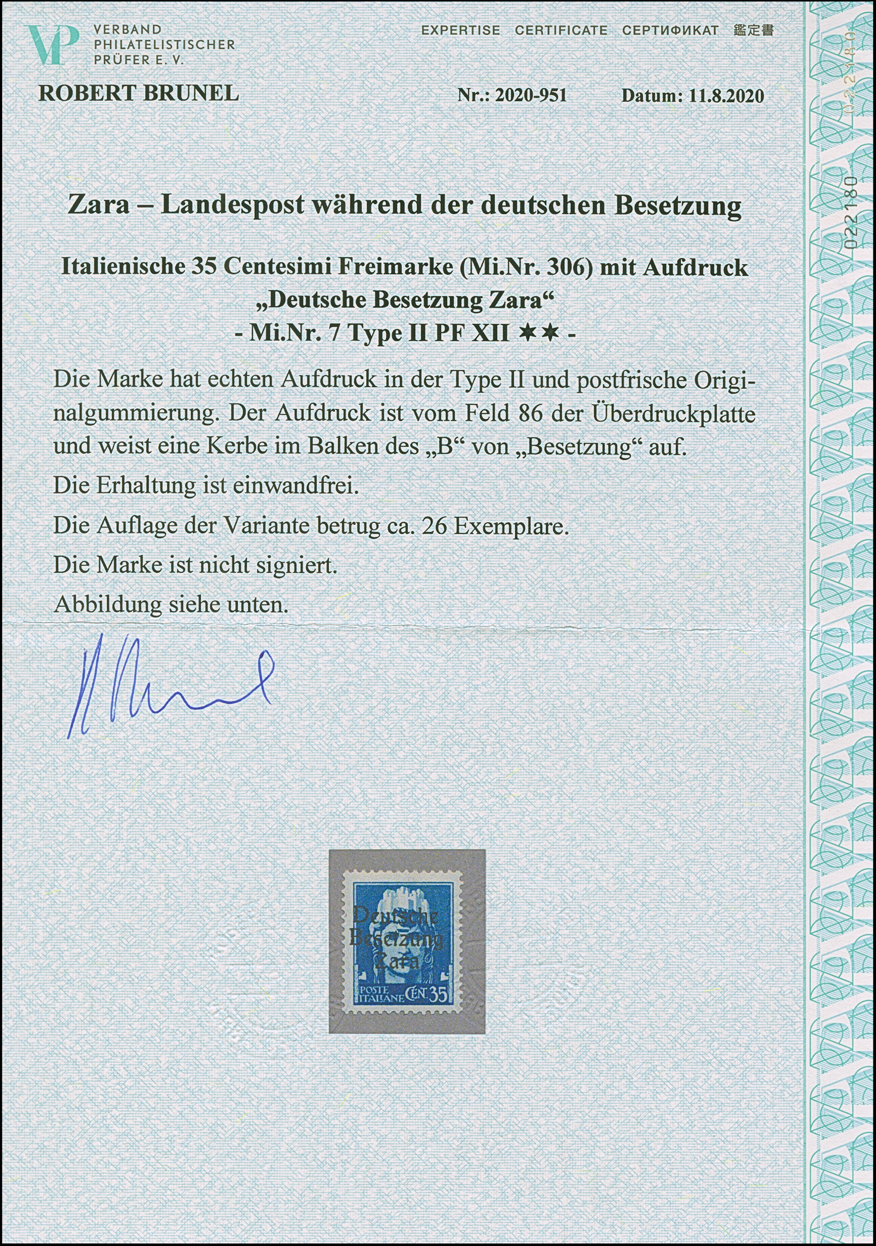 1943, 2L., von Aufdruckfeld 100 mit Aufdruckfehler "zweites a in Zara fett”, postfrisch, sehr selten mit einer Auflage von lediglich 10 Stück, tadellos, u.a. Bleistiftbestimmung und sign. Ludin BPP