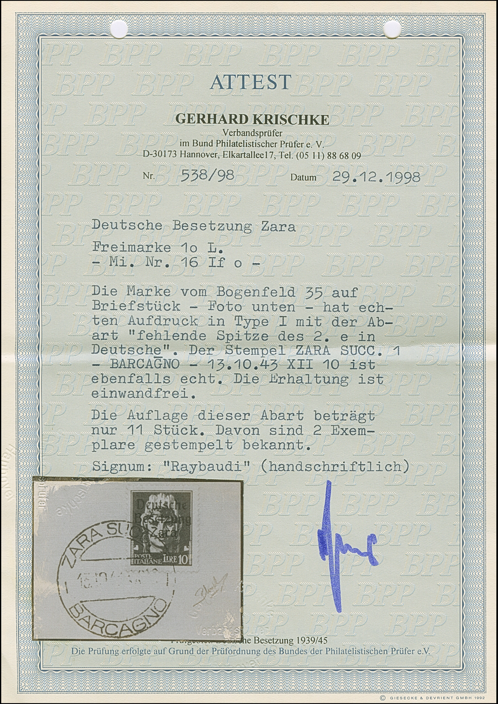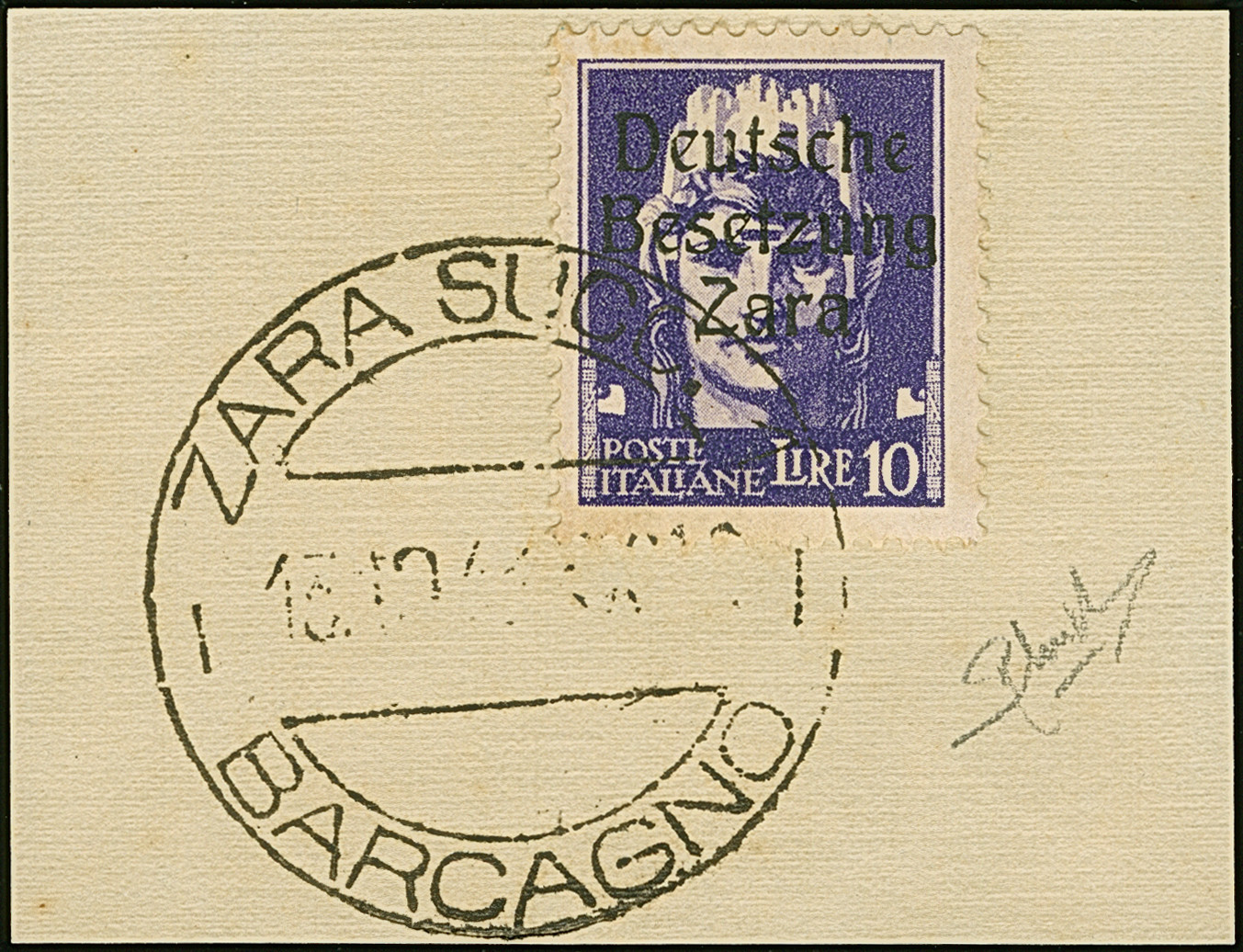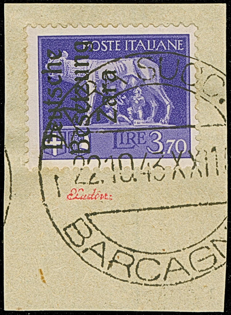 10 Lire dunkelbläulichviolett, mit Aufdruckfehler “fehlende Spitze des zweiten e in Deutsche” von Aufdruckfeld 35, farbfrisch und gut gezähnt, sauber mit Stempel “ZARA BARCAGNO 13.10.43” auf Briefstück, tadellos. Eine der ganz großen Seltenheiten, bei einer möglichen Auflage von 10 Stück sind nur zwei gestempelte bekannt, sign. Raybaudi sowie Fotoattest Krischke BPP (1998)