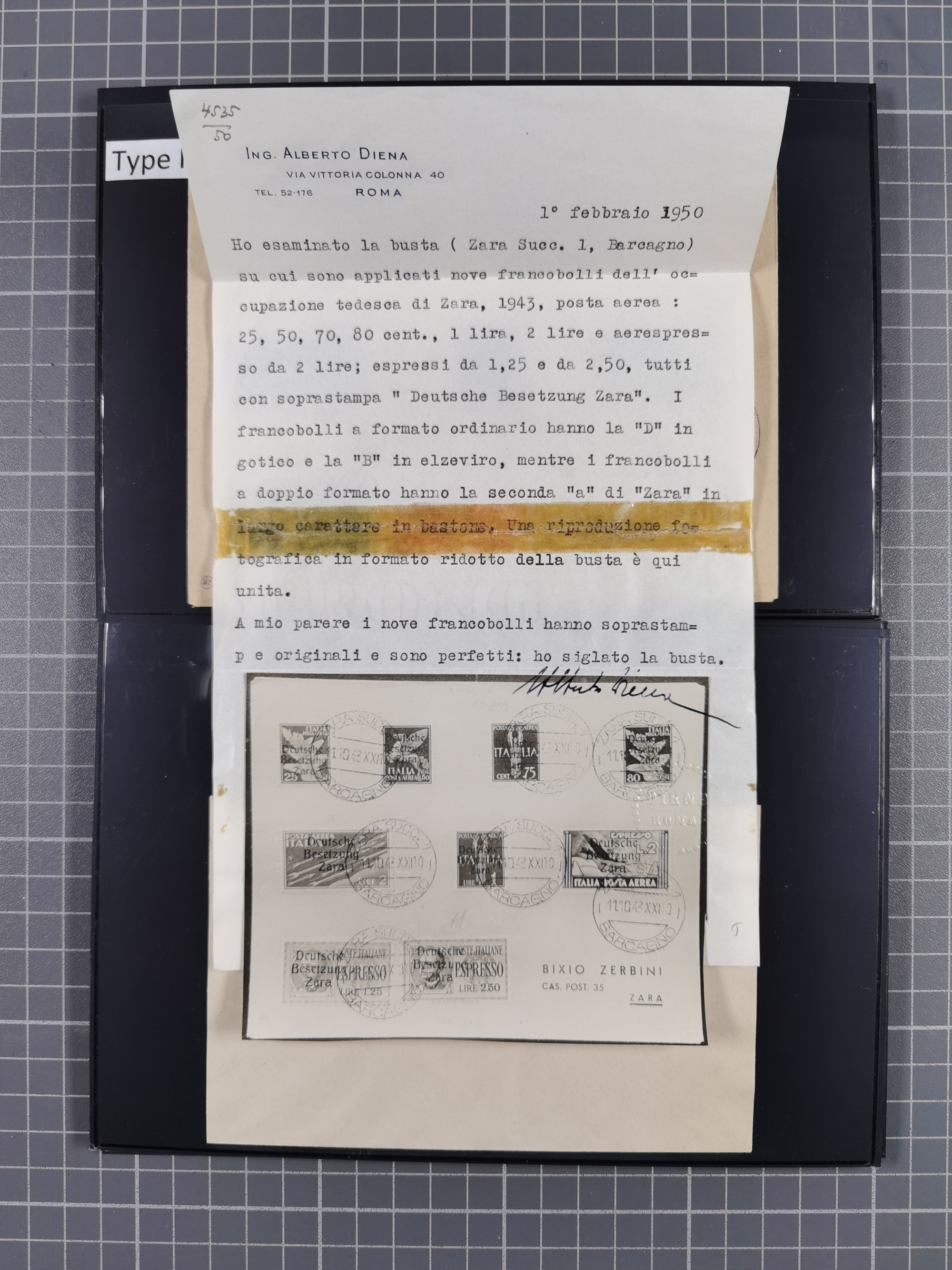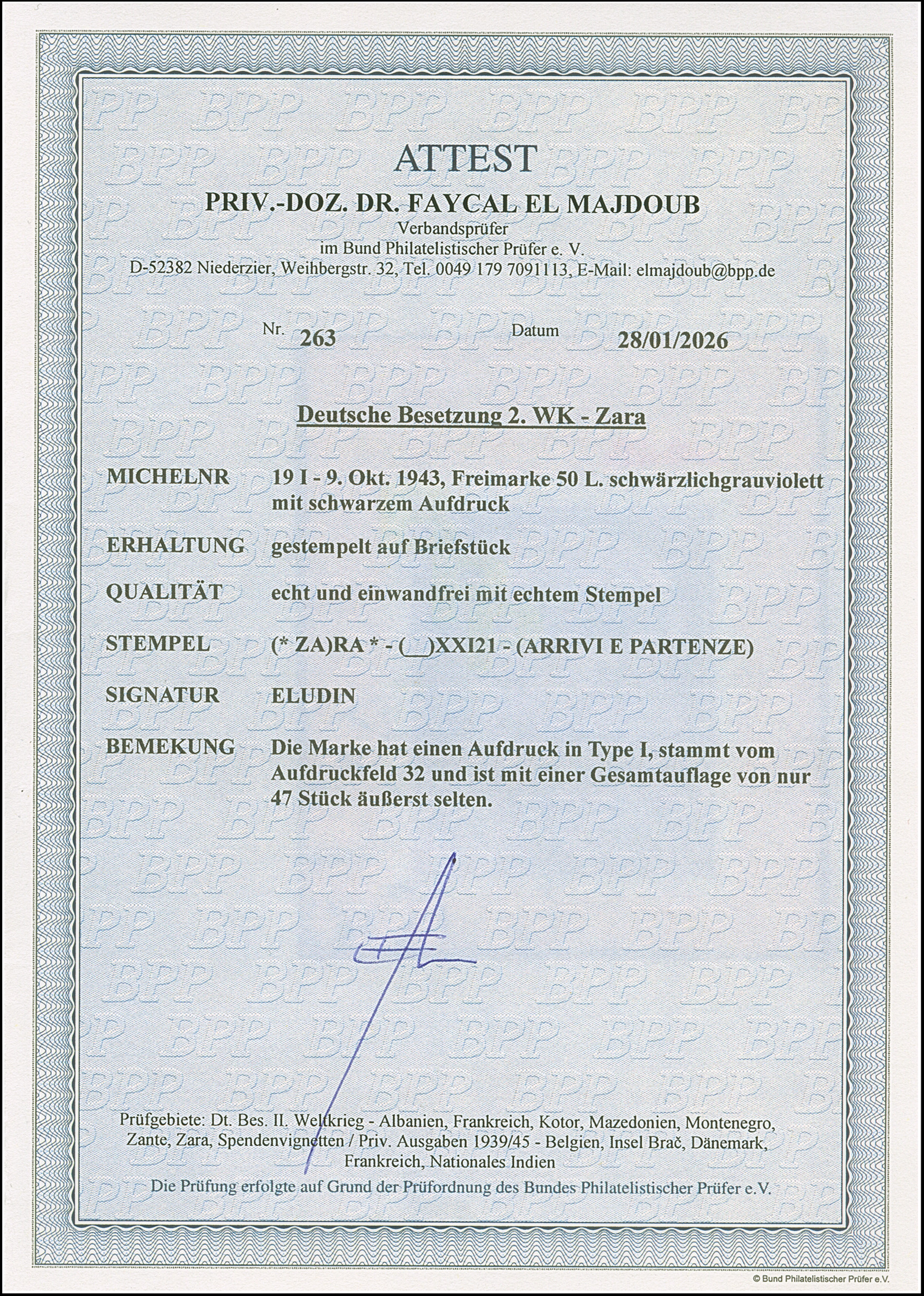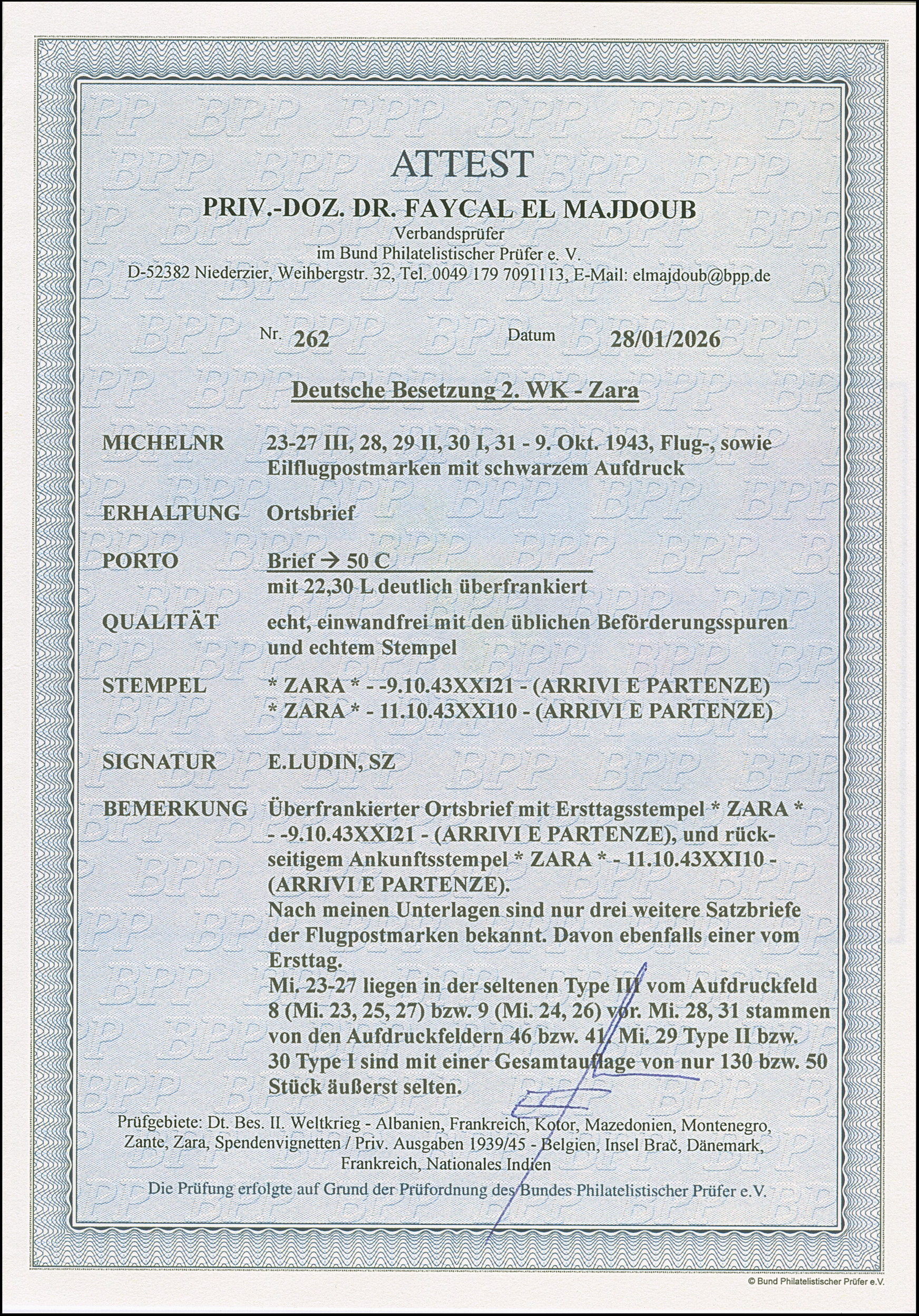 50 Lire schwärzlichgrauviolett, farbfrisch und gut gezähnt, sauber mit Teil-Ersttagsstempel “ZARA /ARRIVE E PARTENZE -9.10.43)” auf Briefstück, tadellos. Eine der ganz großen Seltenheiten der Besetzungsausgaben, Gesamtauflage über alle Typen nur 47 Stück, das Gros davon ist ungebraucht bzw. postfrisch registriert, in gestempelter Erhaltung hat ProFi lediglich 3 Stück registriert, sign. ELudin sowie Fotoattest El Majdoub BPP (2026)