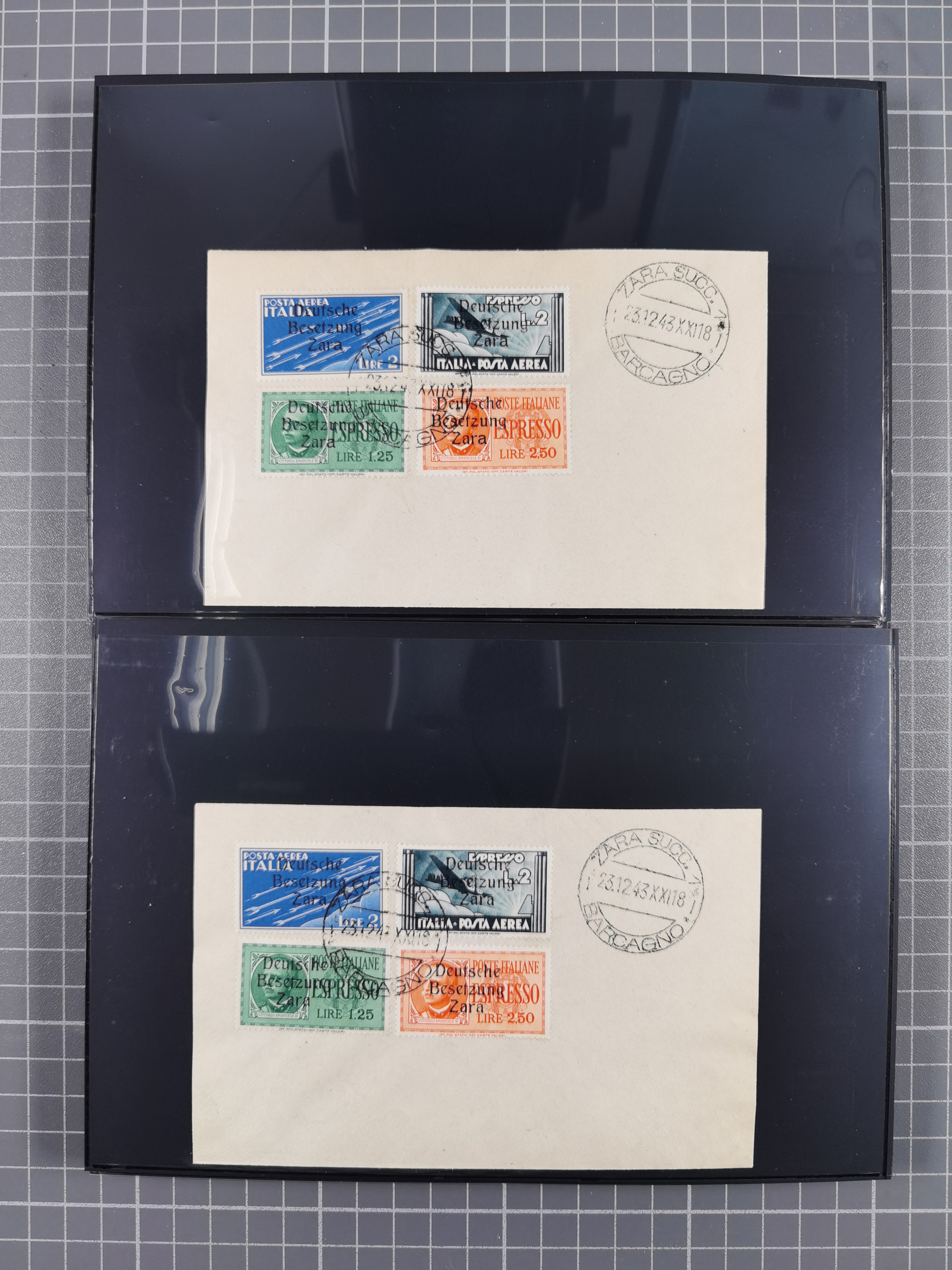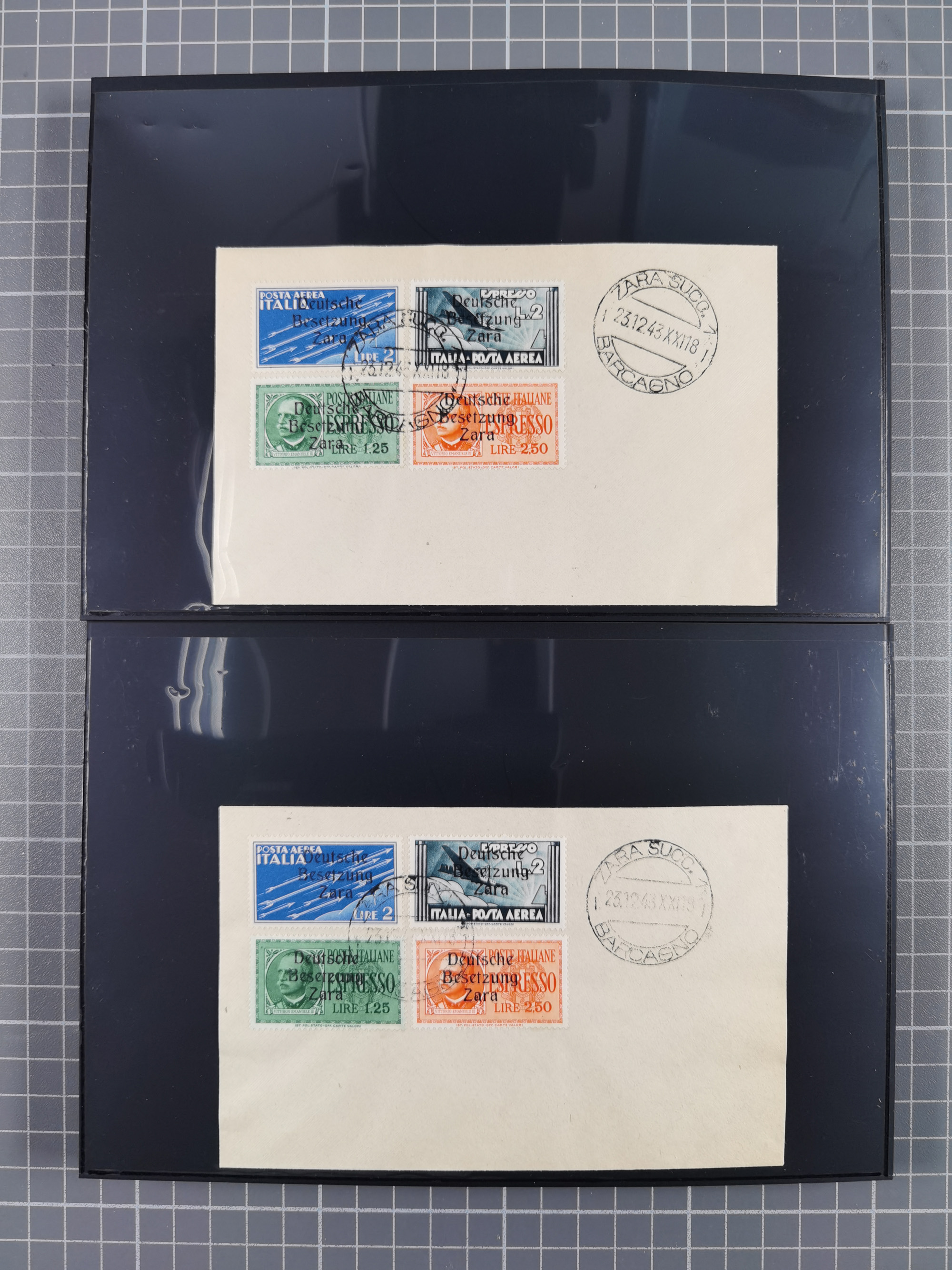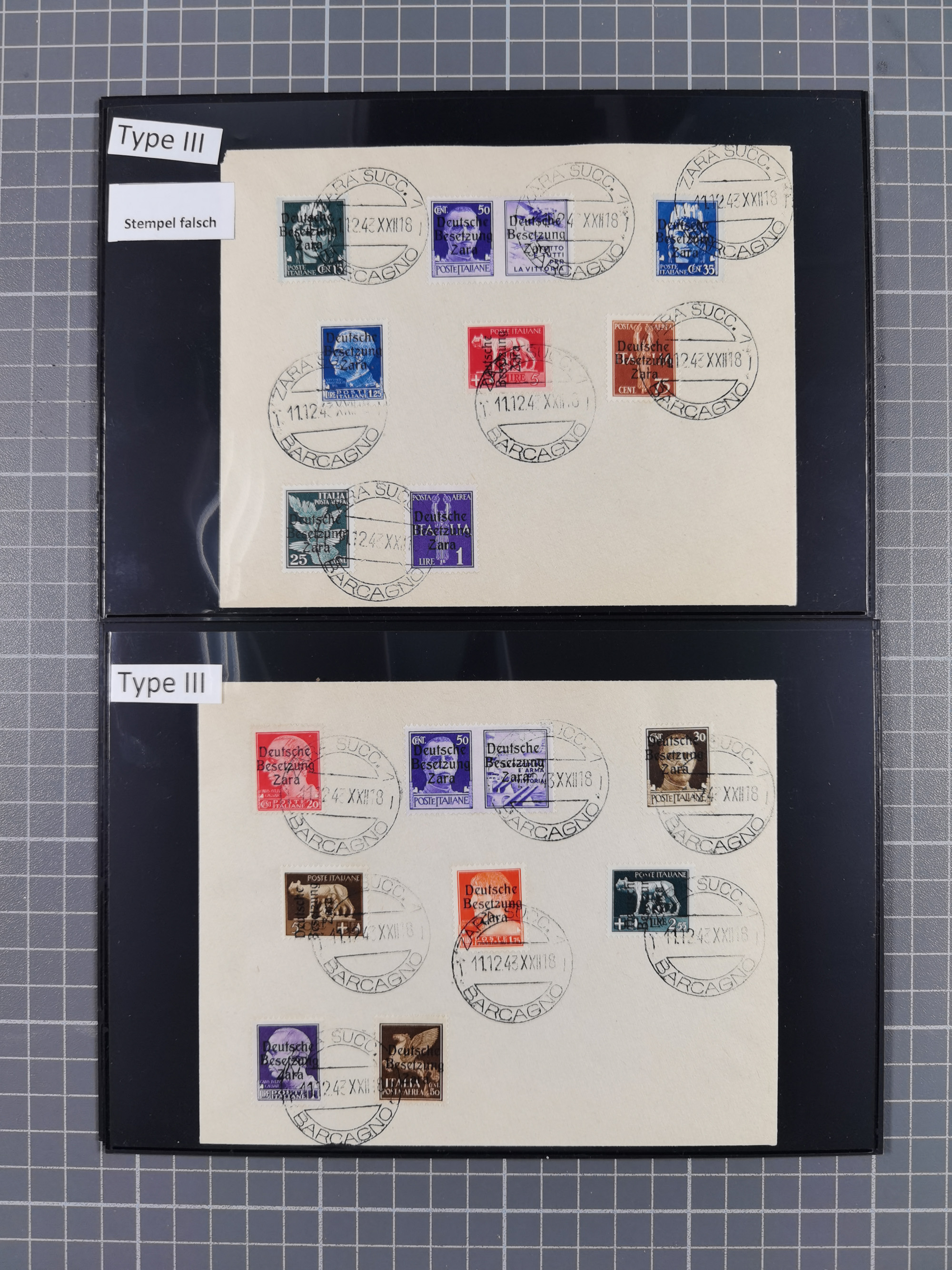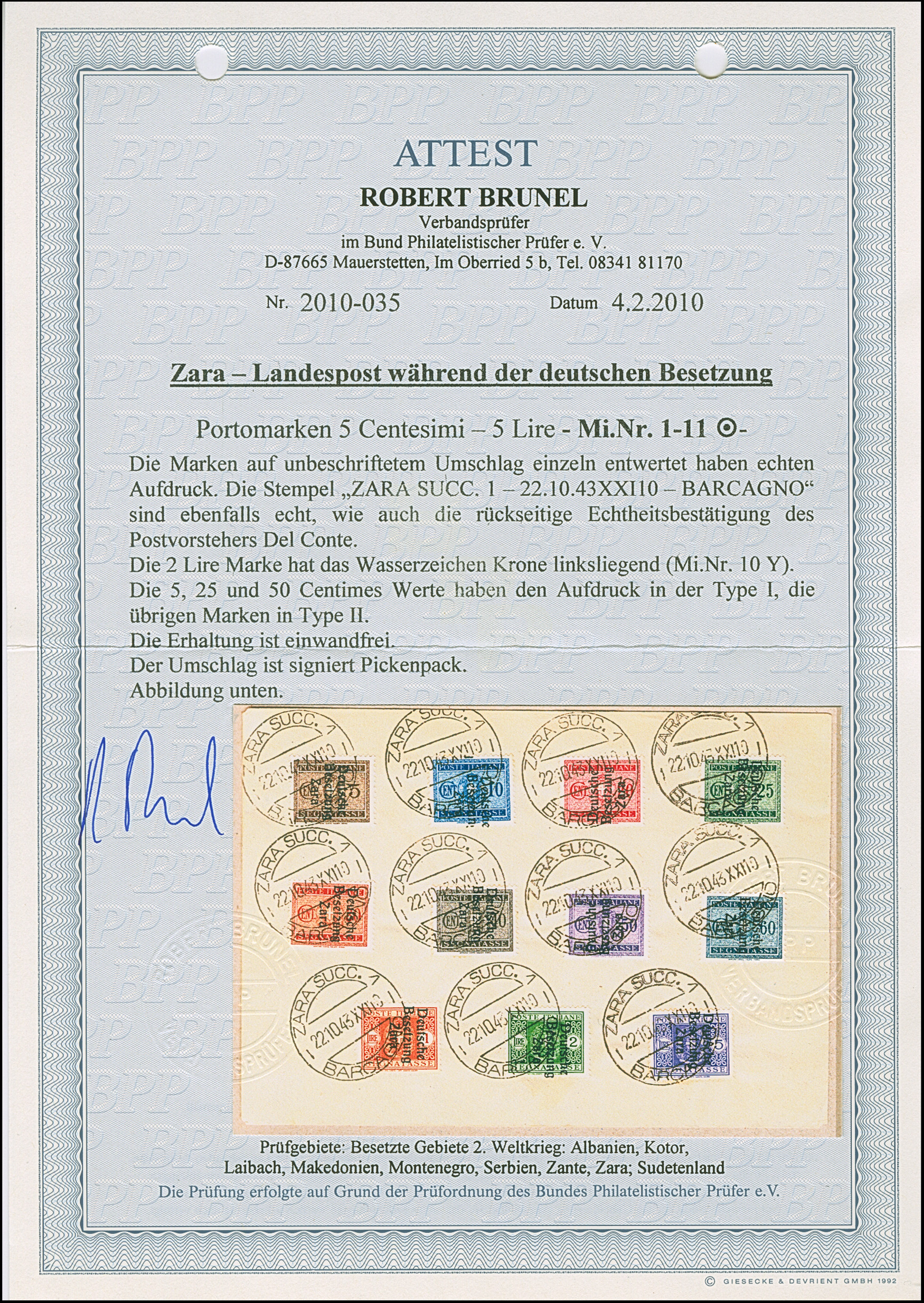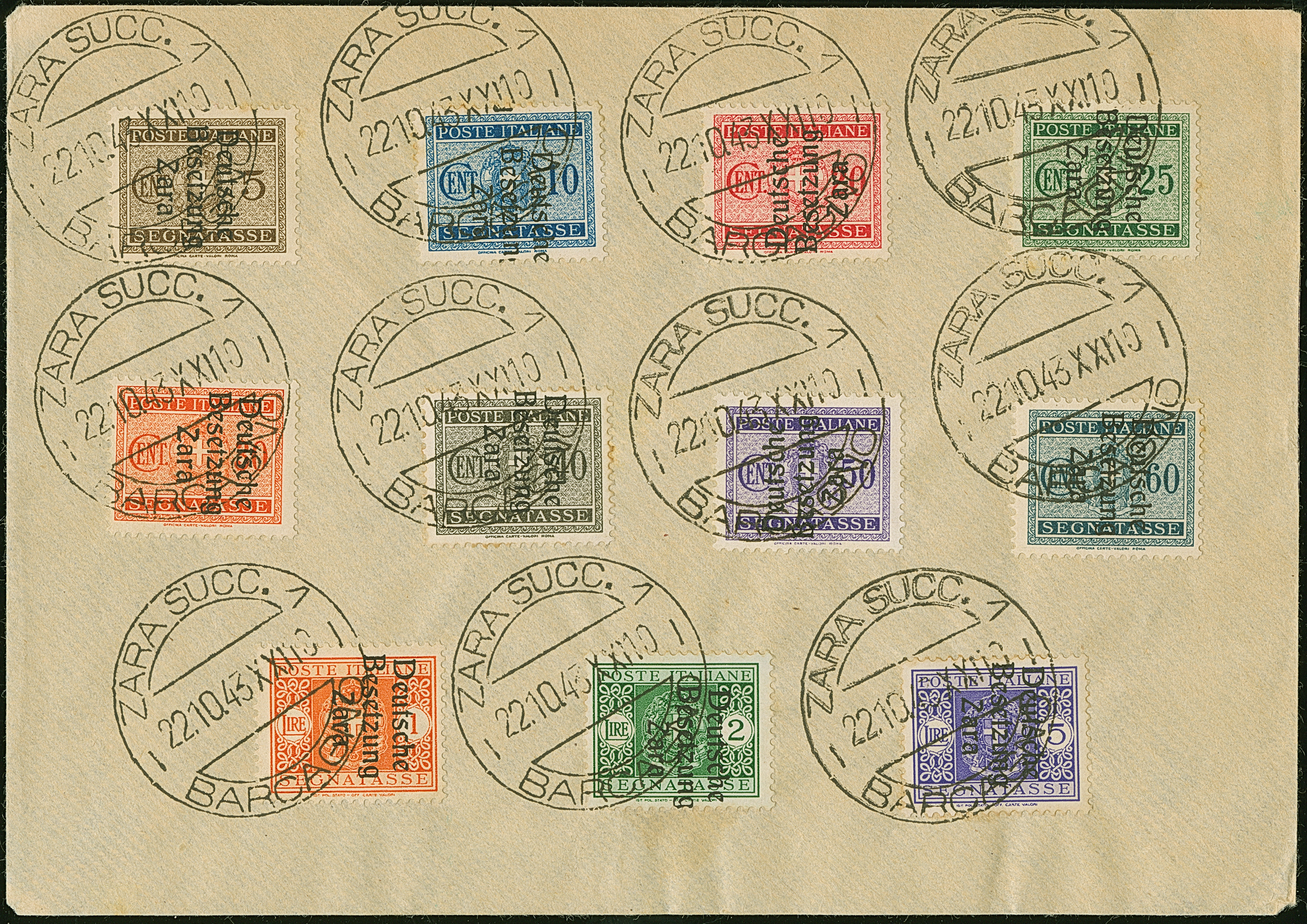 1943, 5 Centesimi - 5 Lire, je sauber mit Stempel “ZARA SUCC. 1 22.10.43” auf Blanko-Umschlag, 5,25 und 50 Centesimi in Aufdrucktype I, sonst Aufdrucktype II, 2 Lire mit linksliegendem Wasserzeichen, 5-10, 25, 40 und 60 Centesimi winzig fleckig, sonst tadellos, sign. Pickenpack sowie Fotoattest Brunel BPP (2010)