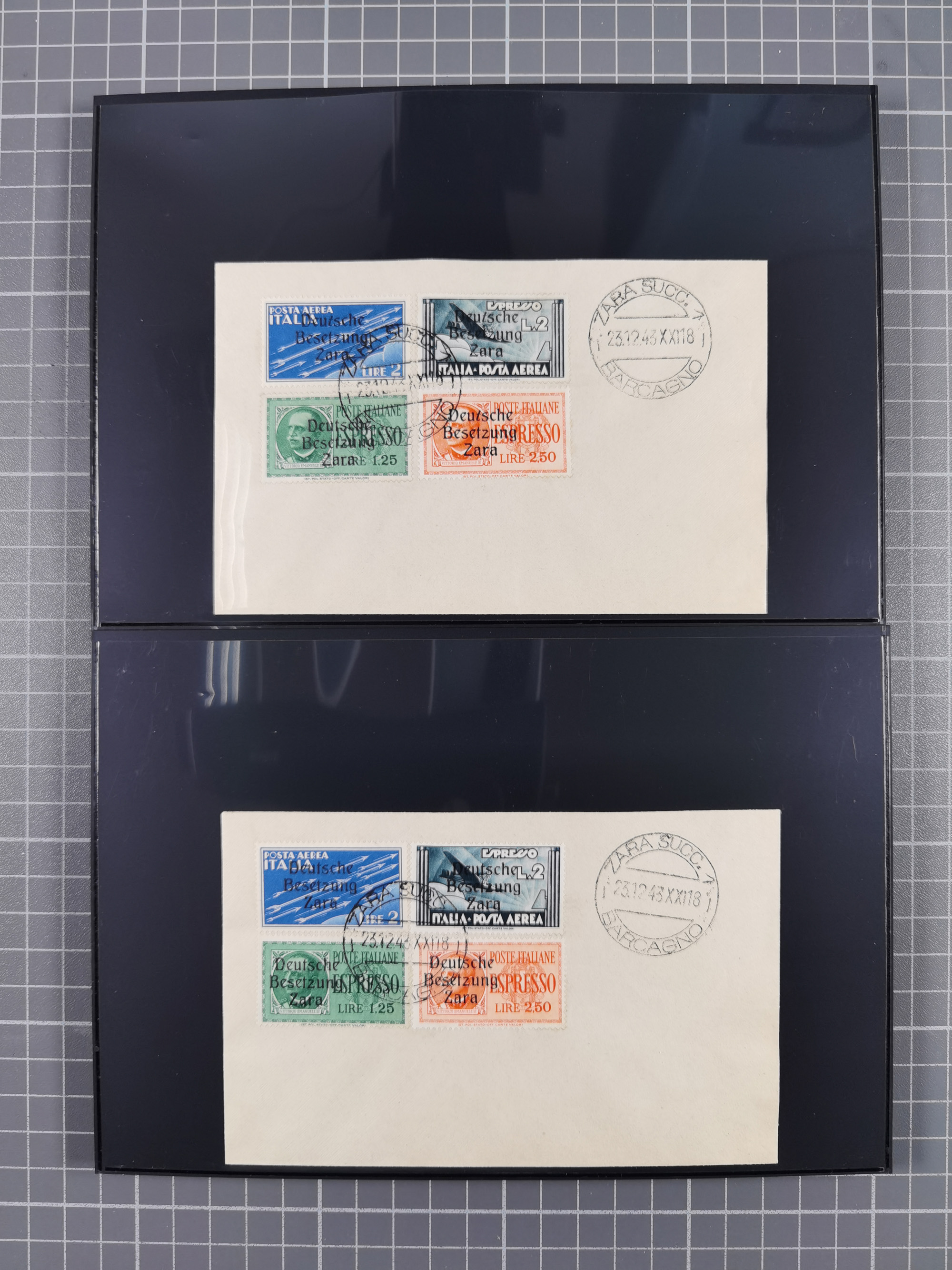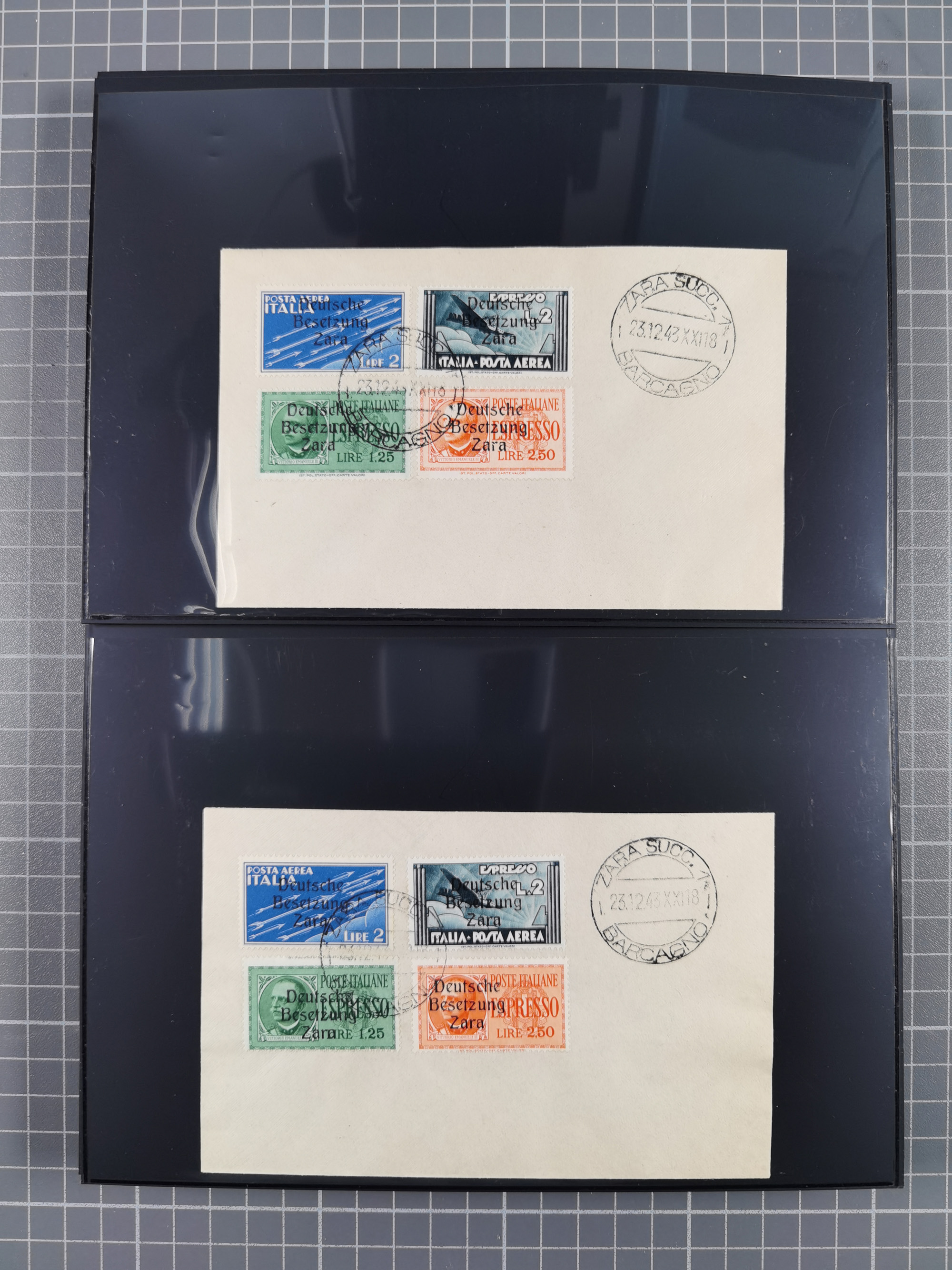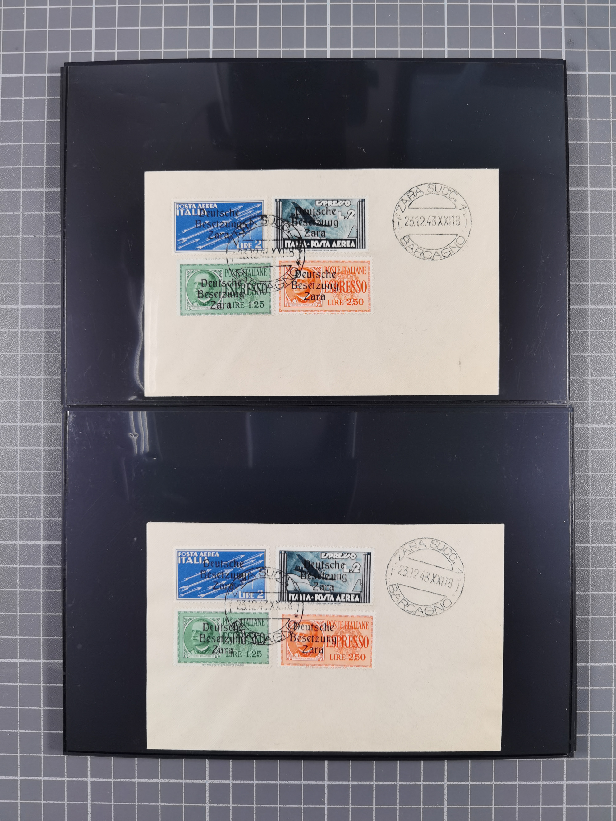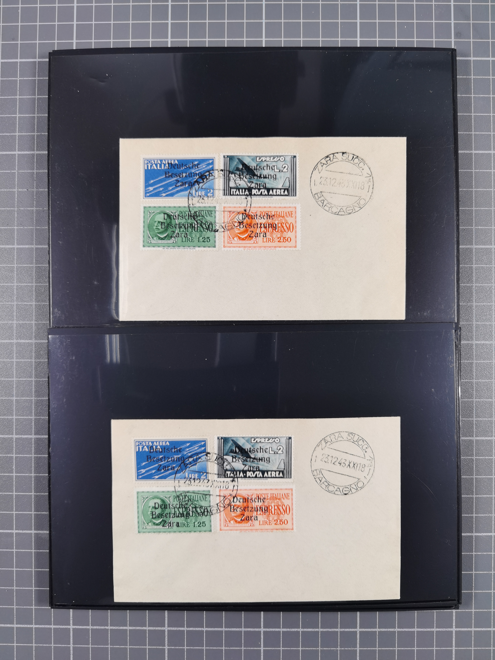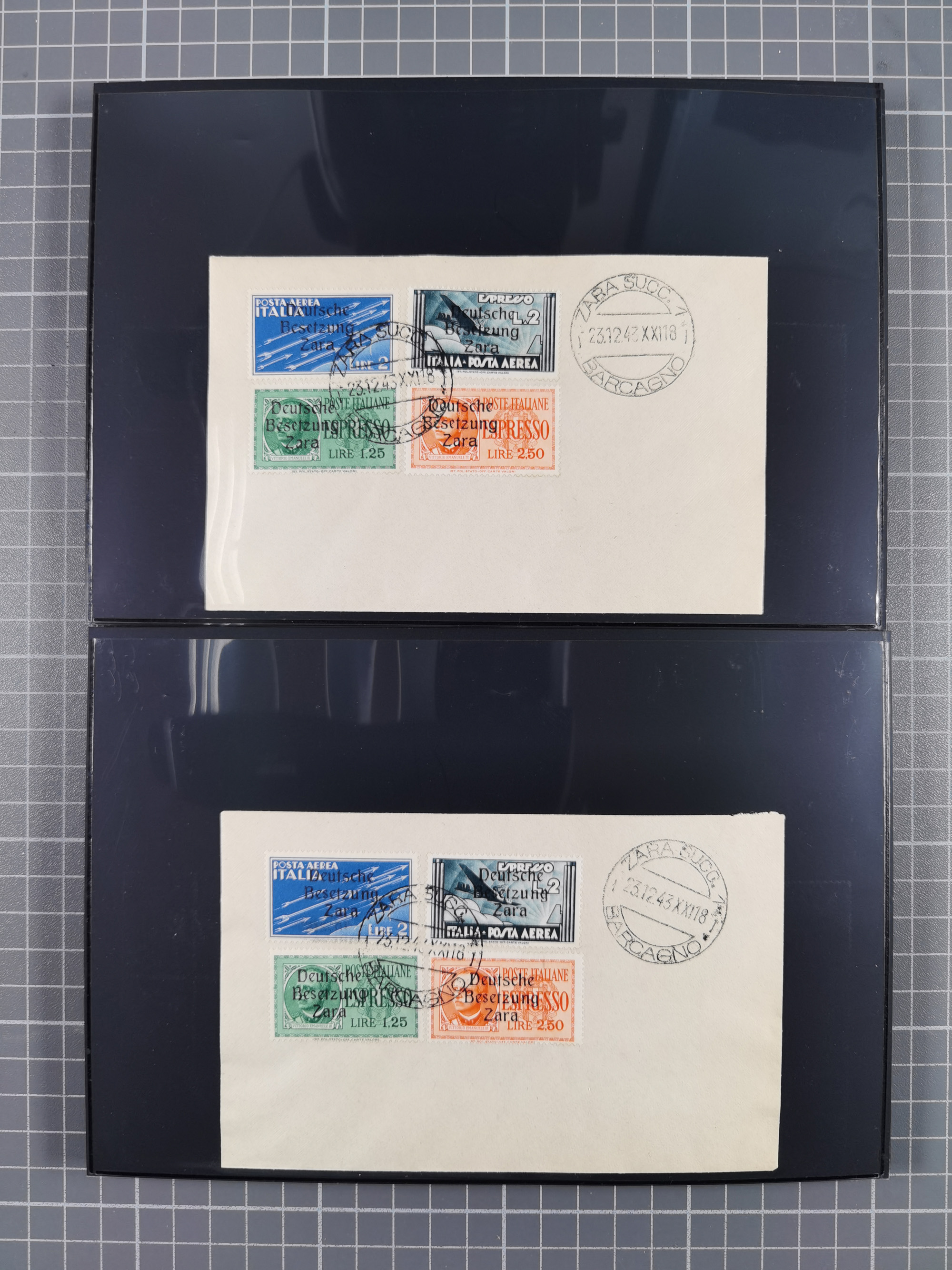 1943, 5 Centesimi - 5 Lire, je sauber mit Stempel “ZARA SUCC. 1 22.10.43” auf Blanko-Umschlag, 5,25 und 50 Centesimi in Aufdrucktype I, sonst Aufdrucktype II, 2 Lire mit linksliegendem Wasserzeichen, 5-10, 25, 40 und 60 Centesimi winzig fleckig, sonst tadellos, sign. Pickenpack sowie Fotoattest Brunel BPP (2010)