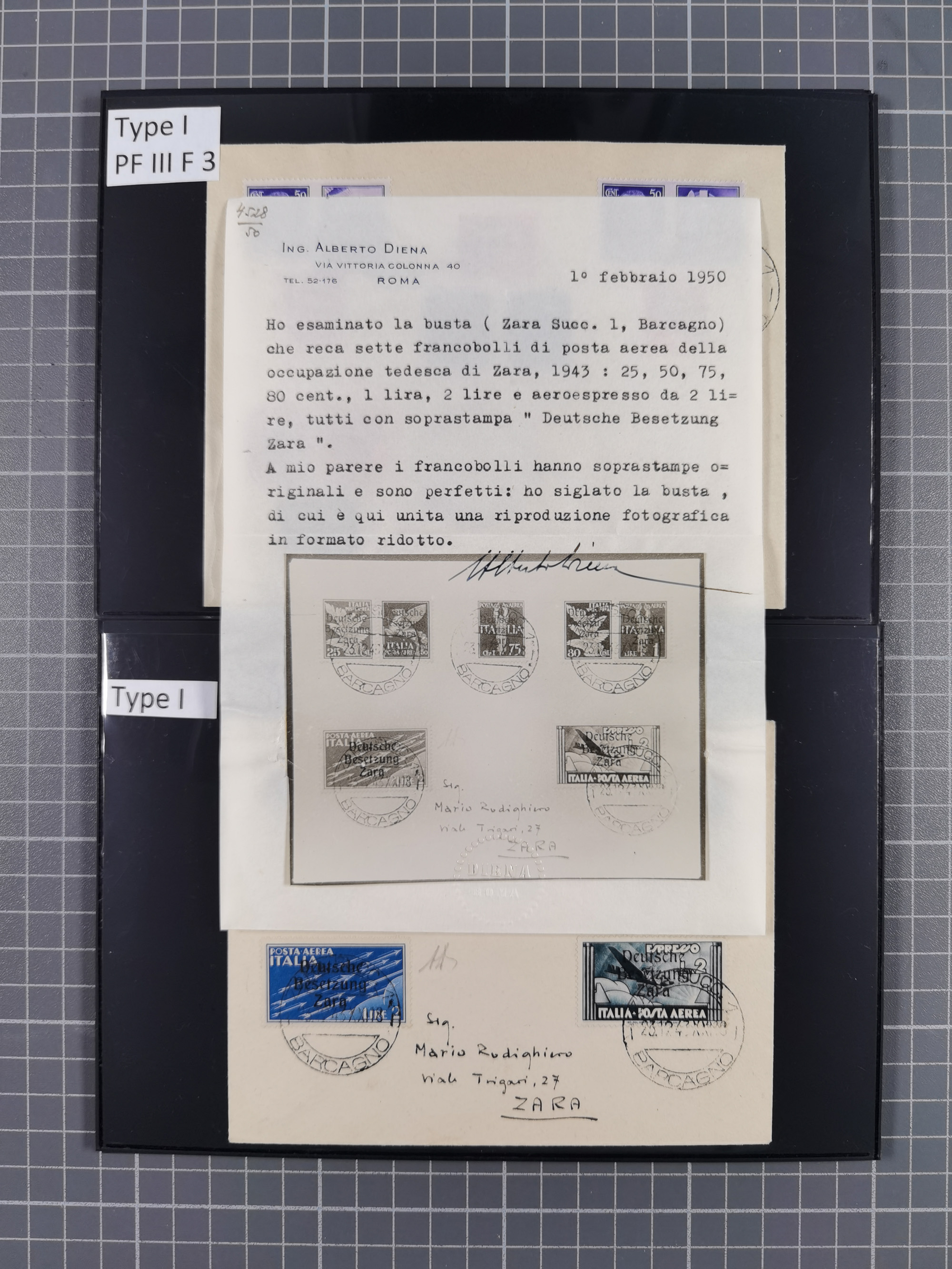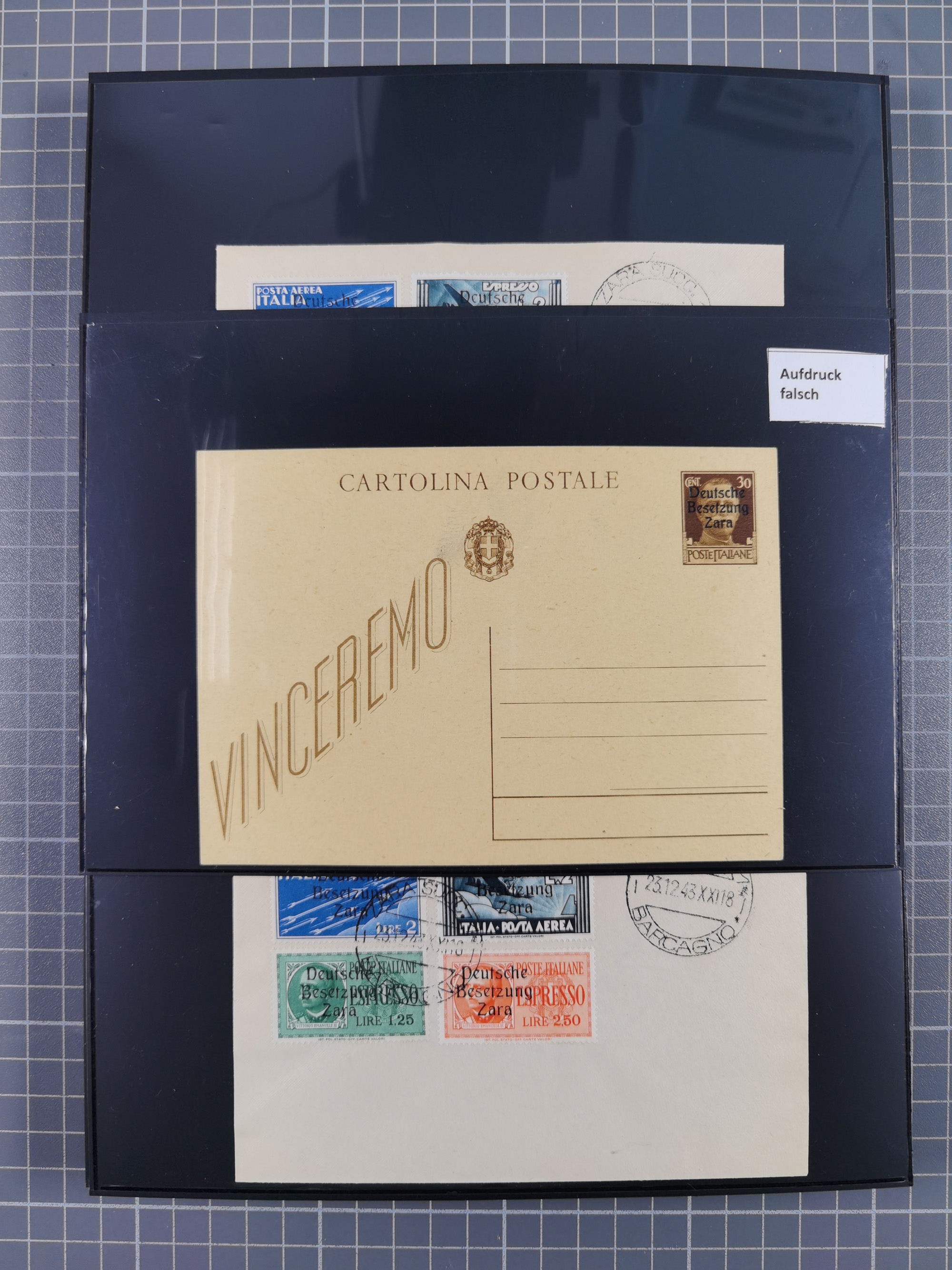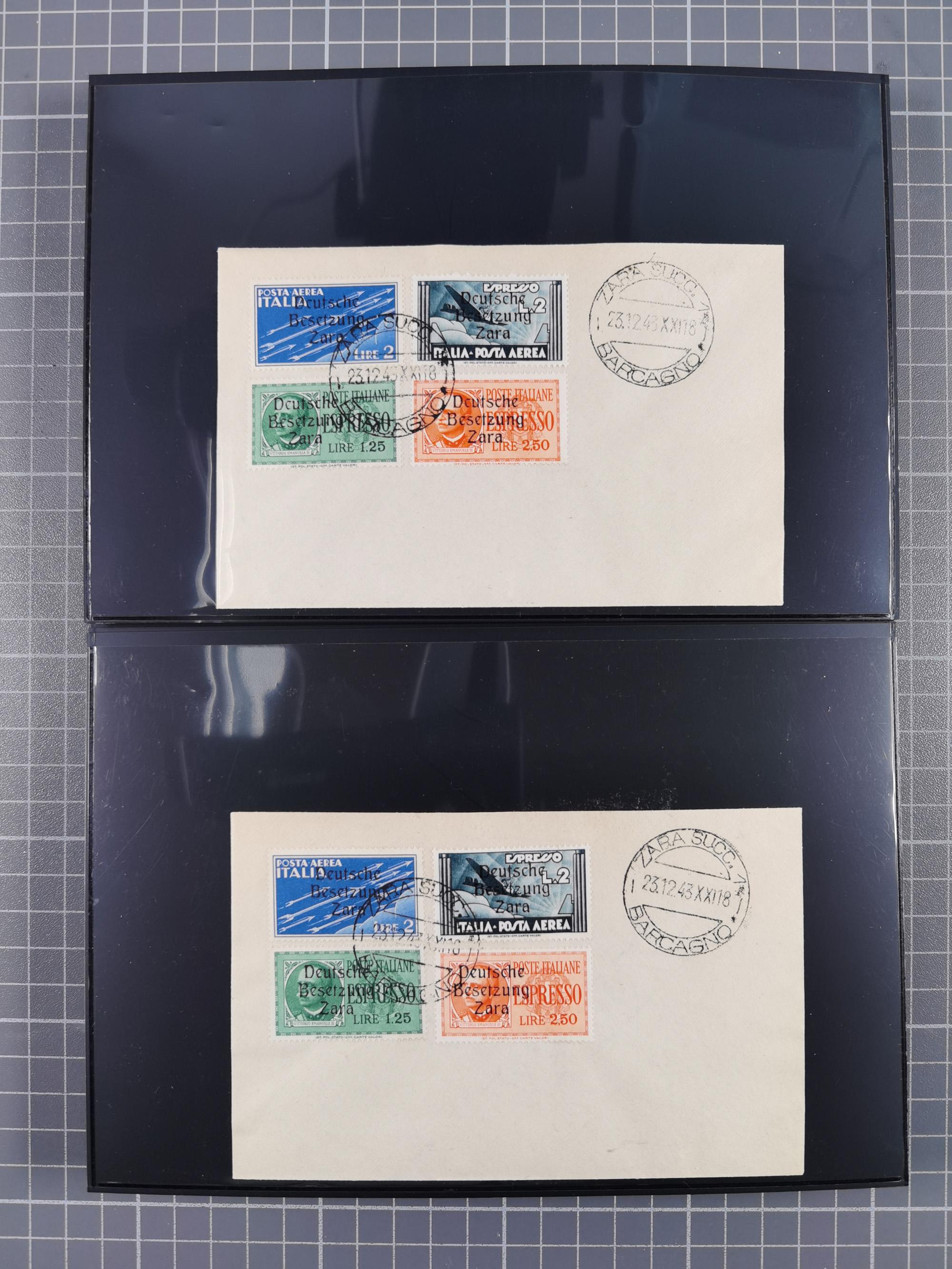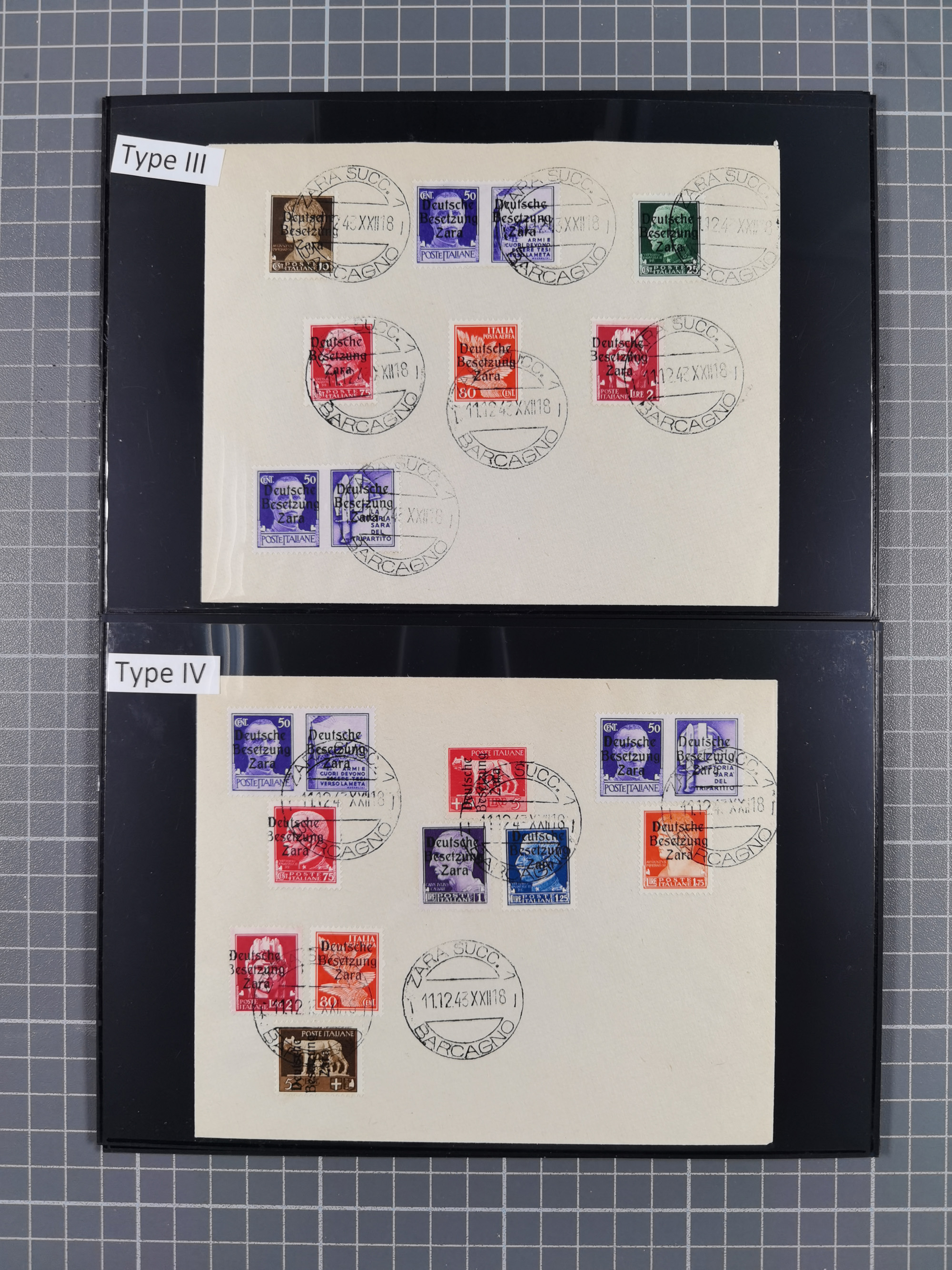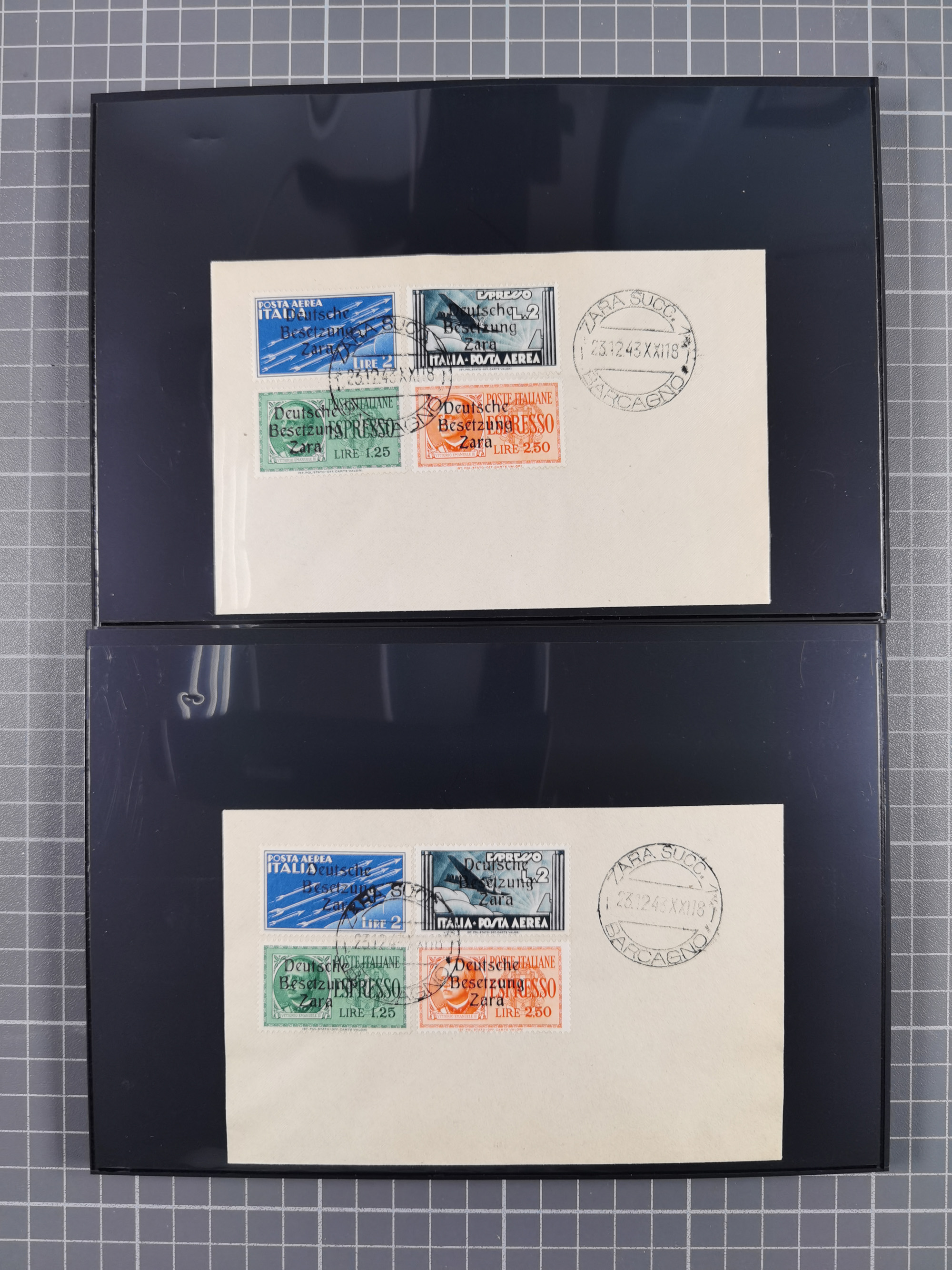 1943, 5 Centesimi - 5 Lire, je sauber mit Stempel “ZARA SUCC. 1 22.10.43” auf Blanko-Umschlag, 5,25 und 50 Centesimi in Aufdrucktype I, sonst Aufdrucktype II, 2 Lire mit linksliegendem Wasserzeichen, 5-10, 25, 40 und 60 Centesimi winzig fleckig, sonst tadellos, sign. Pickenpack sowie Fotoattest Brunel BPP (2010)