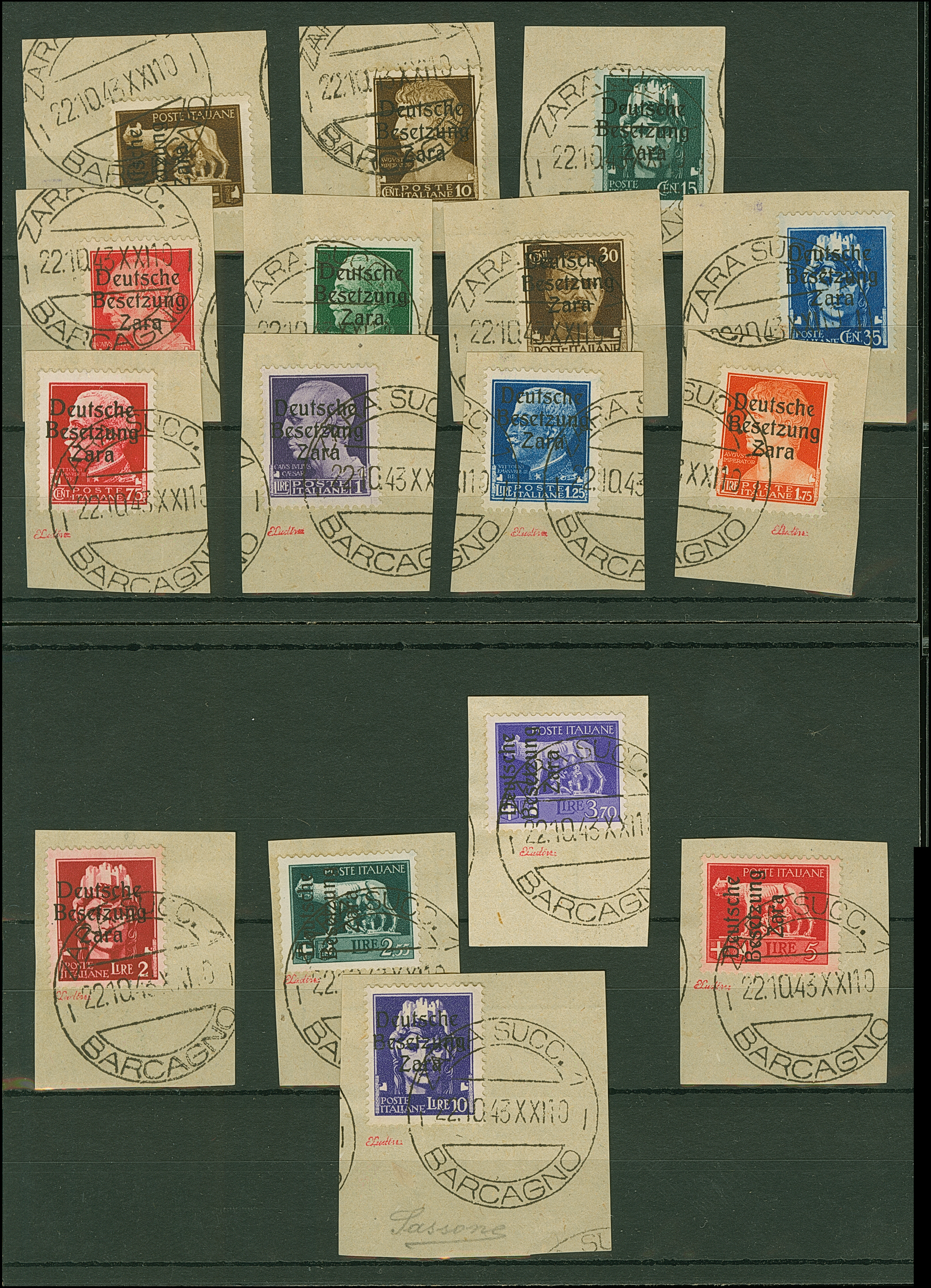 1943, 5 Centisimi - 10 Lire, je farbfrisch und gut gezähnt, sauber mit Stempel “ZARA SUCC. 1 22.10.43” auf Briefstücken, 10 und 75 Centesime mit Aufdruckfehler VIII, 1,75 Lire mit Aufdruckfehler VII, 10 Lire unaufälliger Aufklebeknitter, sonst tadellos, sign. ELudin sowie Fotoattest Brunel (2017)