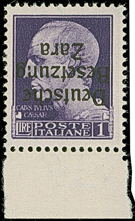 1 Lire schwärzlichgrauviolett, Unterrandstück mit kopfstehendem Aufdruck mit Aufdruckfehler “n in Besetzung diagonal gebrochen”, postfrisch, tadellos, eine sehr seltene Marke mit einer Auflage von lediglich 3 Stück, unsigniert mit Fotoattest Krischke BPP (1992)