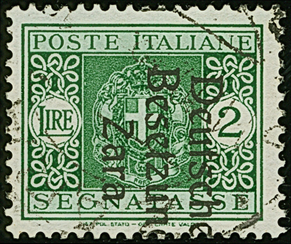 1943, 2 Lire dunkelgrün, Aufdrucktype II, Wasserzeichen rechtsliegend, farbfrisch und gut gezähnt, sauber gestempelt, tadellos, eine seltene Marke, u.a. sign. Ludin BPP mit Fotoattest (1981) und Fotoattest Krischke (2010)