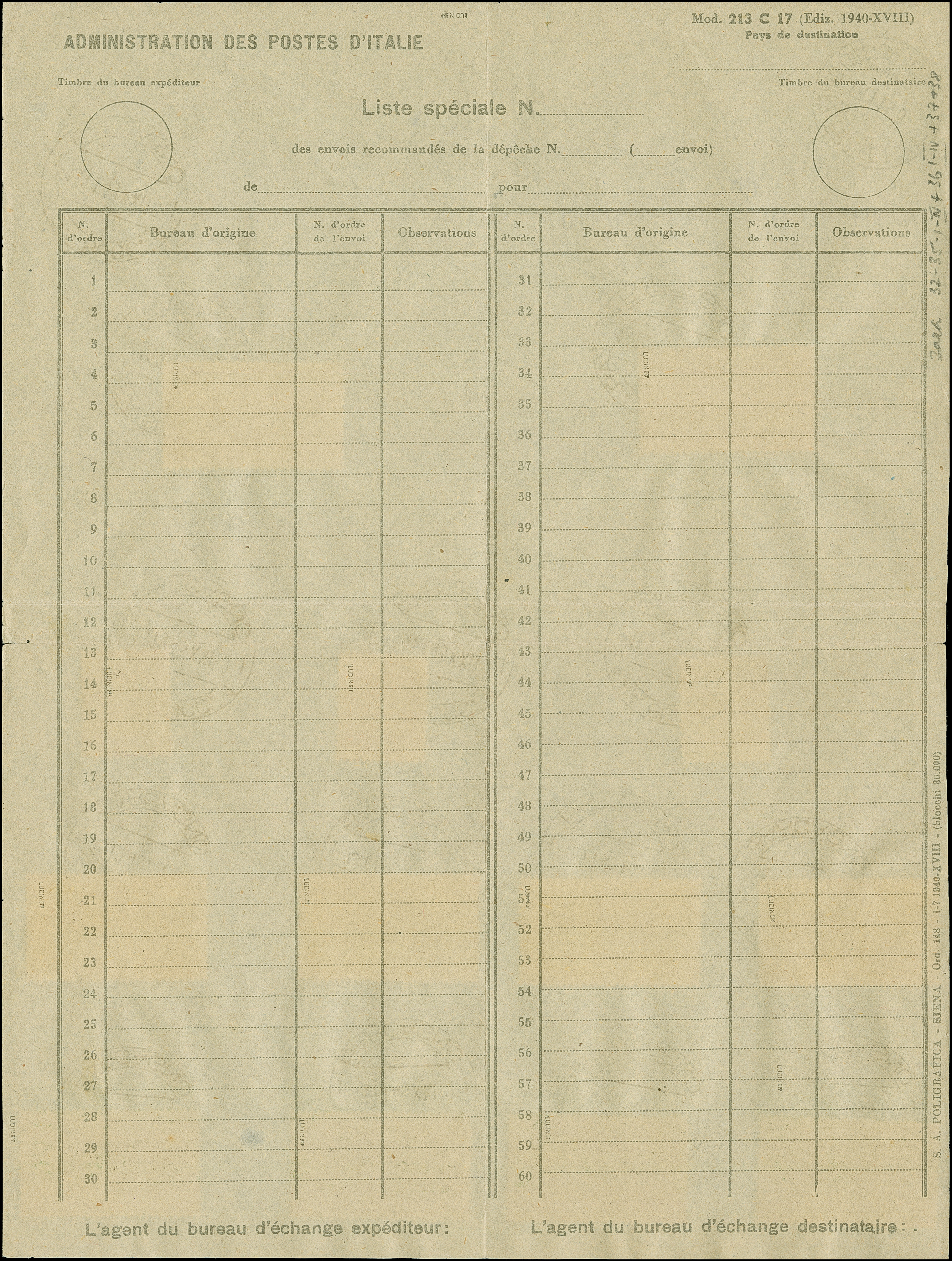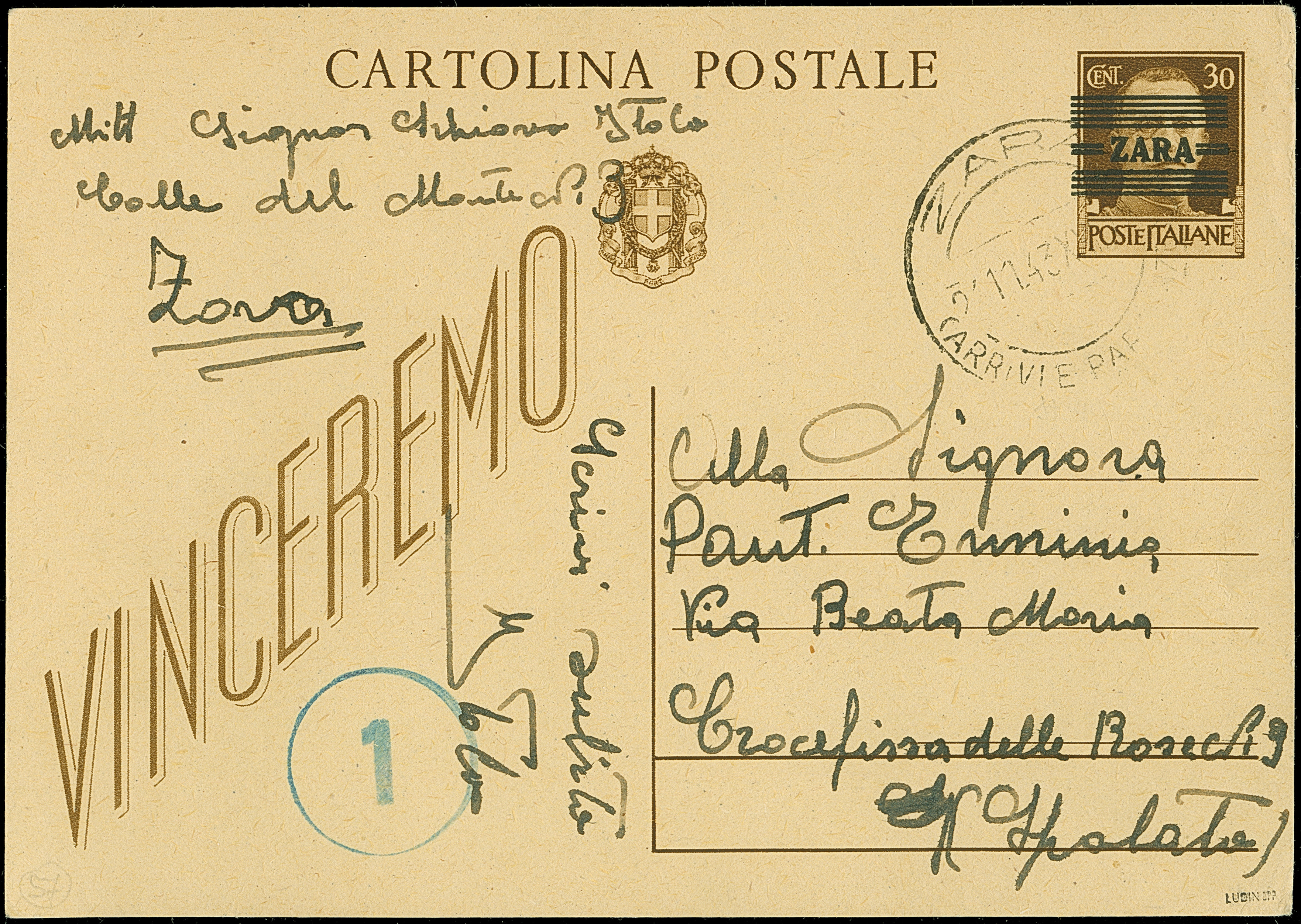 Propaganda-Marken 25 und 30 Centesimi komplett mit Eilmarken zu 1,25 L. und 2,50 L. und Freimarken 50 Centesimi - 1,25 Lire, sauber mit Stempel "ZARA SUCC 1 - BARCAGNO 13.11.43" auf unbenutzem italienischem Postformular, unten mit blauem Zweizeiler "DIREZIONE PROV. POST-TELEGRAFI ZARA" und Unterschrift des Postbeamten E. del Conte, zwischen den Marken teils gefaltet, sonst tadellos