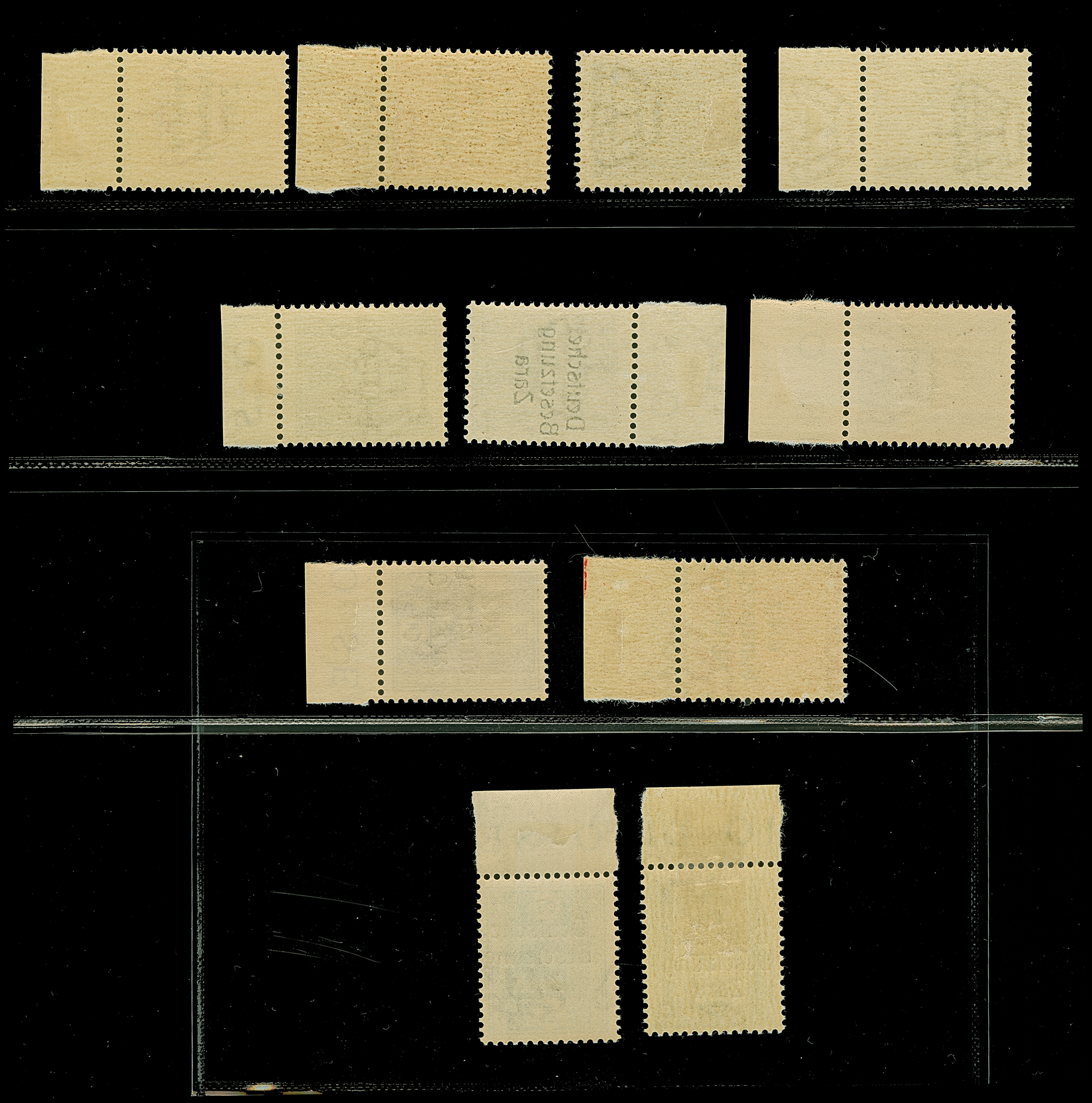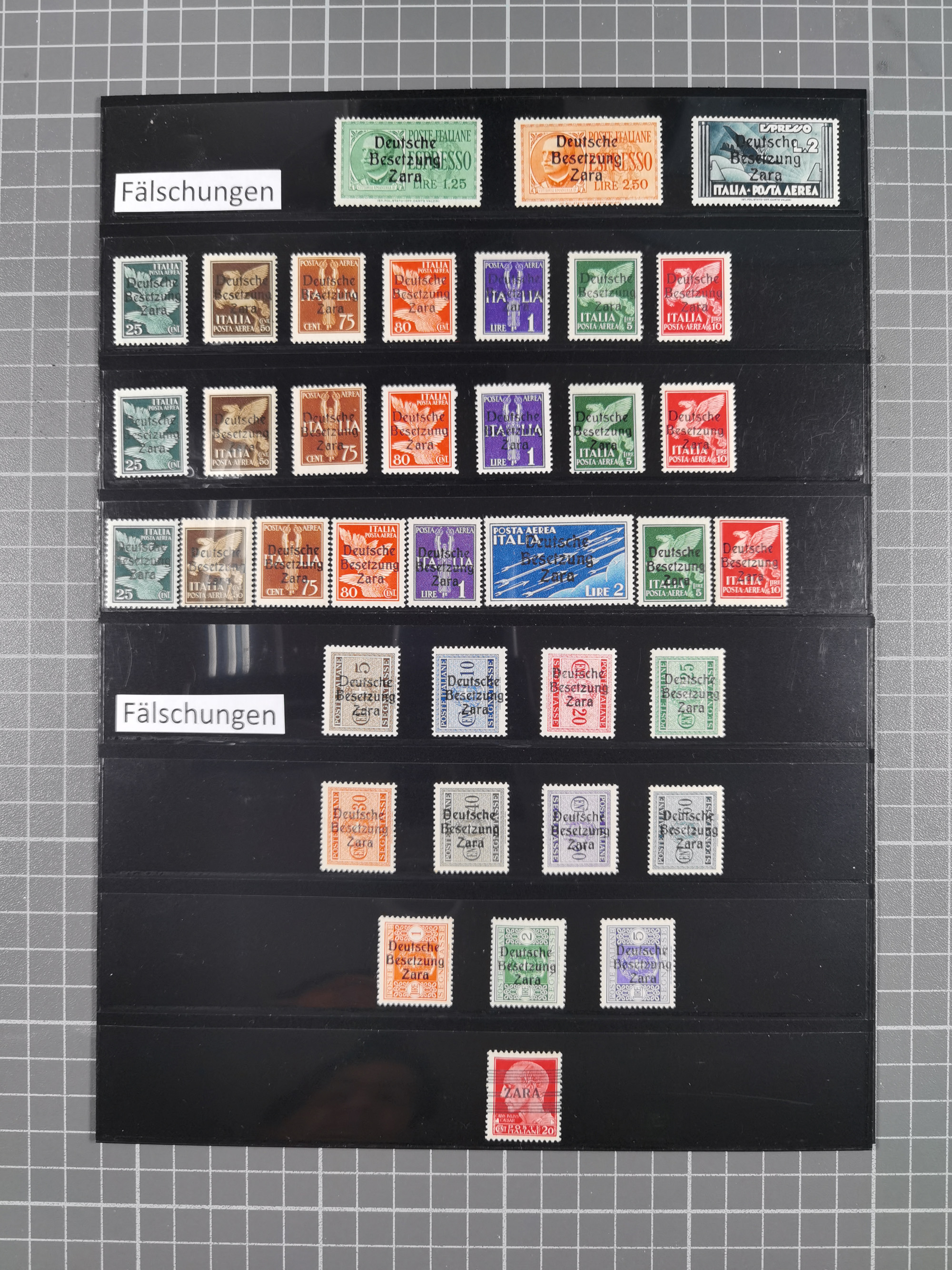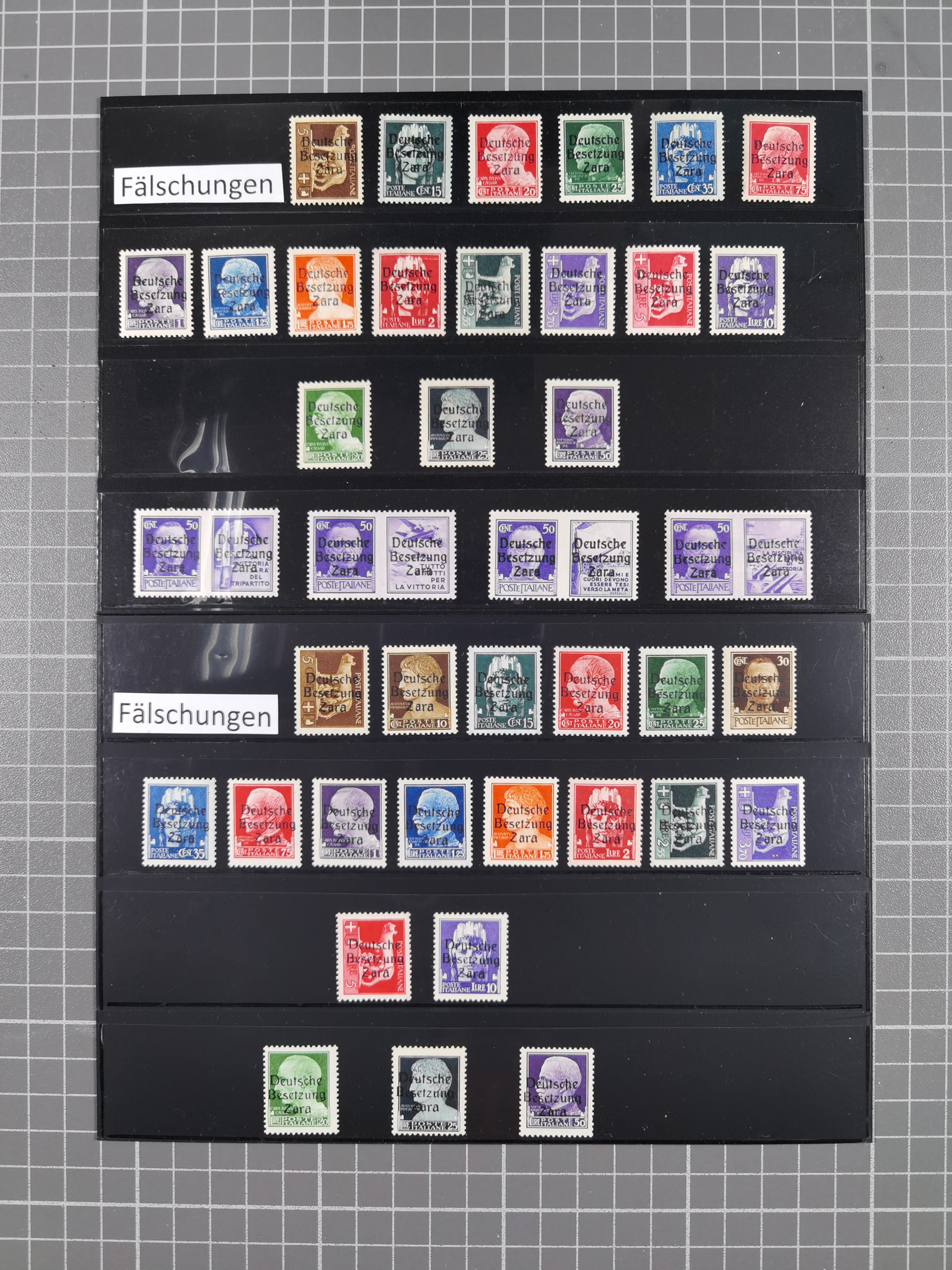 1943, Fälschungssammlung, postfrisch sowie auf Blanko-Umschlägen, dabei 19 mal Mi.-Nr. 21-22 und 28,32 je auf Blanko-Umschlag mit falschem Stempel, die falsch gestempelten Werte oft mit echten Aufdrucken, sauber auf insgesamt 31 großen Steckkarten, dabei einige alte Diena Atteste