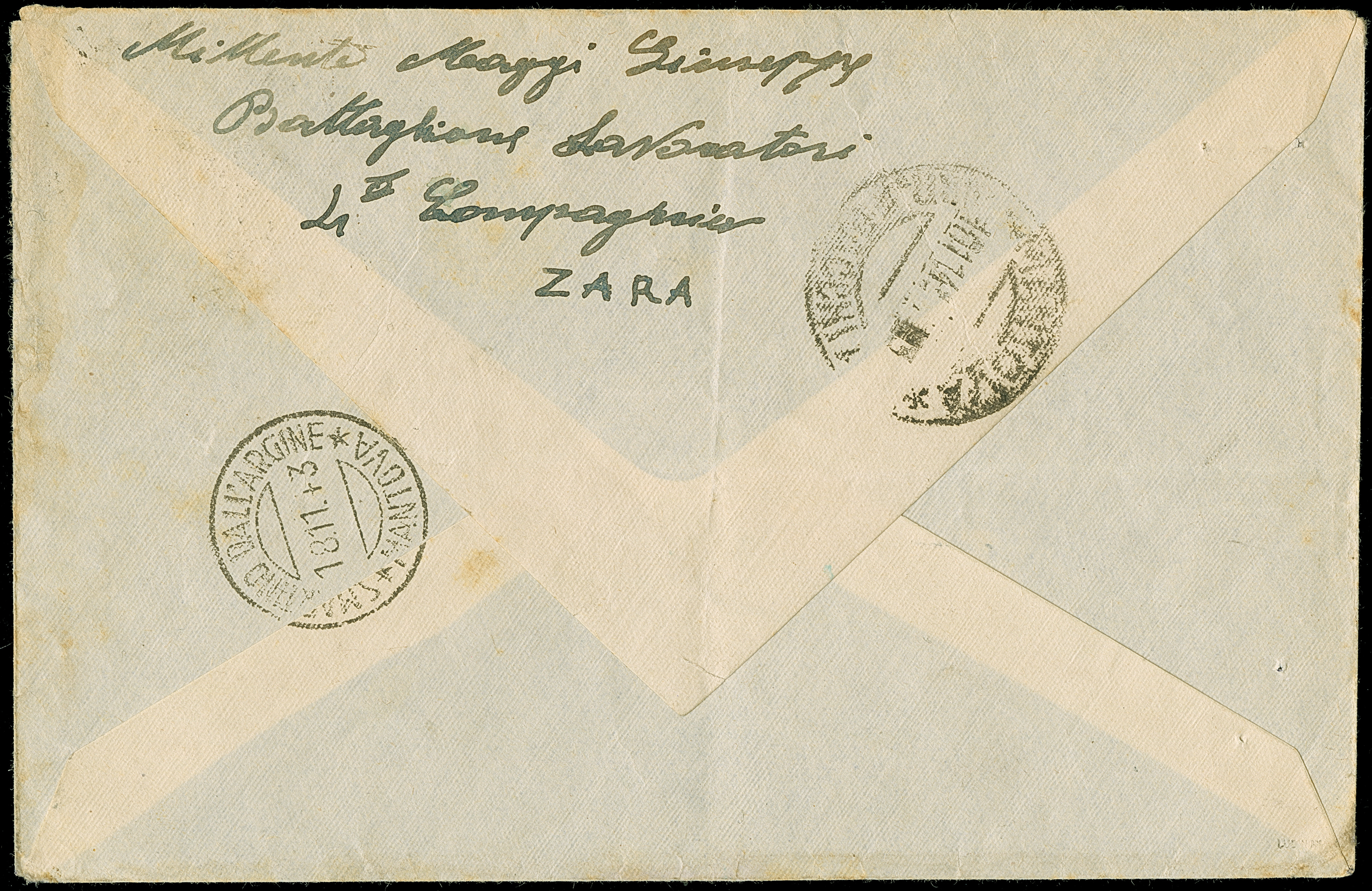 1943, Eilmarke 1,25 Lire und 50 Centesimi, sauber mit auf- und nebengesetztem Stempel “ZARA ARRIVE E PARTENZE 15 11 43” auf Brief nach S. Martino Dall'Argine in der Provinz Mantua mit Ankunftsstempel, rückseitig mit Absendervermerk “Maggi Giuseppe, Battaglione Lavoratori (=Arbeiterbataillon) 1. Campagnia”, etwas fleckig und die Marken durch Randklebung etwas bestoßen, ein insgesamt sehr attraktiver und seltener Zara-Bedarfsbrief