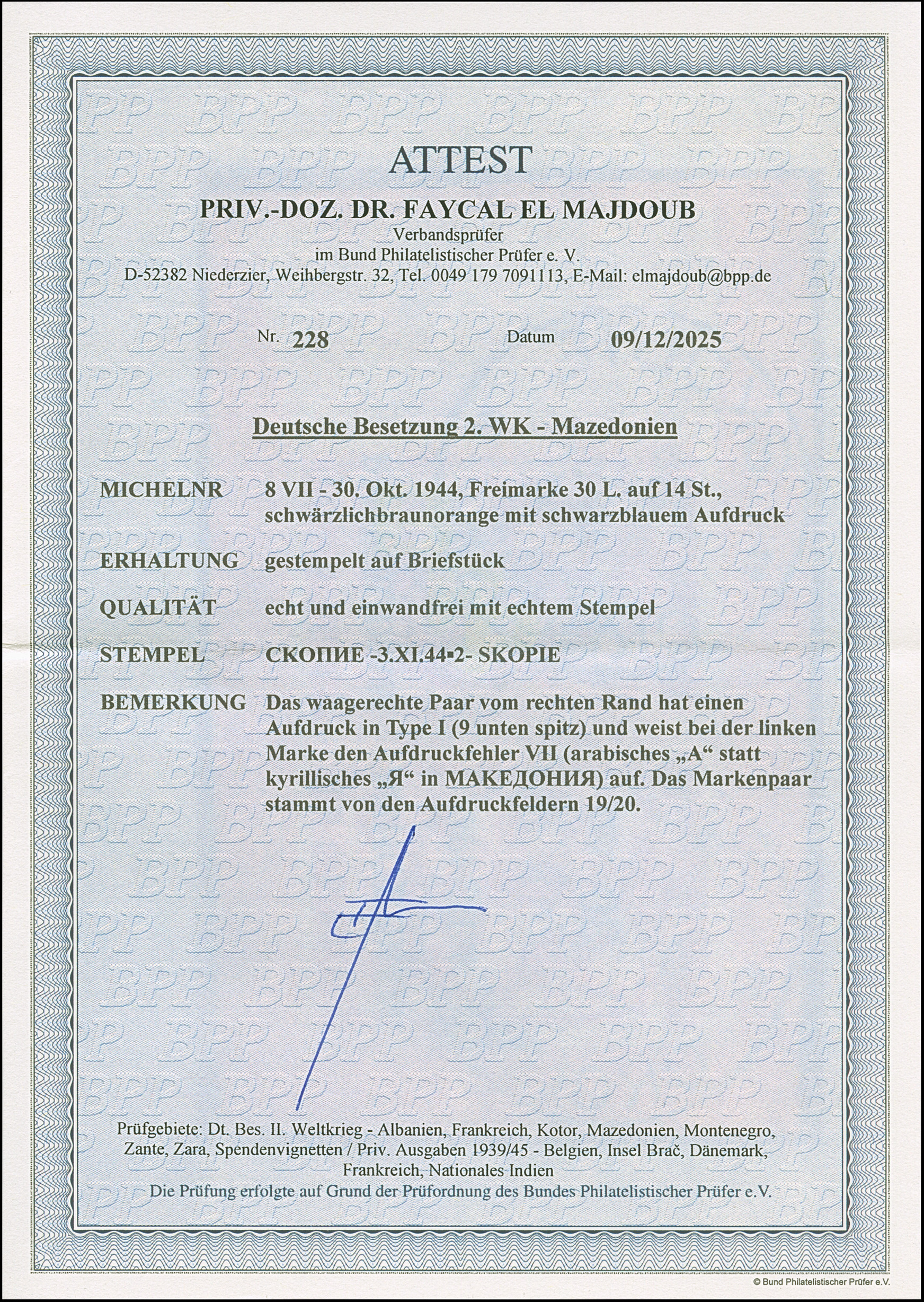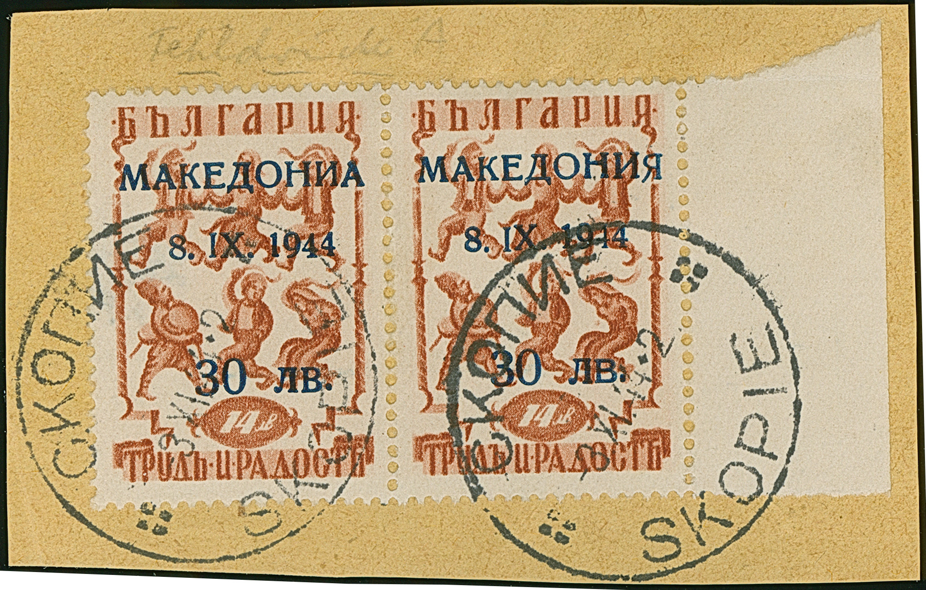 30 L. auf 14 St. mit Aufdruck in Type I und Aufdruckfehler “arabisches A statt kyrillisches R im Wort ”MAKEDONIA" (Feld 19) im waagerechten Randpaar mit Normalmarke, je mit klarem Stempel “SKOPIE 3.XI.44” auf Briefstück, in einwandfreier Erhaltung, Fotoattest Dr. El Majdoub BPP (2025)