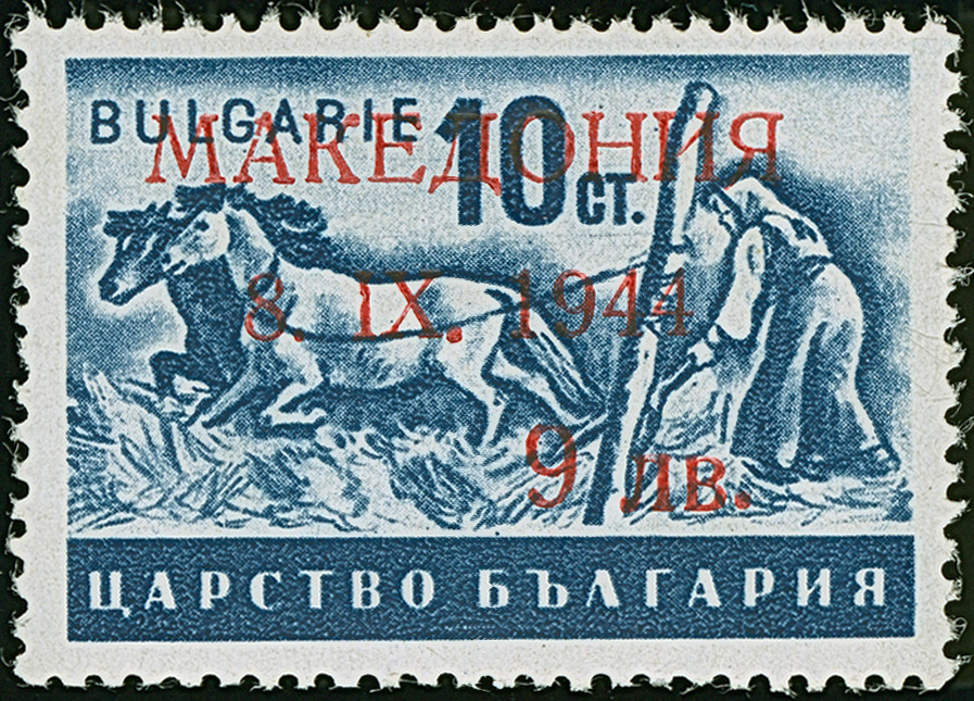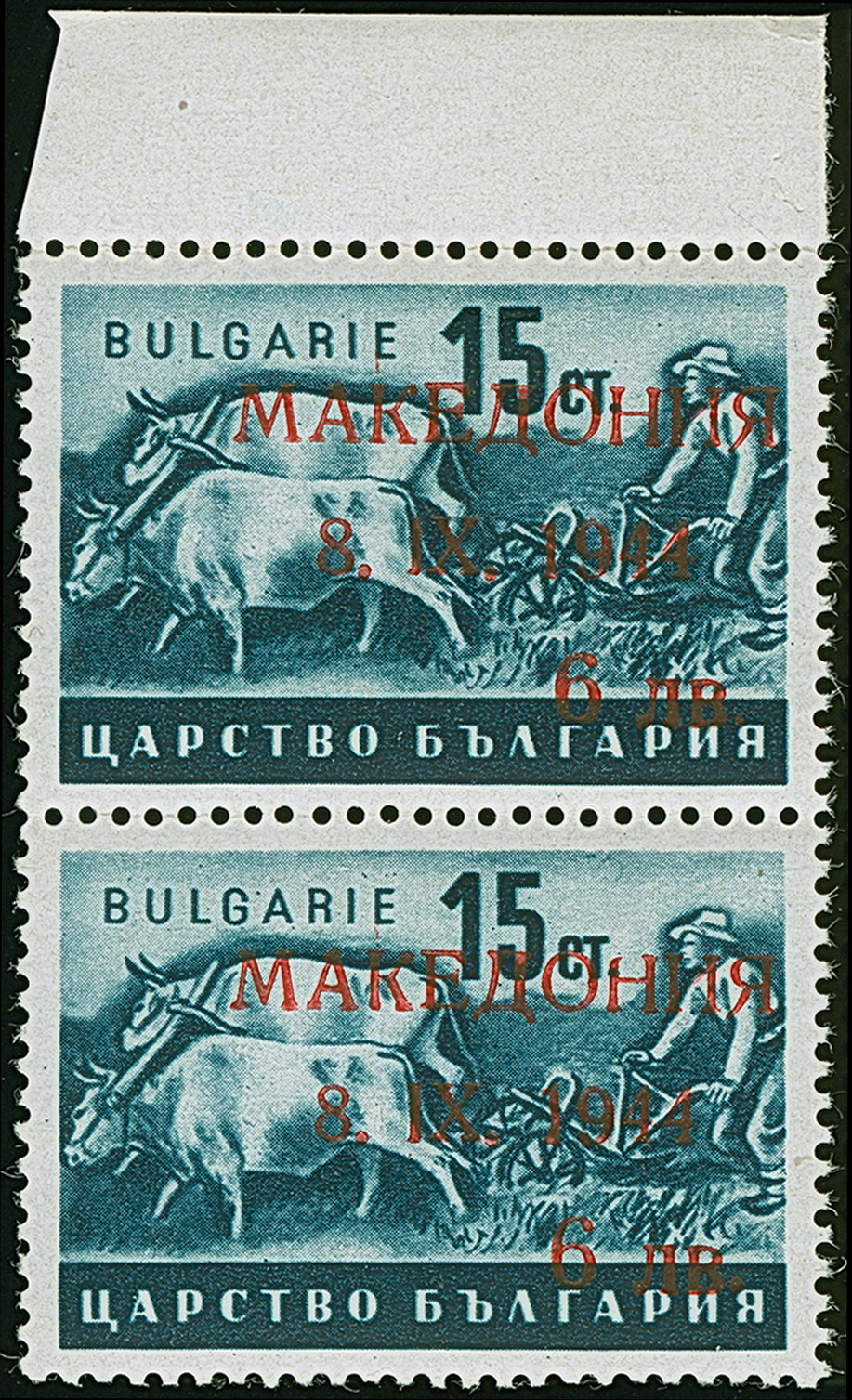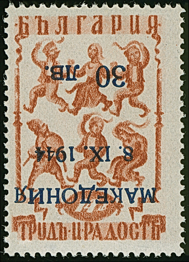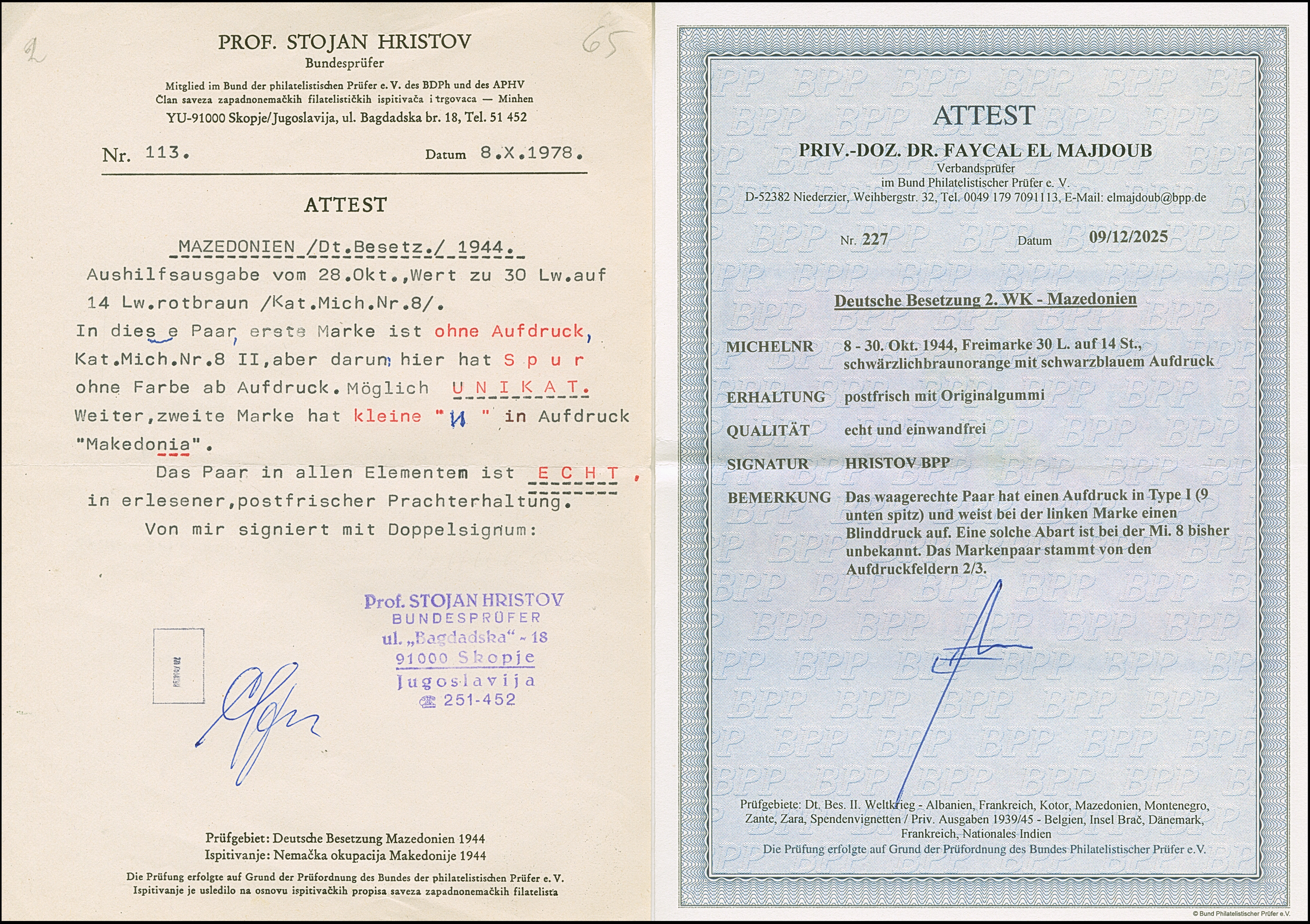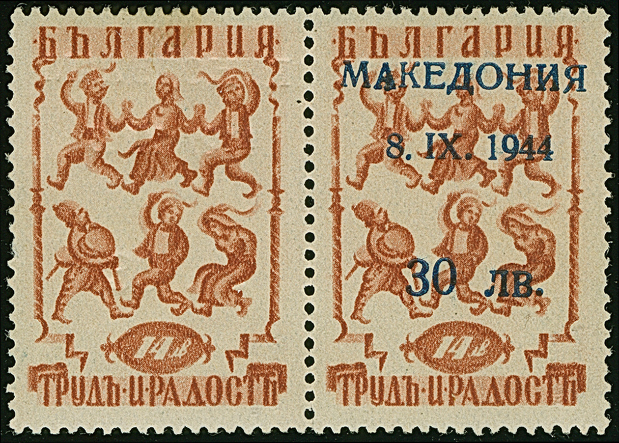 30 L. auf 14 St. mit Aufdruck in Type I im waagerechten Paar, dabei linke Marke mit Aufdruck-Abart “Blinddruck” (Feld 2), postfrisch und in tadelloser Erhaltung, Eine außergewöhnliche seltene Aufdruck-Abart die bisher unbekannt war, doppelt signiert Hristov mit Attest (1978 und Fotoattest Dr. El Majdoub BPP (2025)